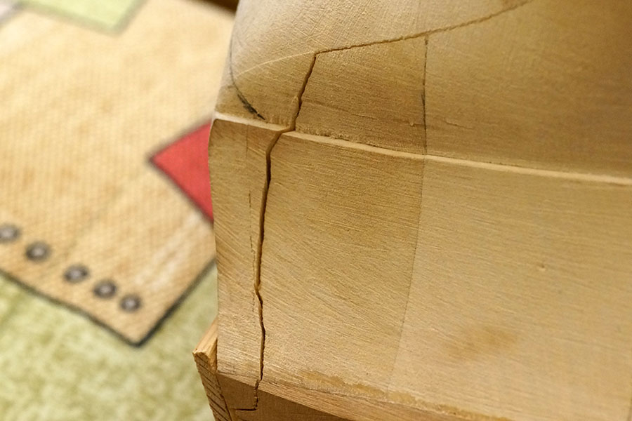 Предыдущий владелец корпуса пытался защитить его и закрепил вдоль бортов на саморезы сосновые планки. Но этого было недостаточно и не спасло корпус от деформаций и трещин. Зафиксирую текущие дефекты.