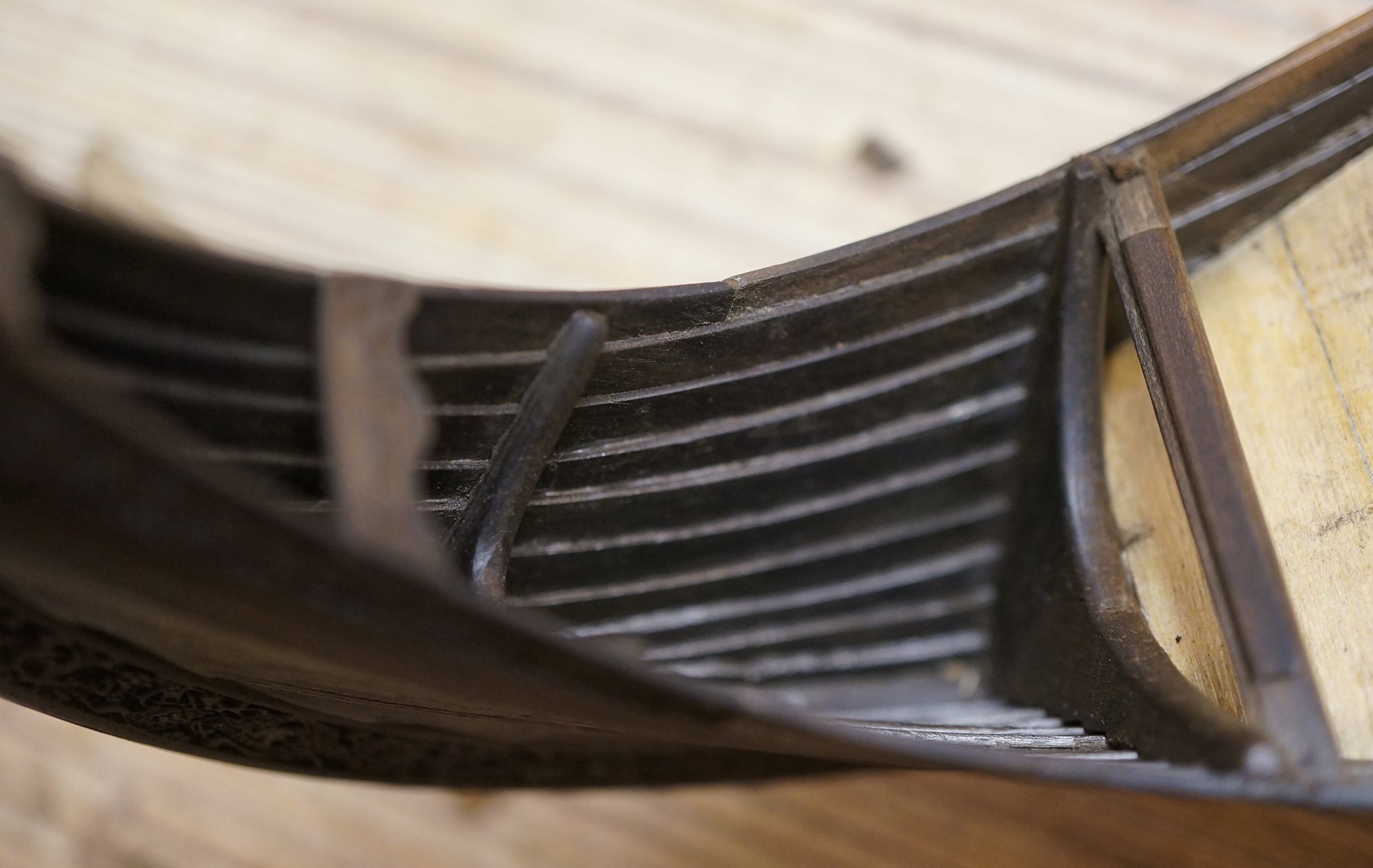 Сейчас модель обшита до 10-го пояса (уровень палубы), всего поясов будет 12. Резьбу делал Сергей Борисович на ЧПУ.