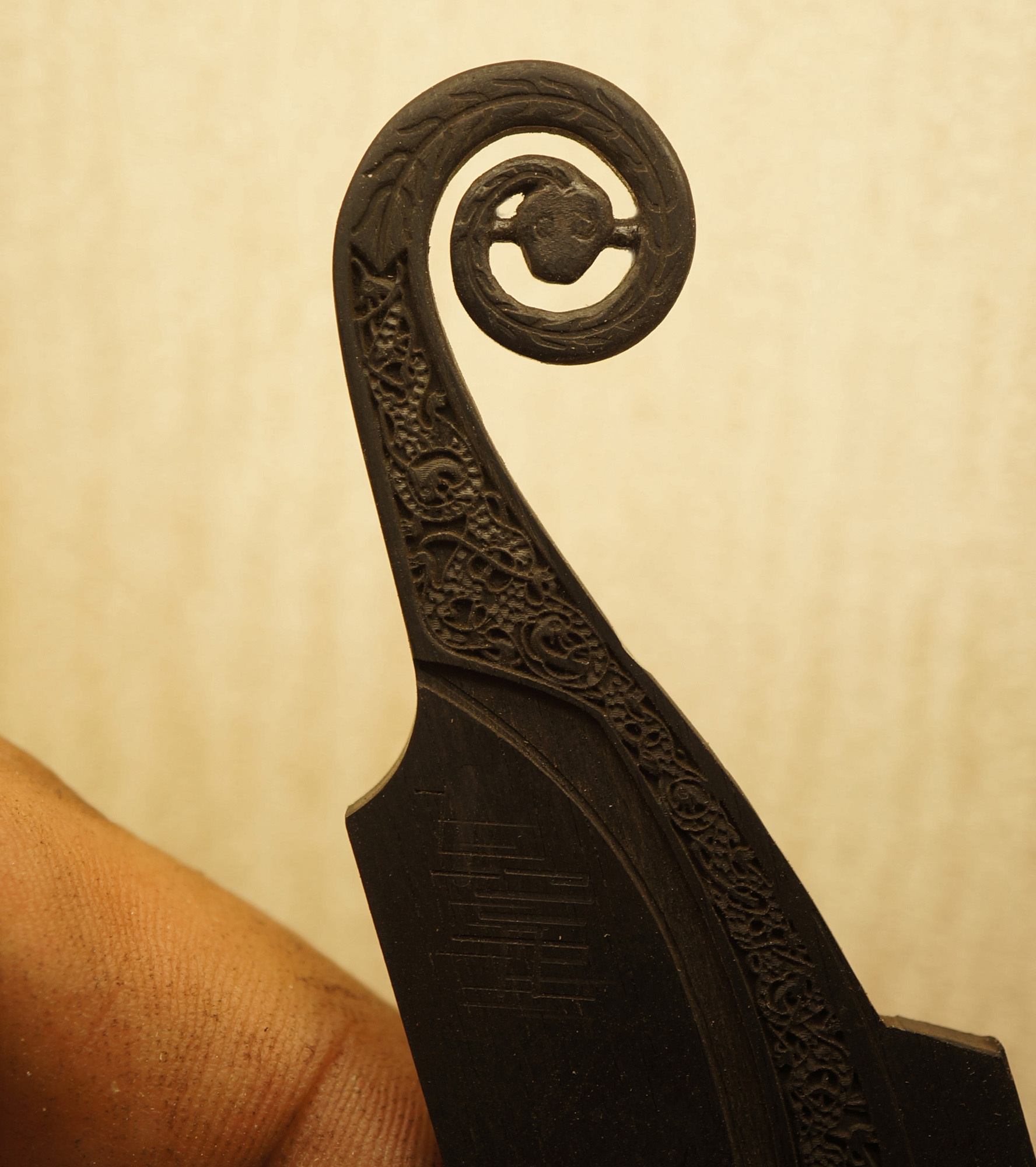 Ну и деталь не выходит из под станка в готовом виде, взял да приклеил. Например штевни, фрезер наносит узор на плоскости с двух сторон , потом в верхней части выпиливается глубокий паз , куда вставляется клиновидная пластинка с направлением волокон на 90 гр . Когда все это клеится и зажимается, сверху получается зауживание штевня, а внутри спиральной части трехслойная "фанера". Это нужно для того, что во время выпиливания по контуру не сломалась деталь, что очень вероятно из цельного куска при одинаковом направлении волокон. А потом на торце продолжается резьба. (см. фото в обратном порядке). Так что это не промышленное изготовление да и ручной работы на штевнях не меньше.