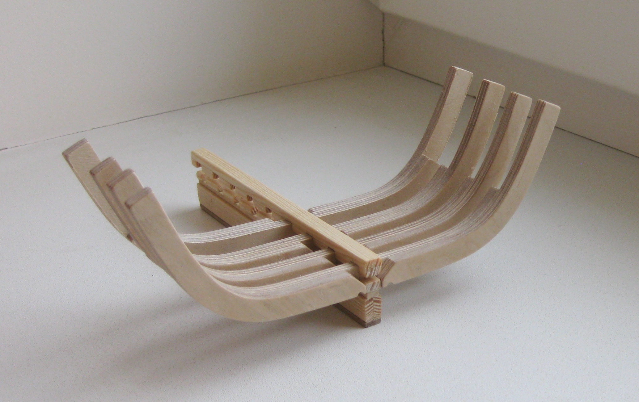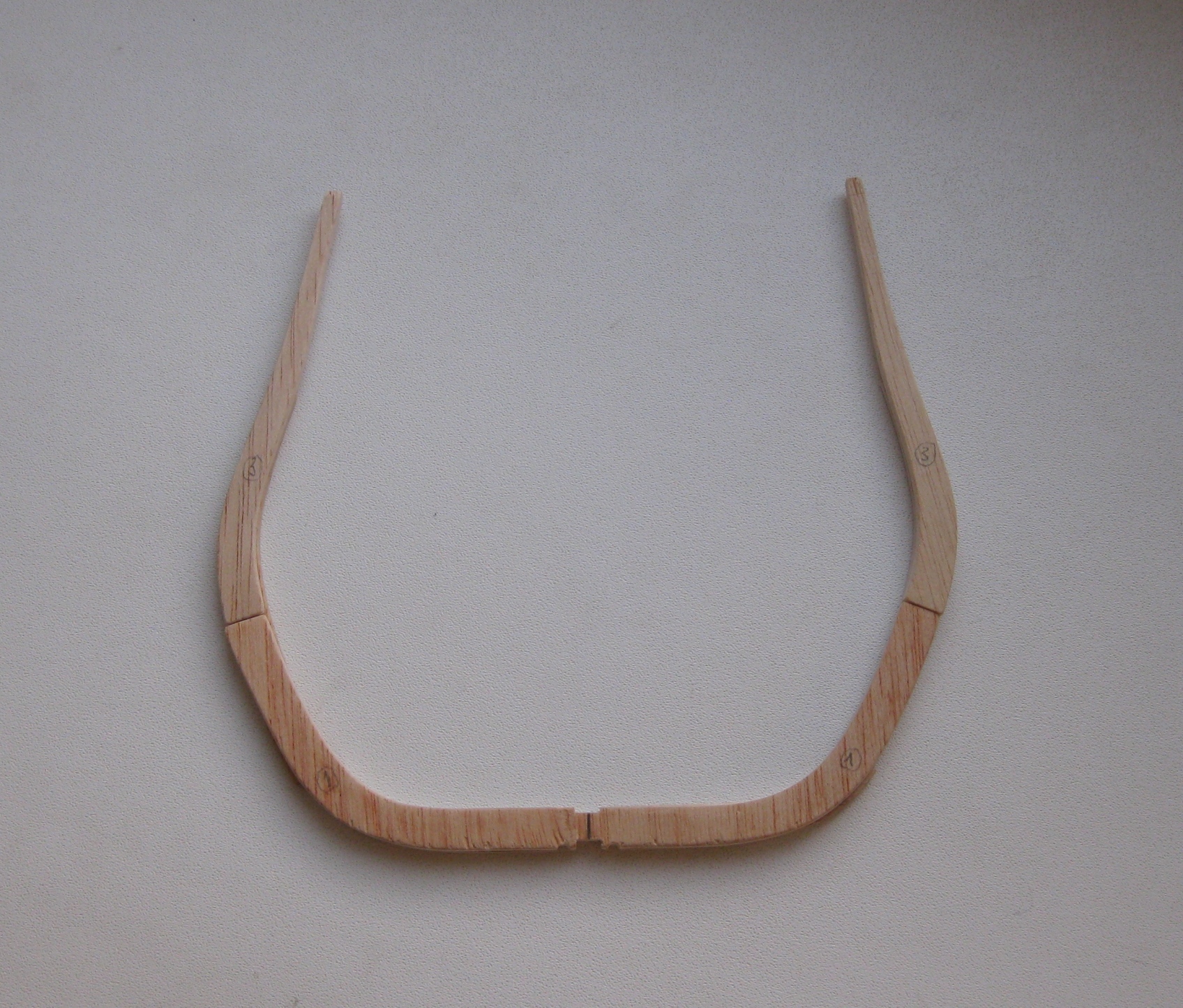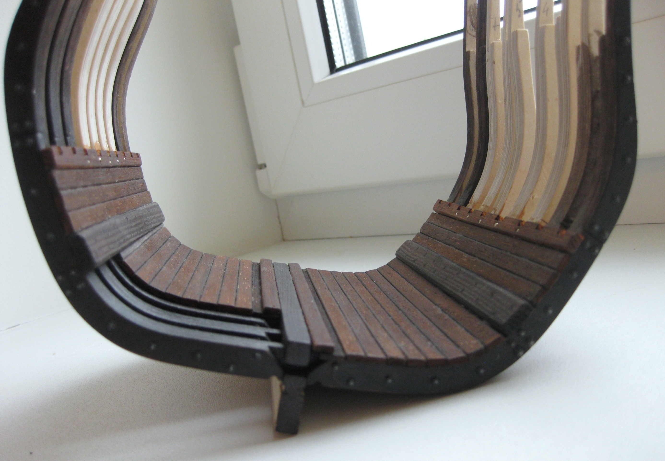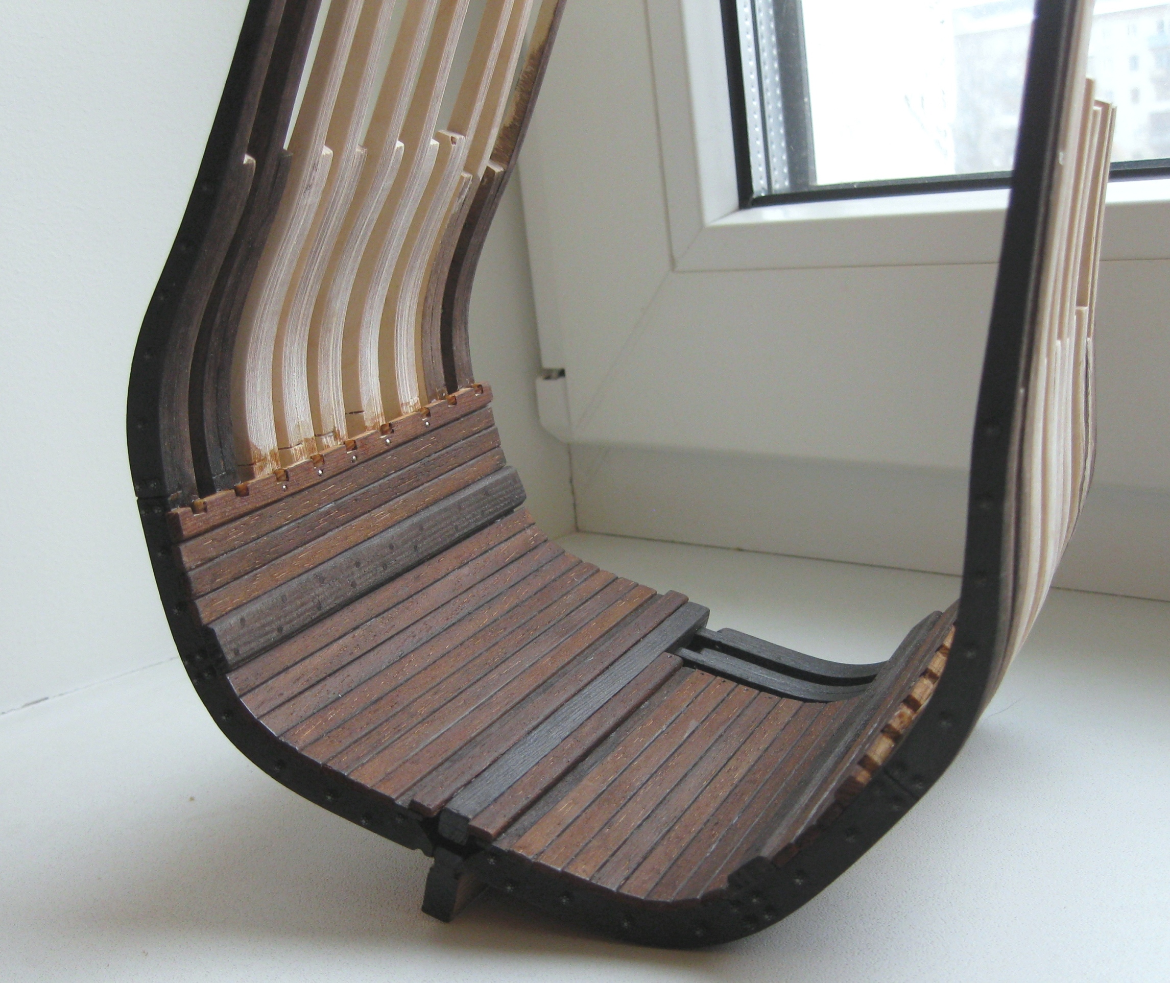 Далее было следующее. По ходу работ решено внутренюю обшивку делать слегка выступающей за торцы крайних шпангоутов и наружнюю выступающей поболее. Есть такой дизайнерский прием - для придания большей динамики и объемности предмета.