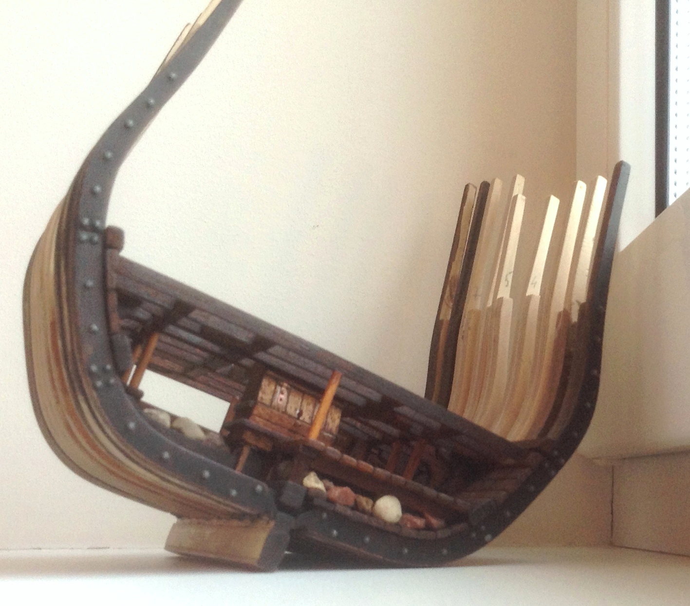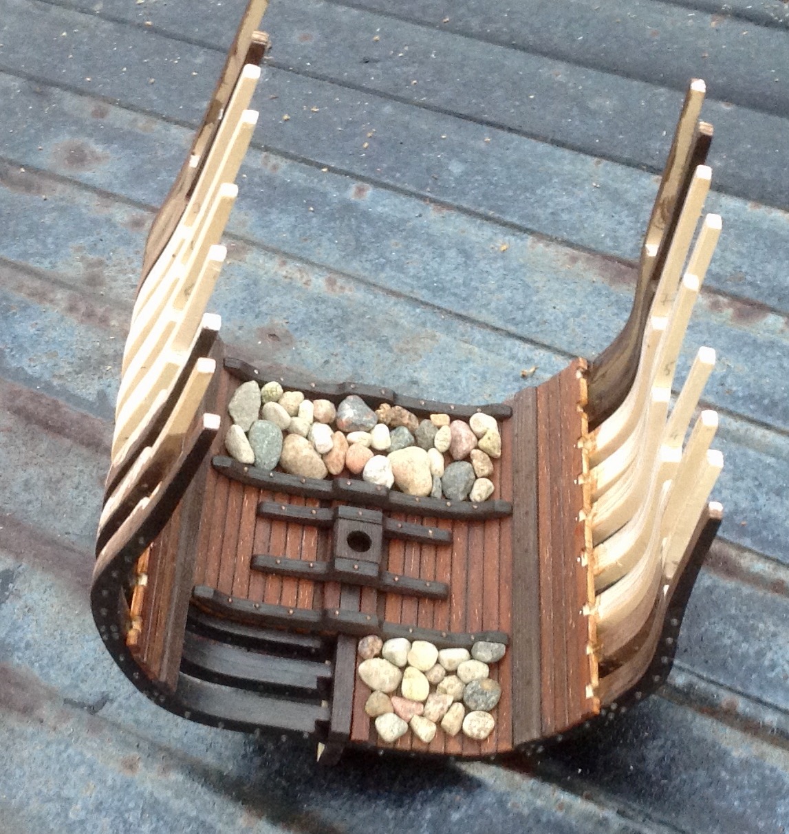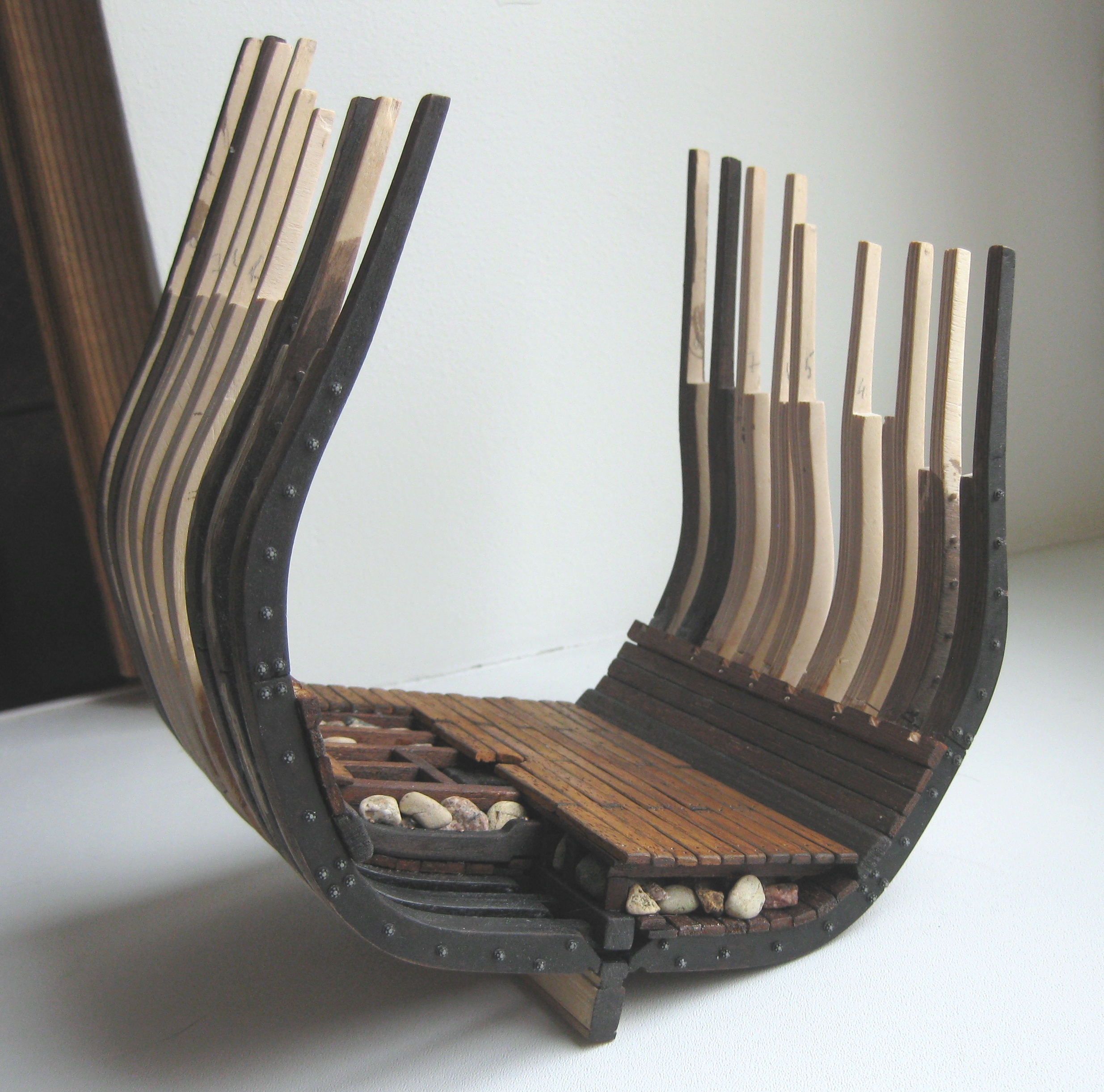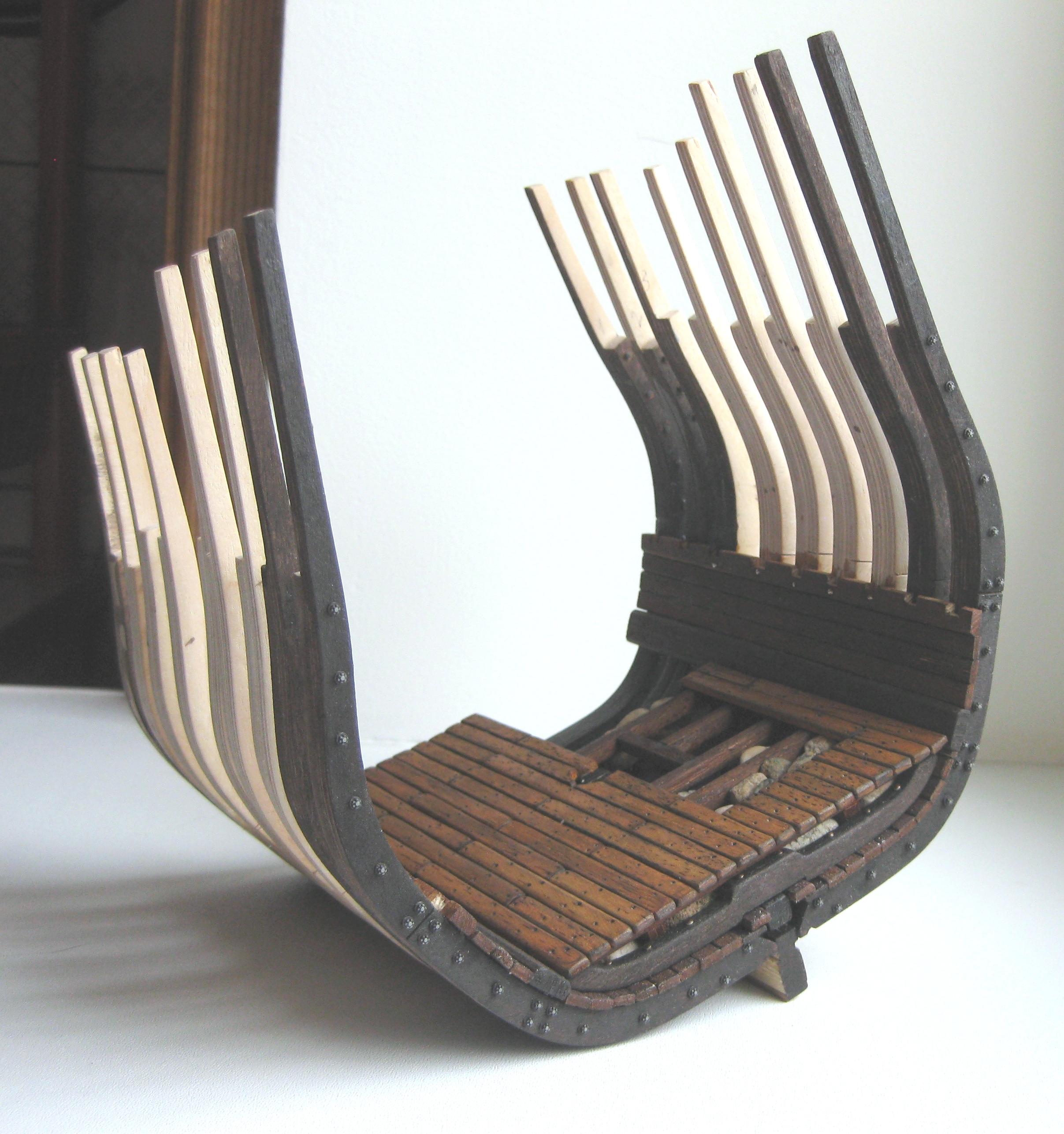 Далее было следующее. По ходу работ решено внутренюю обшивку делать слегка выступающей за торцы крайних шпангоутов и наружнюю выступающей поболее. Есть такой дизайнерский прием - для придания большей динамики и объемности предмета.
