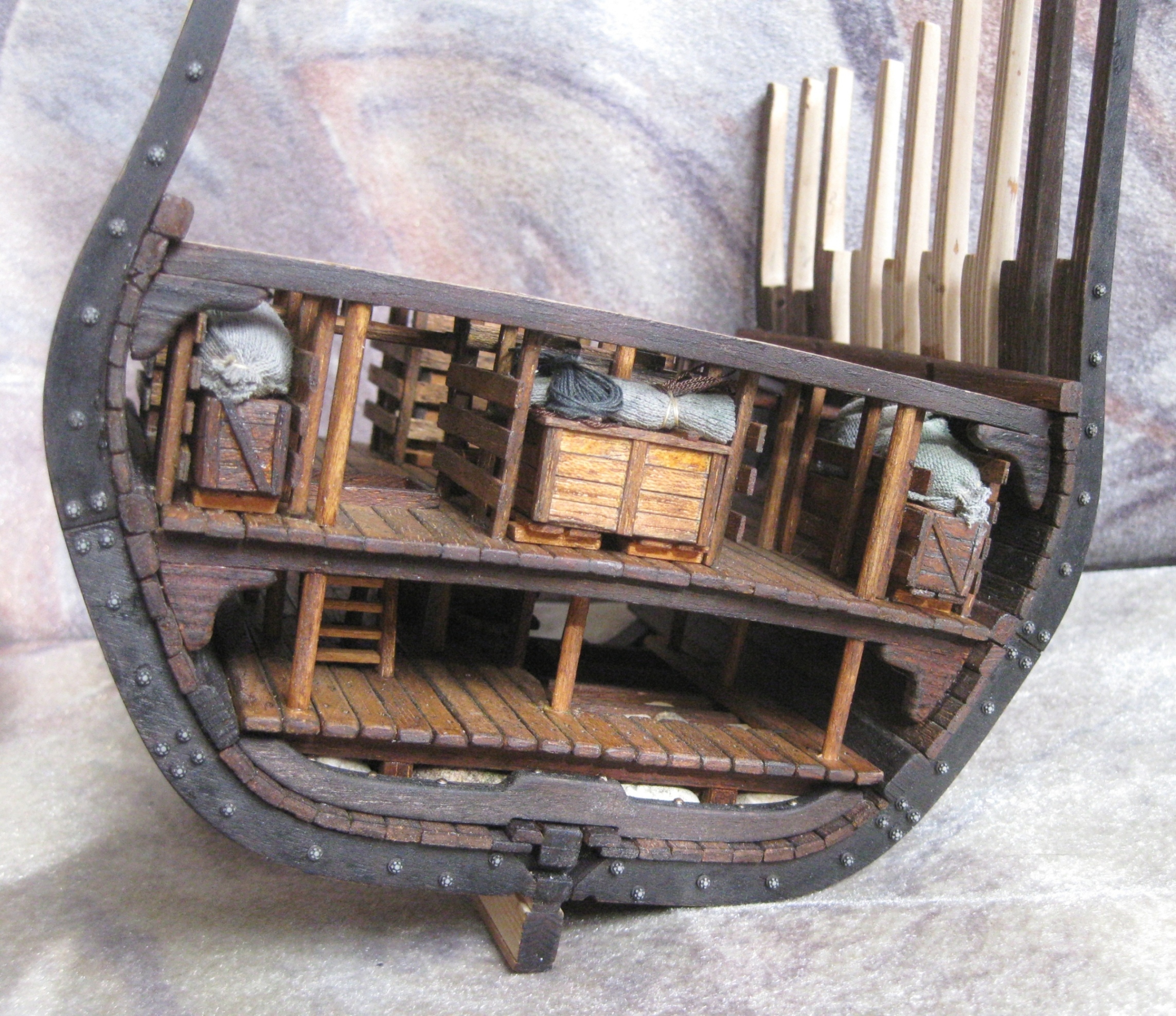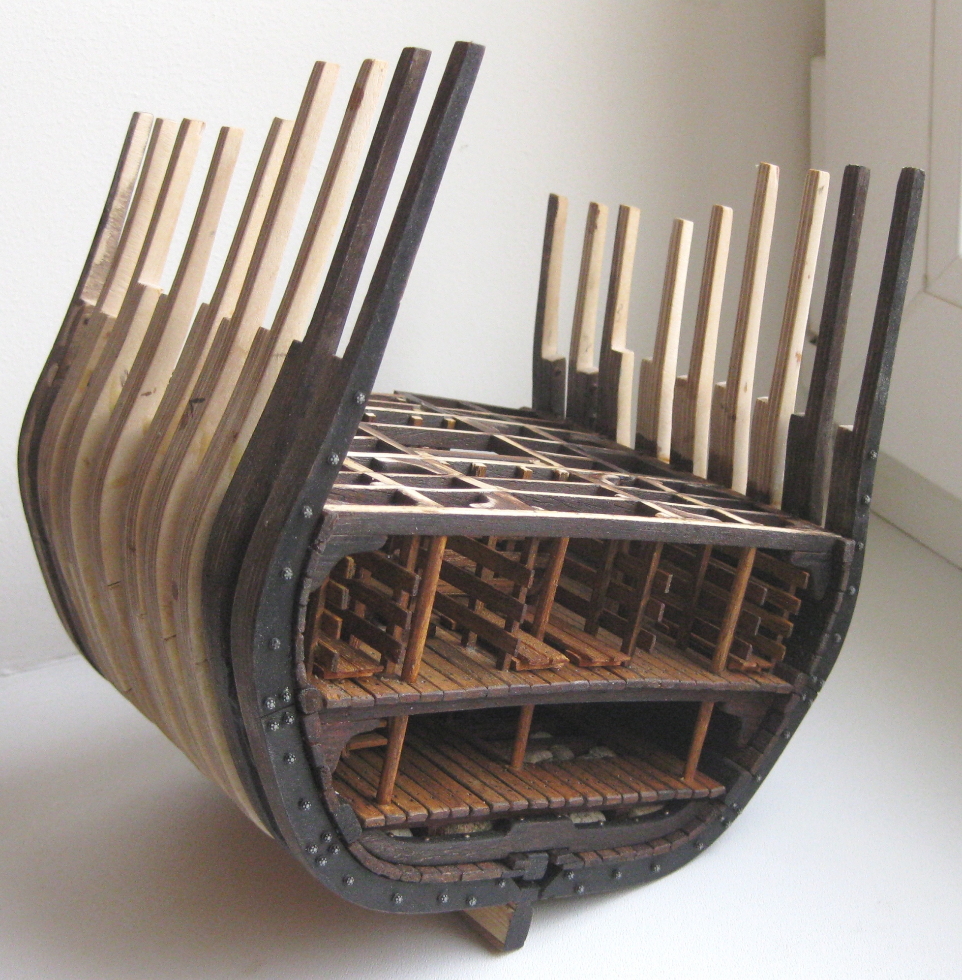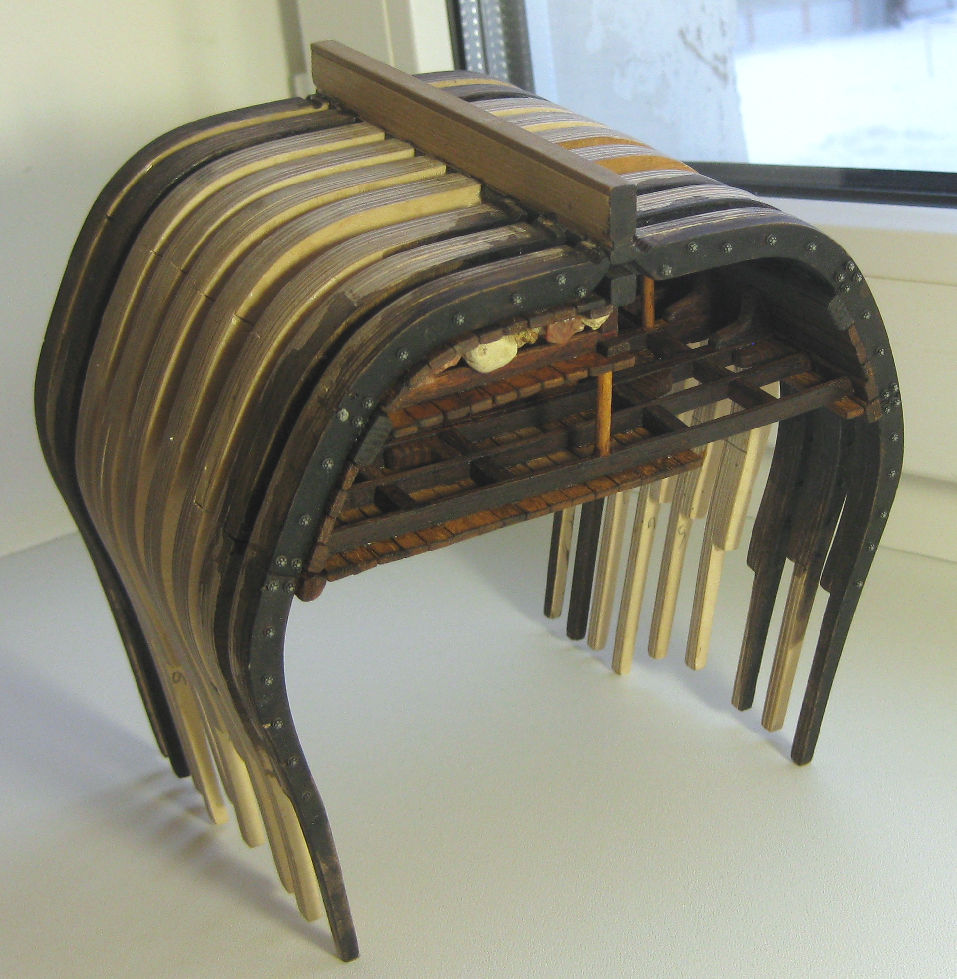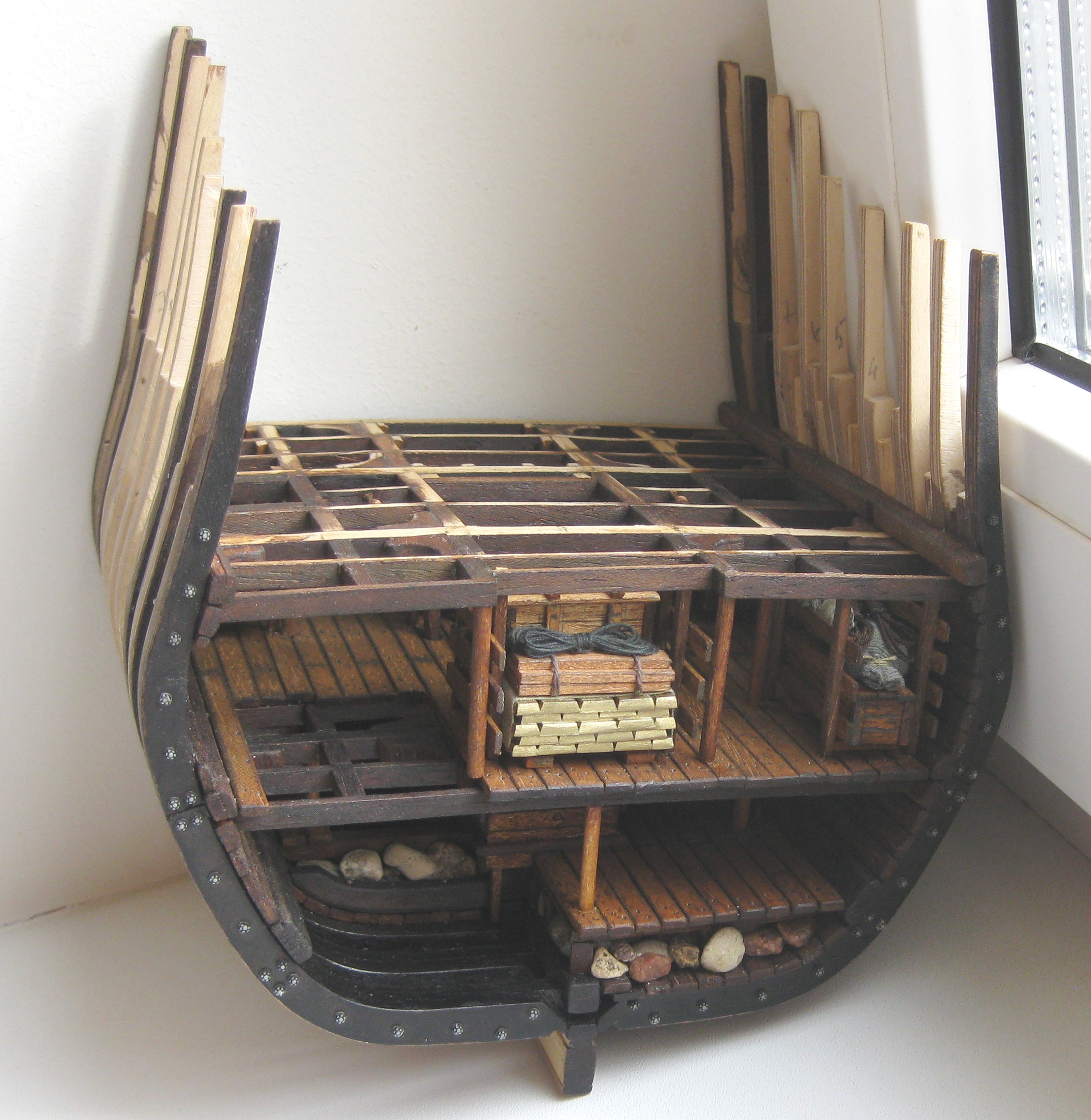 Пару слов к следующему этапу. Начинка тех объемов, которые были сделаны. Перерыто было много. Конкретики в общем особо никакой. На моделях ситуация аналогична. Пришлось делать по неким законам логики и использования пространства. Единственное, что у Лэвэри было упоминание о *плотницких дорожках*(*carpenter*s way*). Было одно и изображение примерно тех годов. Изначально ориентировался на 1600-1650гг. Более точной привязки к годам смысла не было. На Моделс Уорлд была статья о начинке внутренних пространств. Однако появились сомнения, что грузы вплотную прилегали к бортам. Да и некие проходы должны были быть. При критическом повреждении борта - как заделывали пробоины если все забито грузом ? Вряд ли сразу на дно ! У Лэвэри вот эти *плотницкие дорожки* и присутствуют. Да и как загрузить или разгрузить отсеки если точка входа одна и вокруг груз. Это я о технологических проходах. Может это и слишком современный подход. Ну а по штакетнику - попалось фото модели в пол-корпуса и в одной из анатомий была детализация нижней палубы. там он присутствовал. Вообщем такова предистория сего безобразия. Один из моделистов назвал это *супермаркетом*. Я и не возражаю особо, но весомых аргументов как было на смом деле либо приближенно на этот временной период не было...
