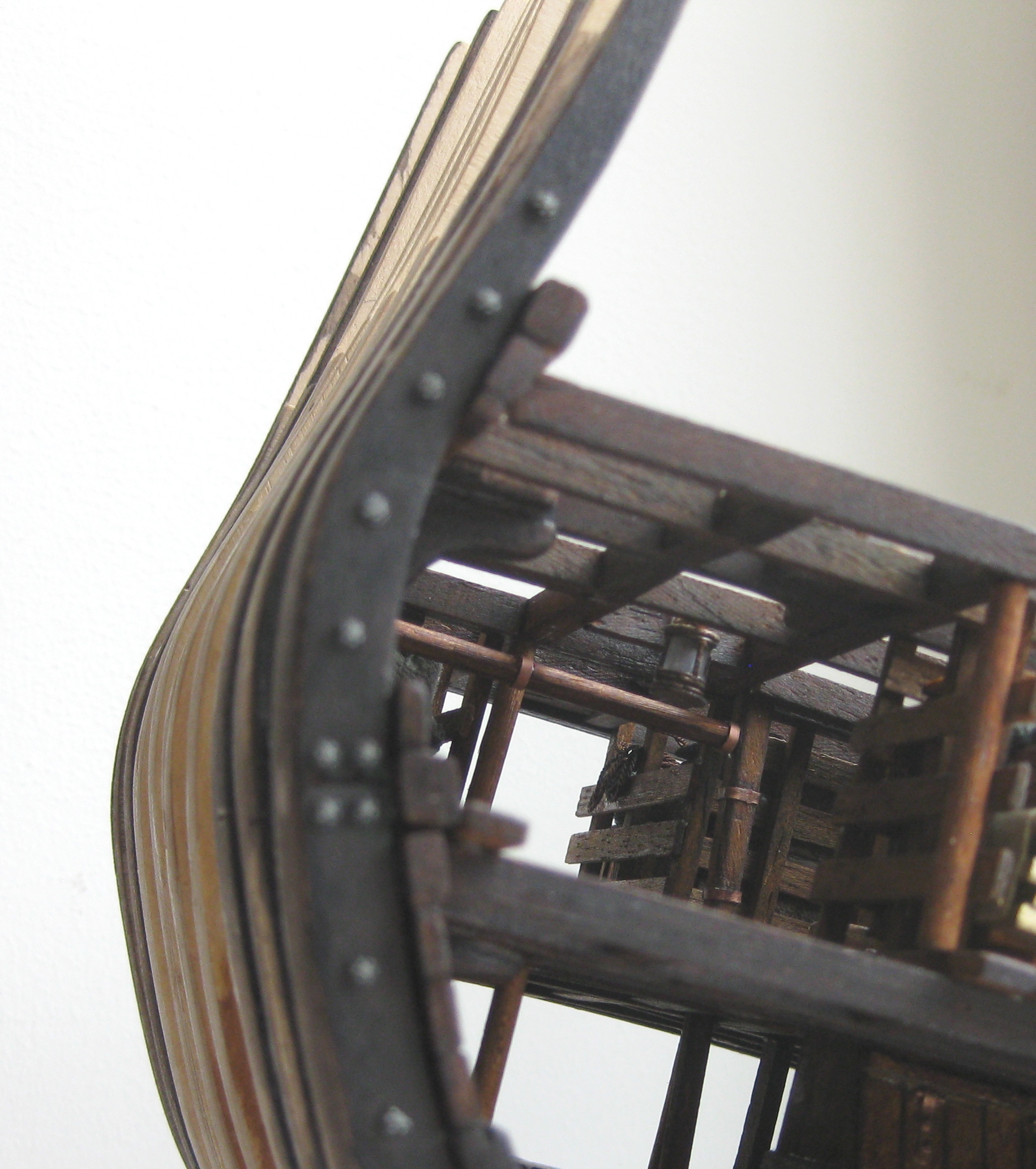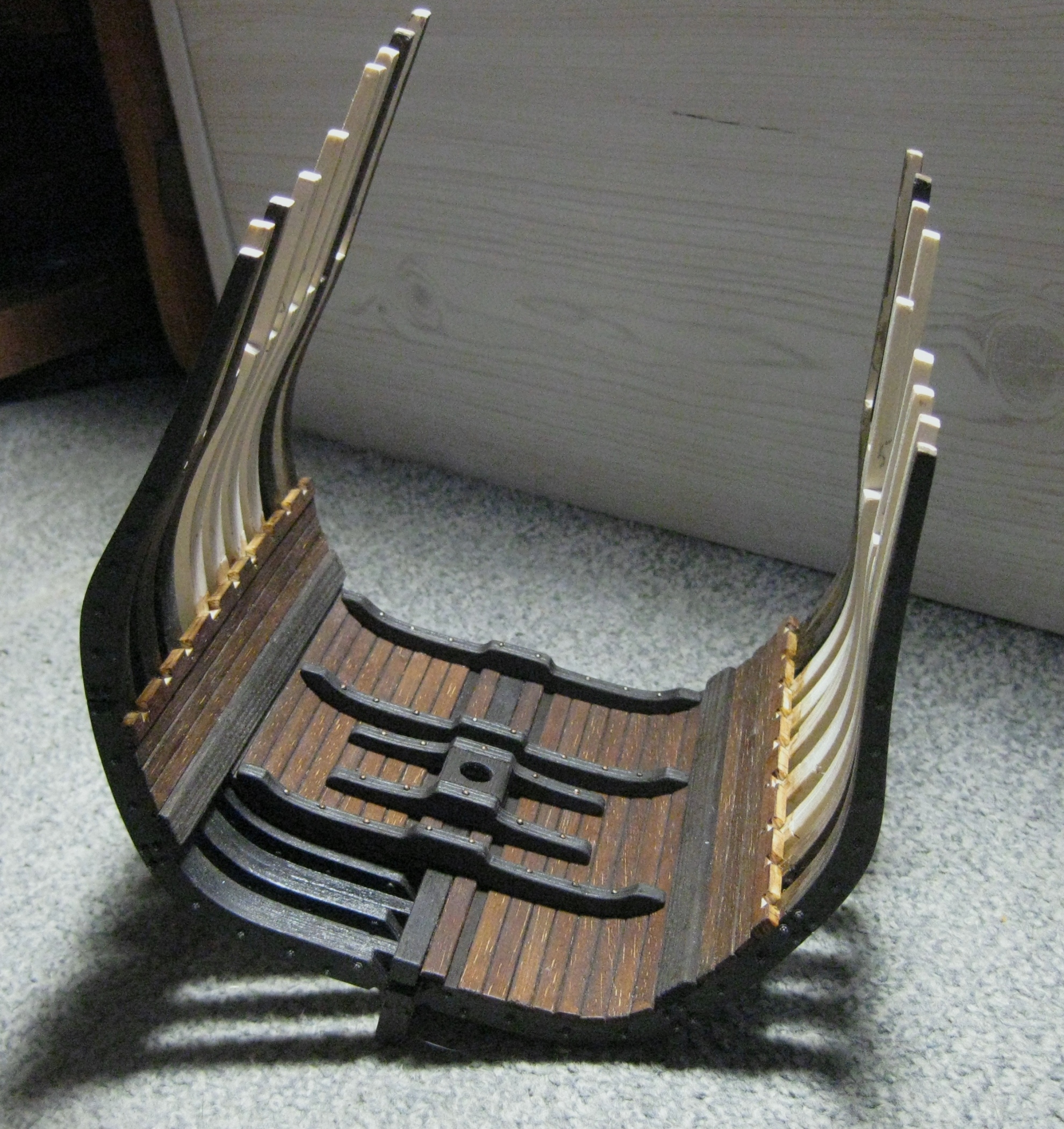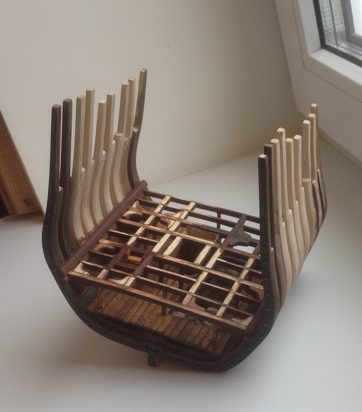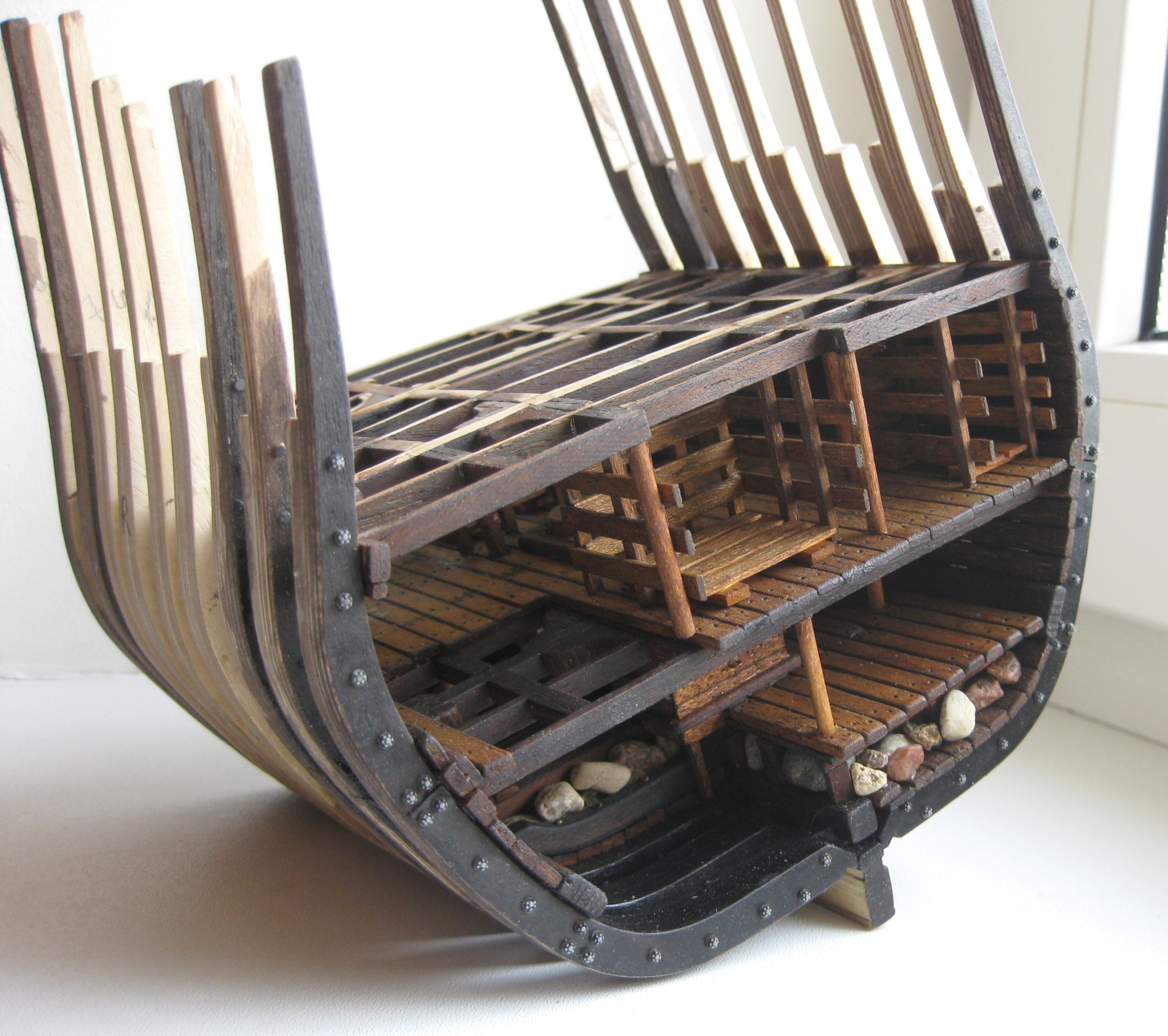 Пару слов к следующему этапу. Начинка тех объемов, которые были сделаны. Перерыто было много. Конкретики в общем особо никакой. На моделях ситуация аналогична. Пришлось делать по неким законам логики и использования пространства. Единственное, что у Лэвэри было упоминание о *плотницких дорожках*(*carpenter*s way*). Было одно и изображение примерно тех годов. Изначально ориентировался на 1600-1650гг. Более точной привязки к годам смысла не было. На Моделс Уорлд была статья о начинке внутренних пространств. Однако появились сомнения, что грузы вплотную прилегали к бортам. Да и некие проходы должны были быть. При критическом повреждении борта - как заделывали пробоины если все забито грузом ? Вряд ли сразу на дно ! У Лэвэри вот эти *плотницкие дорожки* и присутствуют. Да и как загрузить или разгрузить отсеки если точка входа одна и вокруг груз. Это я о технологических проходах. Может это и слишком современный подход. Ну а по штакетнику - попалось фото модели в пол-корпуса и в одной из анатомий была детализация нижней палубы. там он присутствовал. Вообщем такова предистория сего безобразия. Один из моделистов назвал это *супермаркетом*. Я и не возражаю особо, но весомых аргументов как было на смом деле либо приближенно на этот временной период не было...
