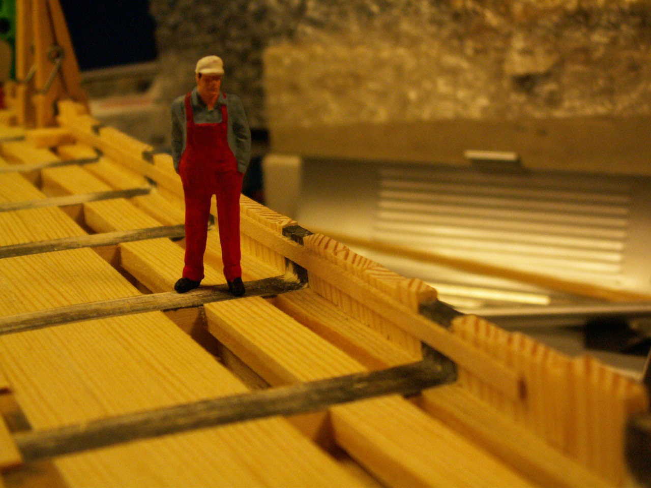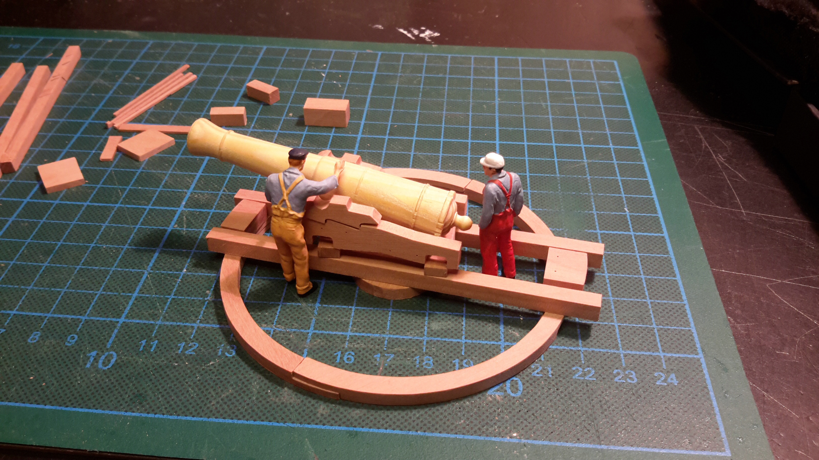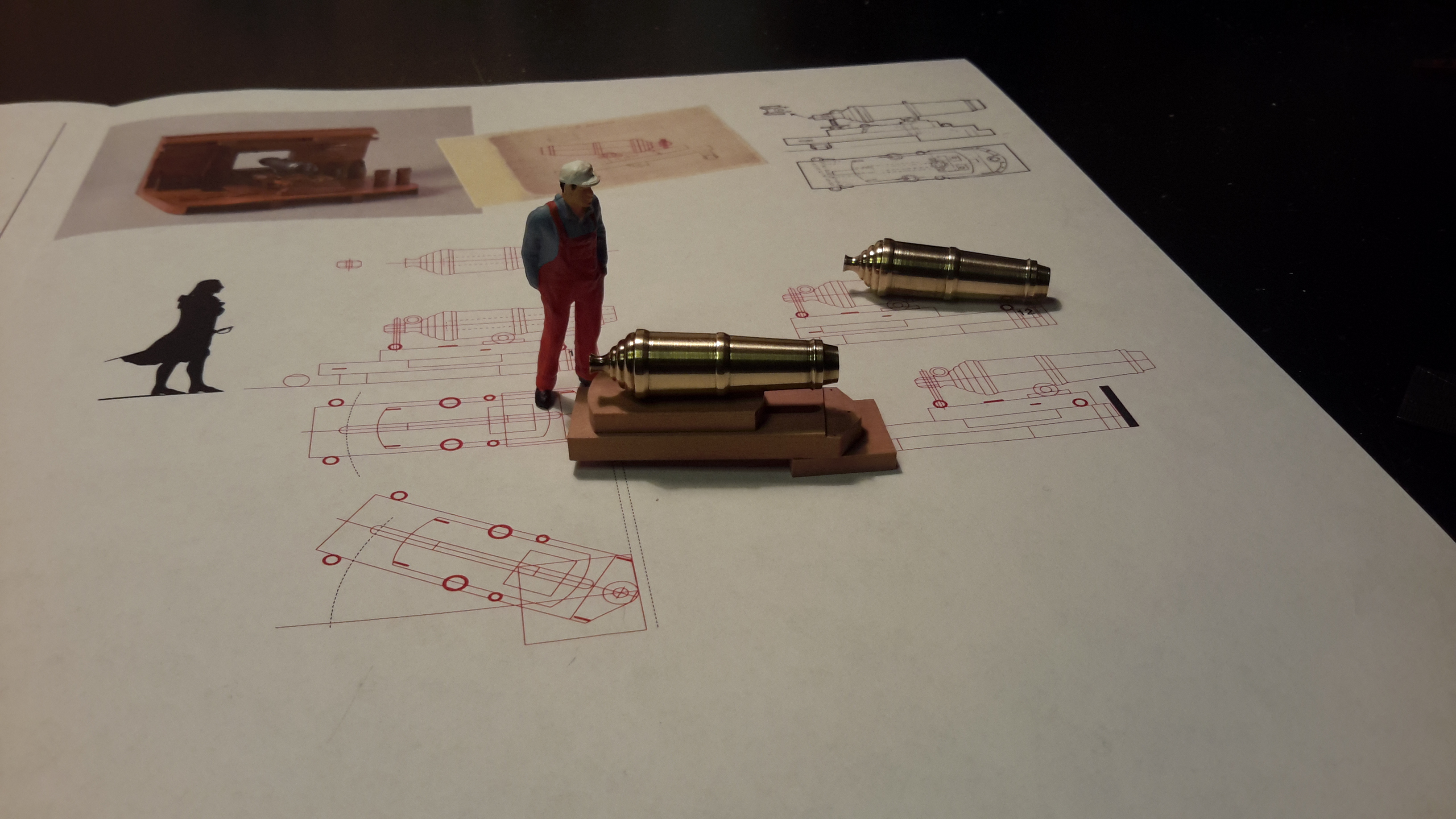 Чертежи прежде всего: главное орудие на поворотной платформе и реализация... деревянные детали после прорезки выглядят не очень... ... прошу прощения, но фотографии из этого периода перевалили за 2 мб, теперь их так просто не выложить. Пойду перекодировать.