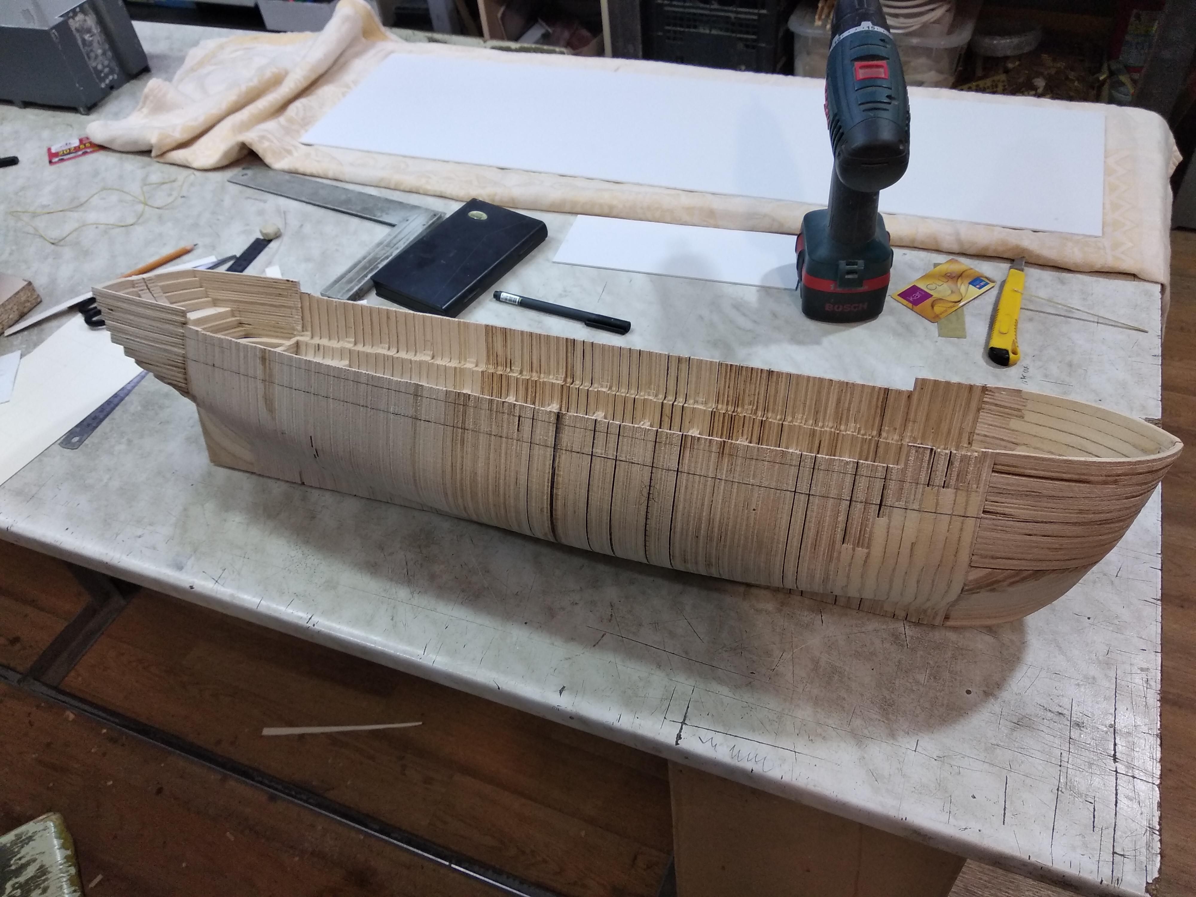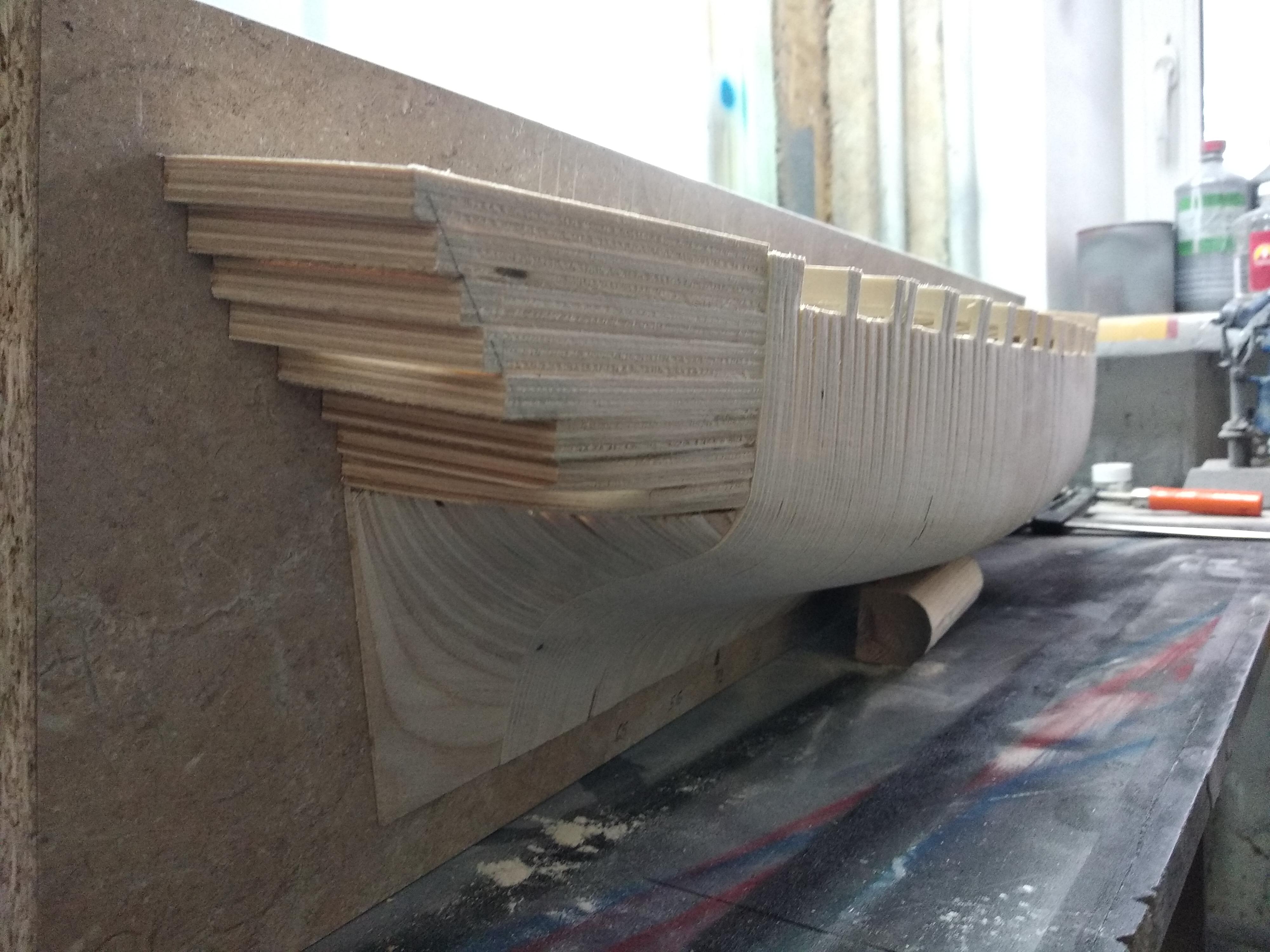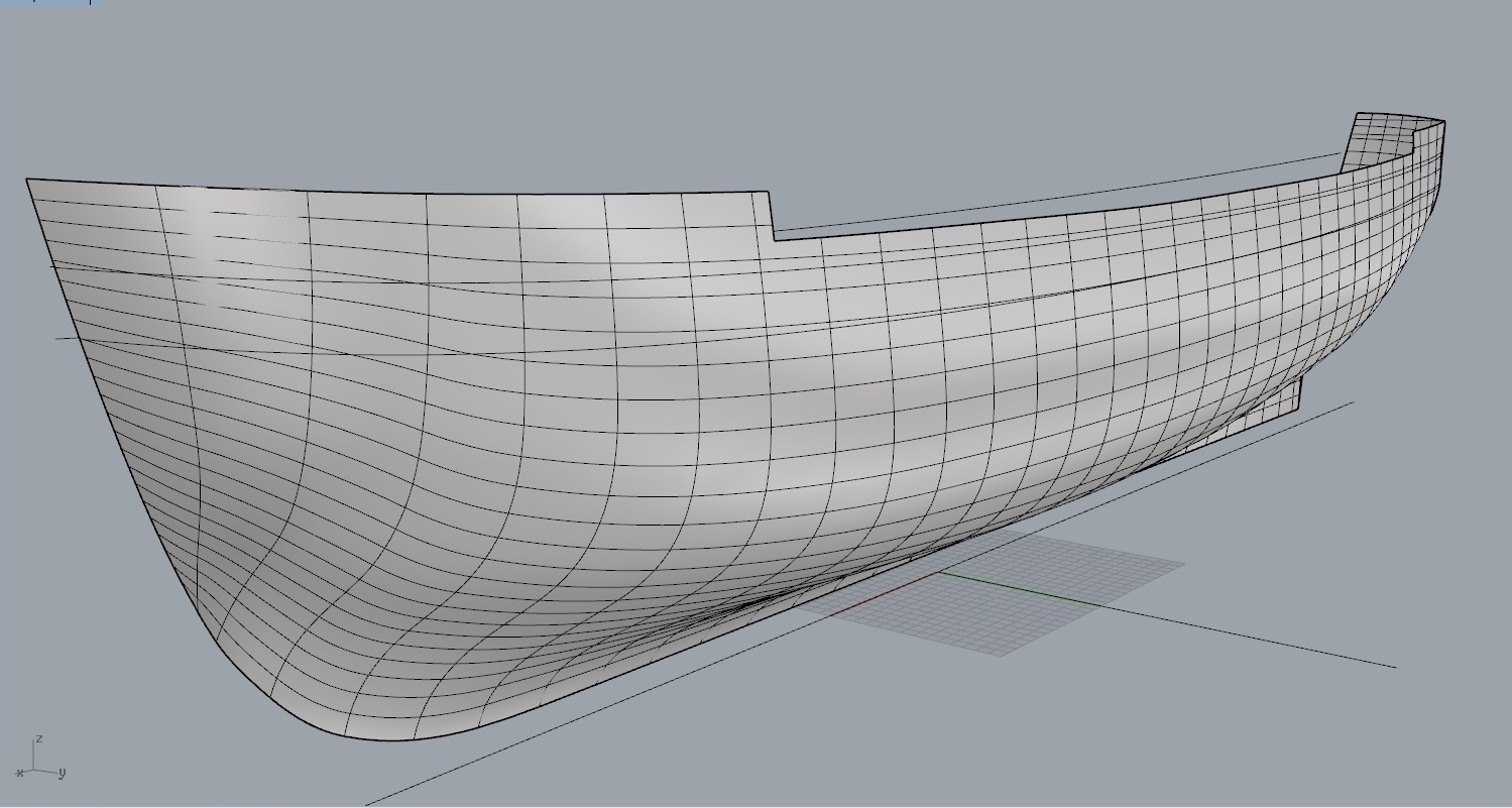 Корпус решил пилить по технологии Михаила Безверхнего, немного видоизменив под себя. Сделав поверхность в Рино, нарезал плоскостями шпангоуты. После станок распилил, засверлил и разметил все остальное почти сам, мне осталось только собрать и склеить…