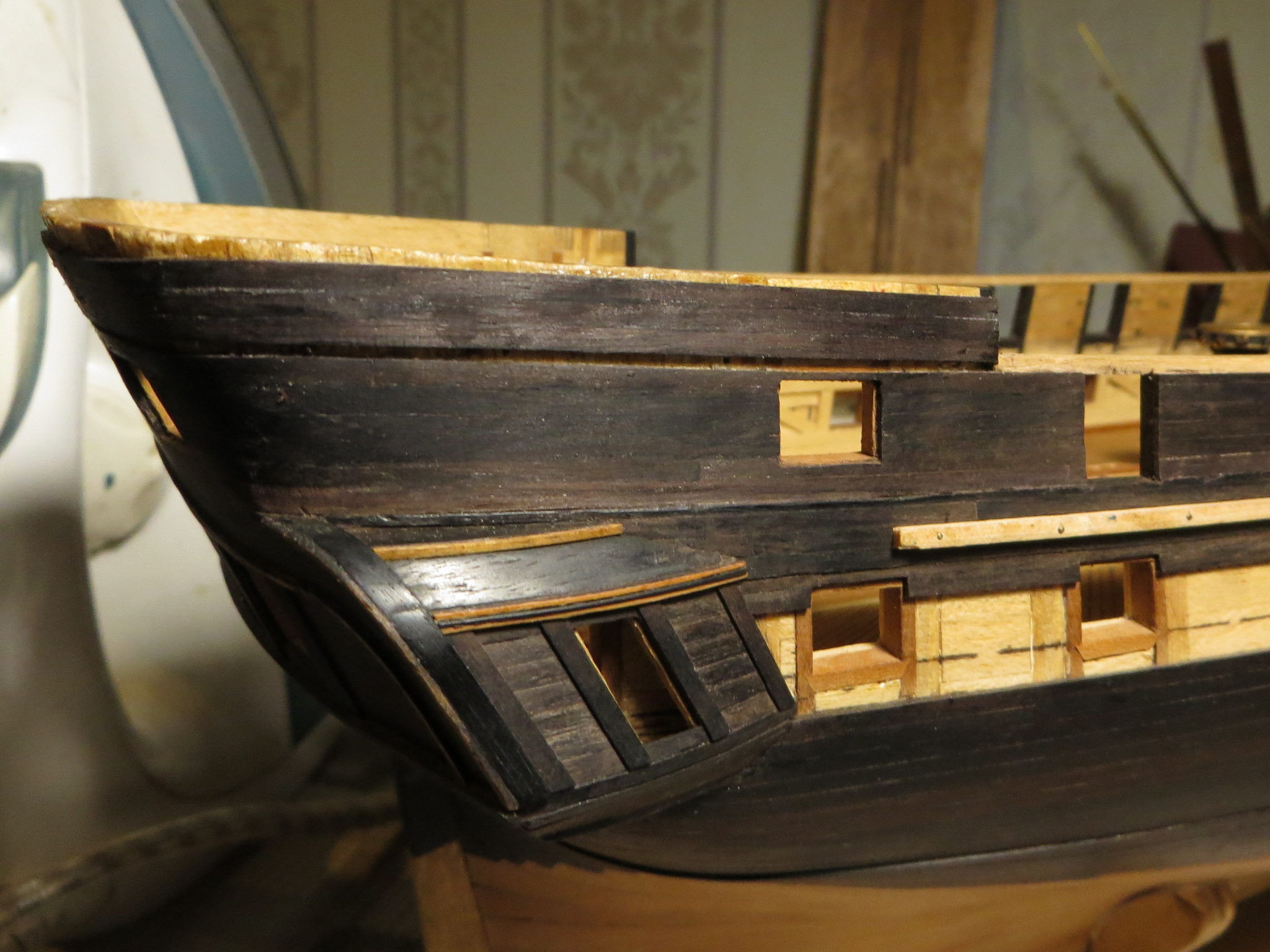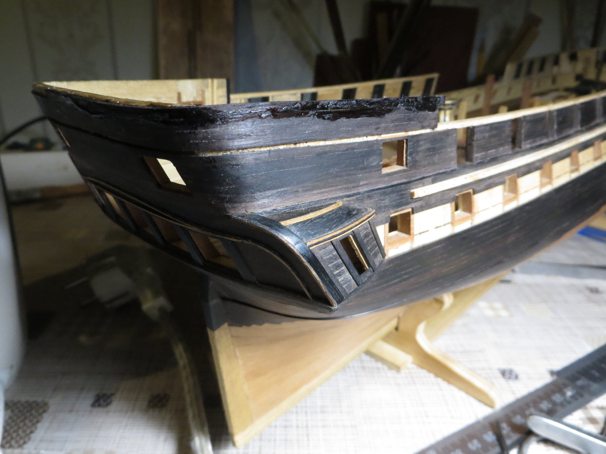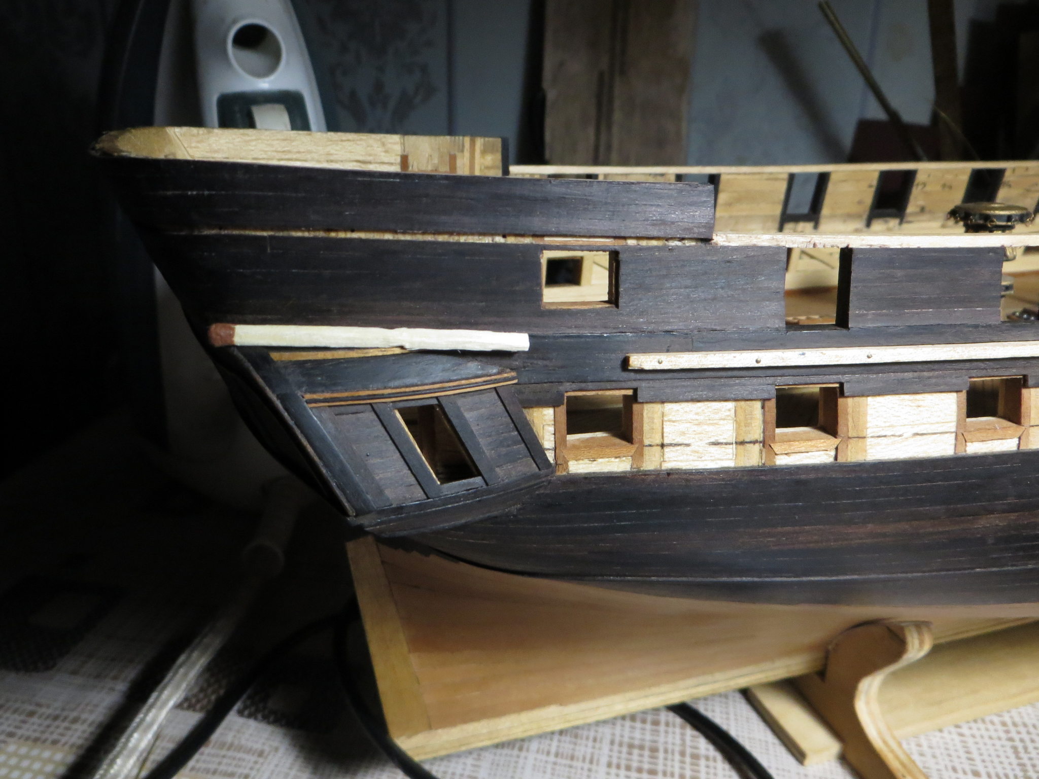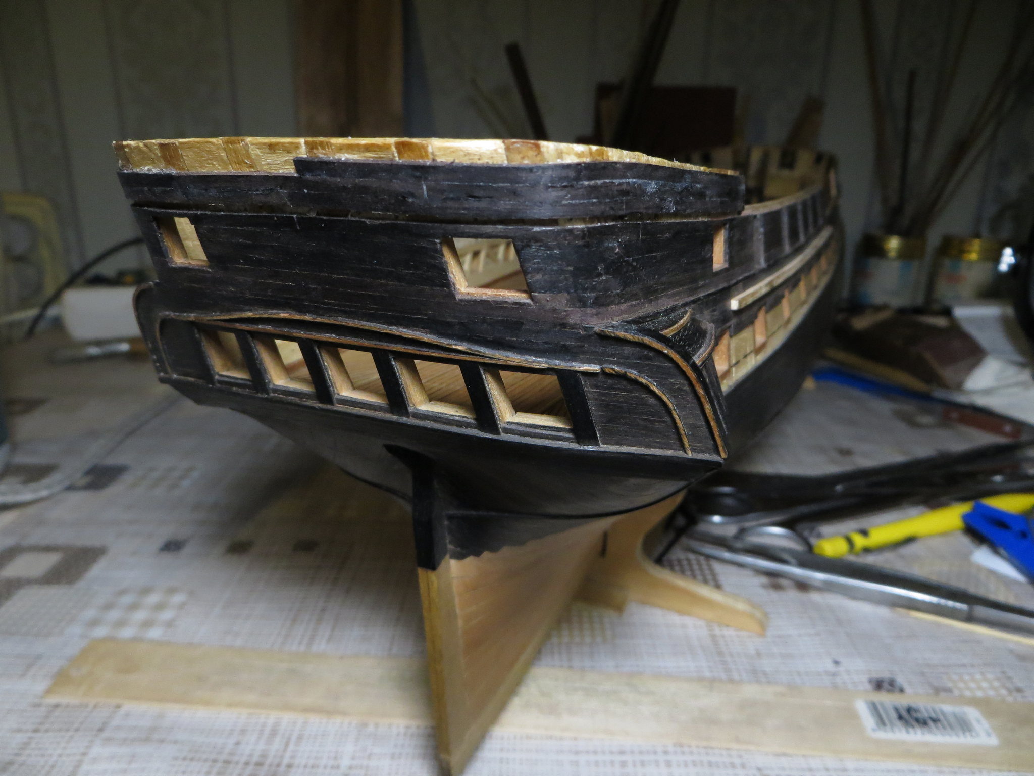 Не очень во-время, потому что корпус уже готов. Последняя отделка борта в районе кормовой надстройки.