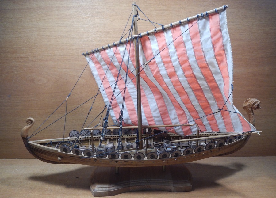 Юферсы... Ну, юферсами это язык не поворачивается назвать... Тут всего два варианта - характерный для викингов на вантах и что-то похожее на античный юферс для остального такелажа. Если верить Фон Фирксу, была у викингов манера заканчивать кусок толстого каната античным юферсом, а затем продевать через него канат потоньше и крепить два конца. То есть, "античный юферс" работал у них как подвижный блок. А поскольку мужики были здоровые, а мачта и парус умеренных размеров этого хватало и с полноценными юферсами типа полиспаста никто не заморачивался. Тут я такой юферс заклинил зубочисткой, чтобы не елозил до обтяжки паруса, хорошо видно реванты. На мачте под ванты наклеены клинья, которые не дают вантам соскальзывать вниз по мачте. Ванты у нас, как и положено парные, только их мало - пара слева и пара справа. И такая фигня века до 14-го - от одной до трех пар на сторону. По Фон Фирксу - по паре вант на сторону. Тут снова непоняточка... Вант всего по паре, зачастую в таком случае их тупо вязали на мачту без всяких бензелей (так называемый "средиземноморский способ". Сделал с бензелями, просто потому что так больше понравилось. "Первую пару на правый борт", "левонавитые ванты на правый, а правонавитыые ванты на левый" - не заморачивался, тем более, что это все появилось гораздо позднее. Тем более, что нитки уже имеют навивку в одну сторону и делать из них канаты разносторонней навивки не очень хорошо. Получилось как-то так. Клея здесь нет совсем, мачта вставляется и фиксируется вантами, парус тоже нигде не приклеен. В принципе можно его положение и поменять если захочется. Надувать его не стал. Можно, конечно, дуть и брызгать лаком для волос или ПВА разведенным, но надо ли? Вот так бывает - парус поднят, а ветер стих...