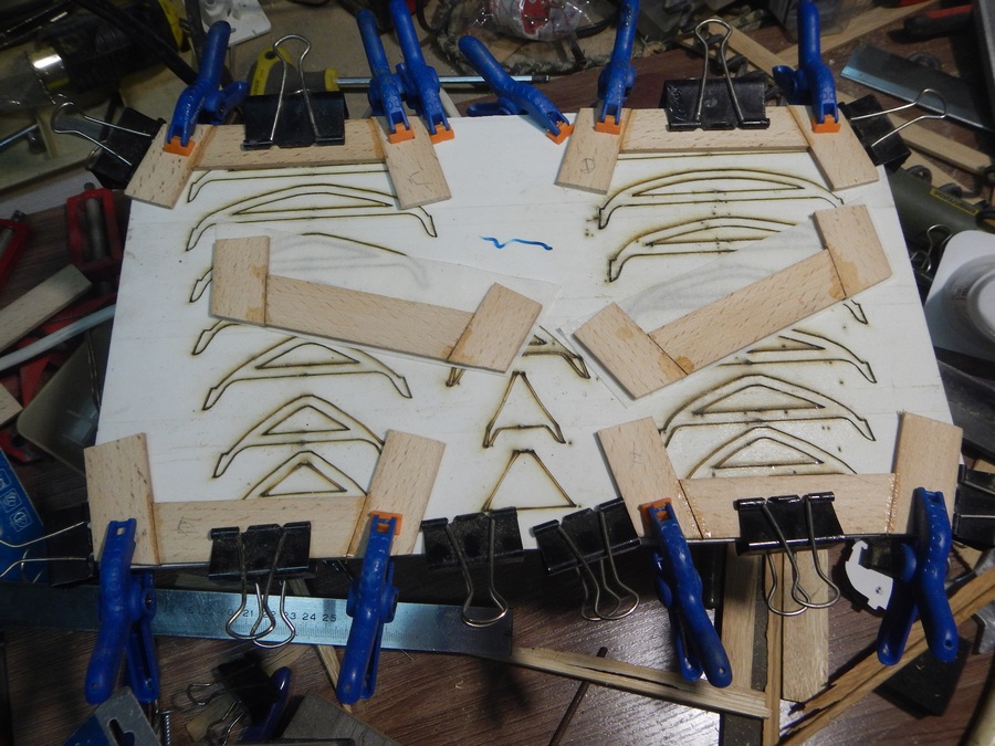 Чертеж нашелся только такой: Ну и поехали. "Я раньше чего такой злой был? Раньше у меня станка с ЧПУ не было..." Во-первых, загоняем чертеж в вектор. Если кому надо, могу файлом *.cdr поделиться безвоздмездно. Во-вторых, включаем лазер и жжем контур на ненужном куске пластмассы, чтобы иметь представление о размерах шпангоутов. В-третьих, переклеиваем деревяшку, чтобы волокна шли в нужных направлениях. И пытаемся попасть в нее фрезой. Переклеенные деревяшки наклеиваем на малярный скотч, чтобы почти вырезанная деталь оставалась на месте. Тренируемся на ненужных кусках. И режем. Потом, разумеется, шкурим.