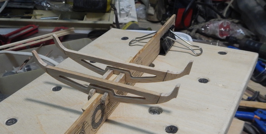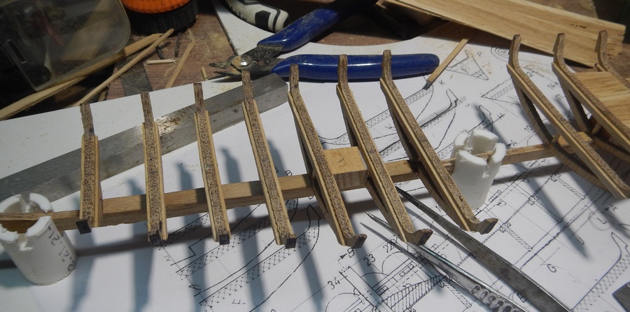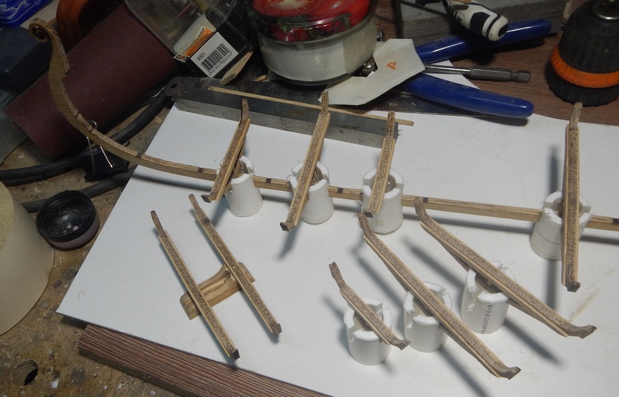 Ну такая придумка - нарезал на токарном станке цилиндров из пропиленовой водопроводной трубы, а затем на фрезере прорезал их торцевой фрезой строго накрест. Шпангоуты и киль в них влезают с усилием, получается вполне перпендикулярно. Главное, порядок шпангоутов не перепутать. Заодно на сухую посмотрим, как палуба ляжет, как фальшборт закончится.