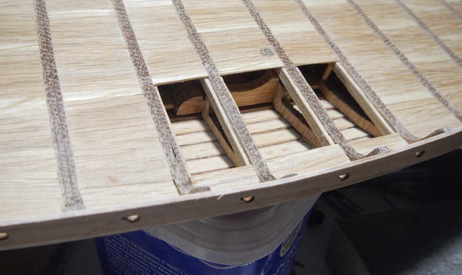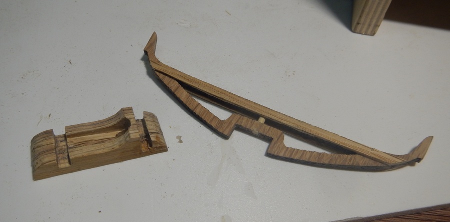 Теперь хочется этот скелет сделать жестким. Во-первых, киль становится Т-образным. И верхняя планка этого Т зажимает шпангоуты. Во-вторых, палуба. Палубу по досочкам делать лениво, поэтому делаю переклейку, а уж ее решу на плашки, состоящие из нескольких склеенных "досок". И в таком виде калибрую на шлифовке. Получаю толщину палубы 0,8. Что приятно, дуб 0,8 без особых напрягов режется поперек ножницами. И пару вставок не предусмотренных чертежем: А сюда я буду закручивать саморез, когда буду устанавливать драккар на подставку. Конечно, эти секции надо прятать под палубой полностью. А вот то место, где вставляется мачта (можно ли в драккаре называть это степсом мне не очевидно...) хочу оставить частично открытым, чтобы было видно как ставится мачта.