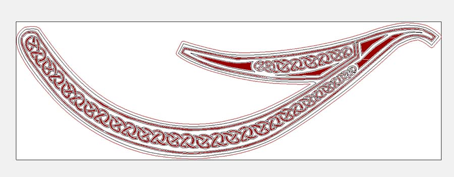 Ну и вот. Масштаб у меня мельче. Дерево тоже не гренадилл. Мои модели в родстве с дубовым паркетом. Да и опыт гораздо скромнее. В общем, труба пониже, дым пожиже. Воспроизвести оригинальную резьбу в таком масштабе не получается. То есть вектор сделать, проблем нет. Но вот арткам создавать УП в таком размере уже отказывается. Поэтому накладки на нос у меня с абстрактной геометрией. (Утянутой с какого-то сайта про тату. Прямо вот так и обозванно - "татуировки викингов". И от татуировок, оказывается, бывает польза...) Вот, кстати, сплошные треугольники на концах - это области, где завитушки пропорционально уменьшенные арткам резать отказывается. А толщина завитушек возле них минимально возможная для резки. Поэтому и сплошные треугольники. Вообще, опытным путем выяснил, что толщина элемента должна быть не менее 0,5, лучше ближе к миллиметру. Иначе годная резка не получается. То есть что-то вырезать выходит, но, во-первых, шансов на то, что все элементы останутся четкими очень мало, а во-вторых, рисунок все равно получается слишком мелким.