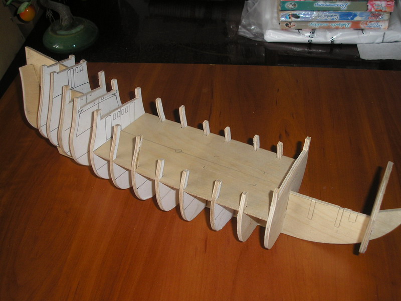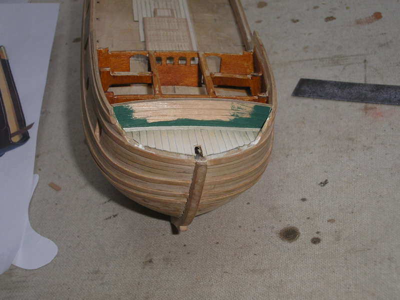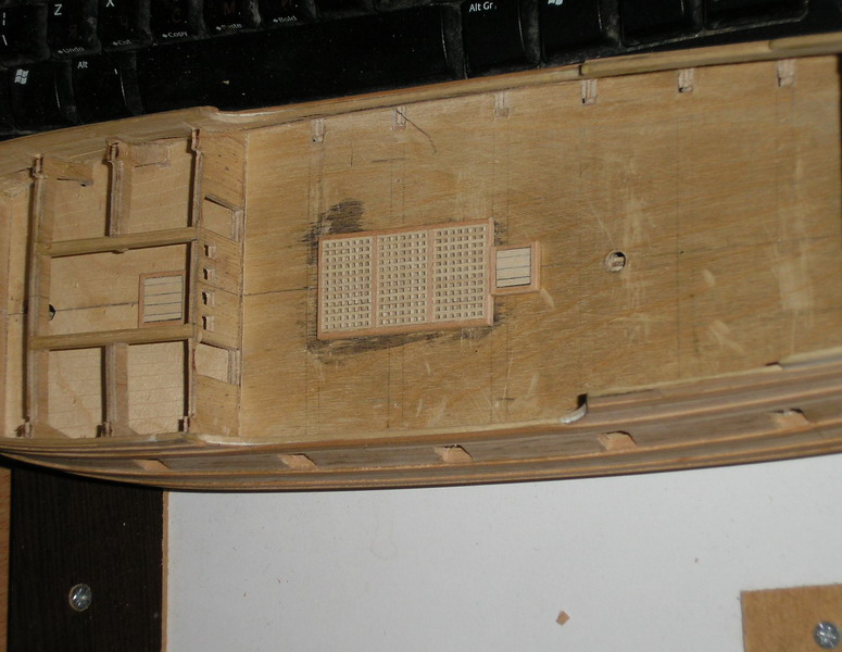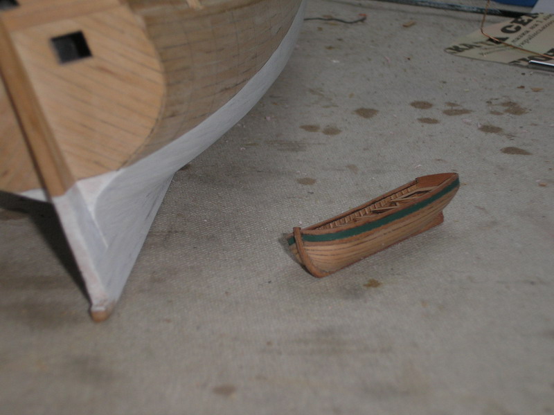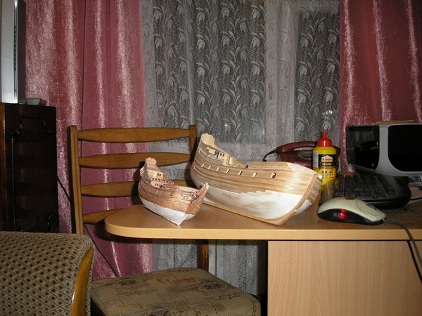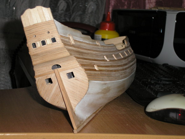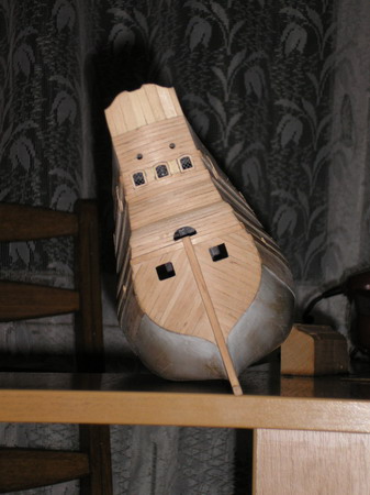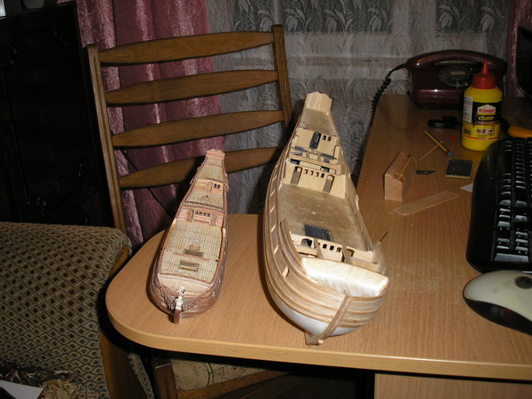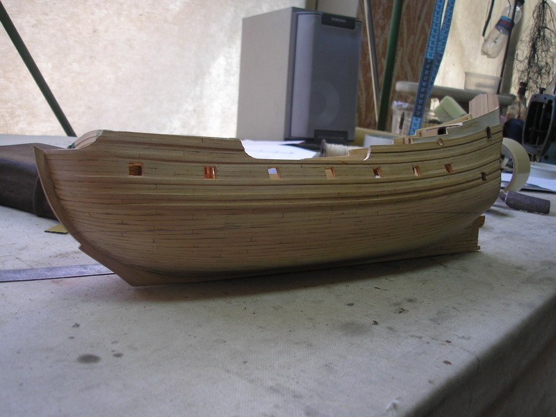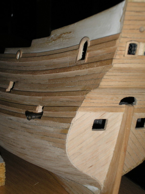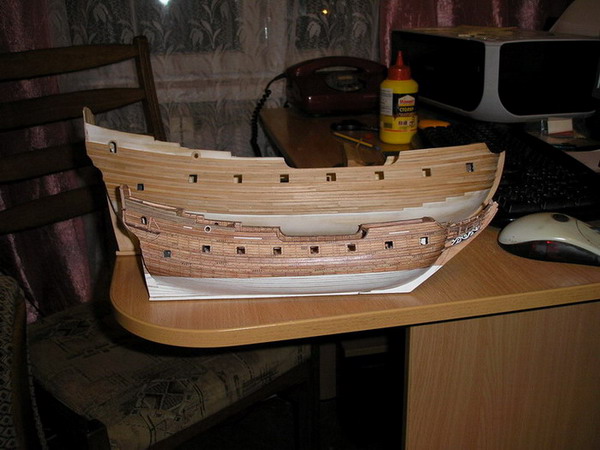 в кормовом орудийном порту, еще до черновой обшивки, был установлен черновой лафет. Ствол просто для примерки.