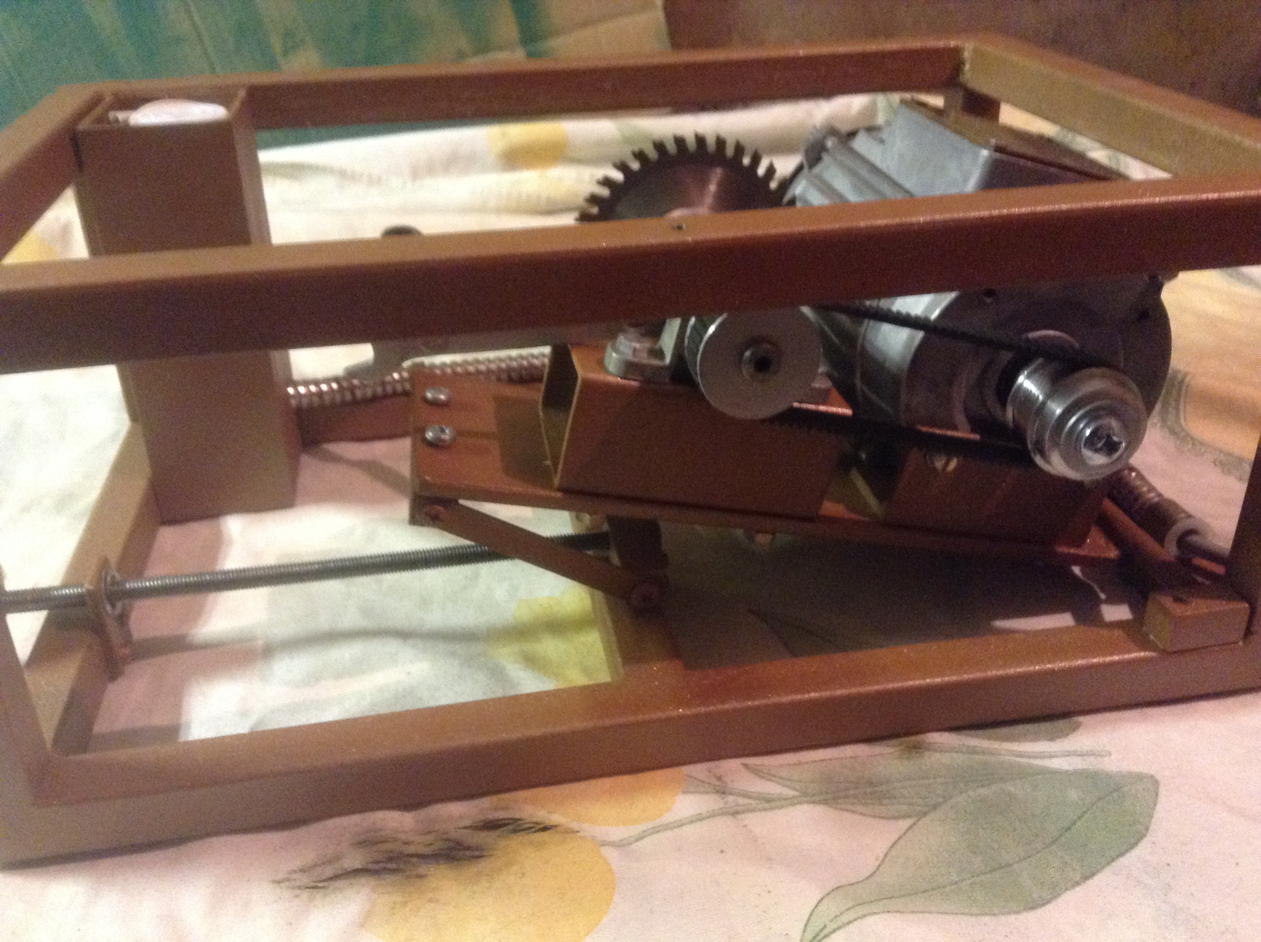 Характеристики: двигатель-800вт(позиционировался на форуме), габариты 420х270х170мм, вес 14кг. Комплектуется 3мя пильными дисками: 100х1,6, 80х1,6, (для металообработки-не дорабатывал) и китайской победитовой 80х1,7мм. Сменные вставки к ним. Плавный подьем фрезы, вылет 80й-15мм 100й -23мм. Рабочая плита(сталь 5мм) имеет 2 продольных паза 8х2 мм для обустройства подвижной каретки. Пластины 130х 8х2мм прилагаются. Параллельный упор-АЛ квадрат труба 25х25мм. Остальное спрашивайте. Цена 13000р