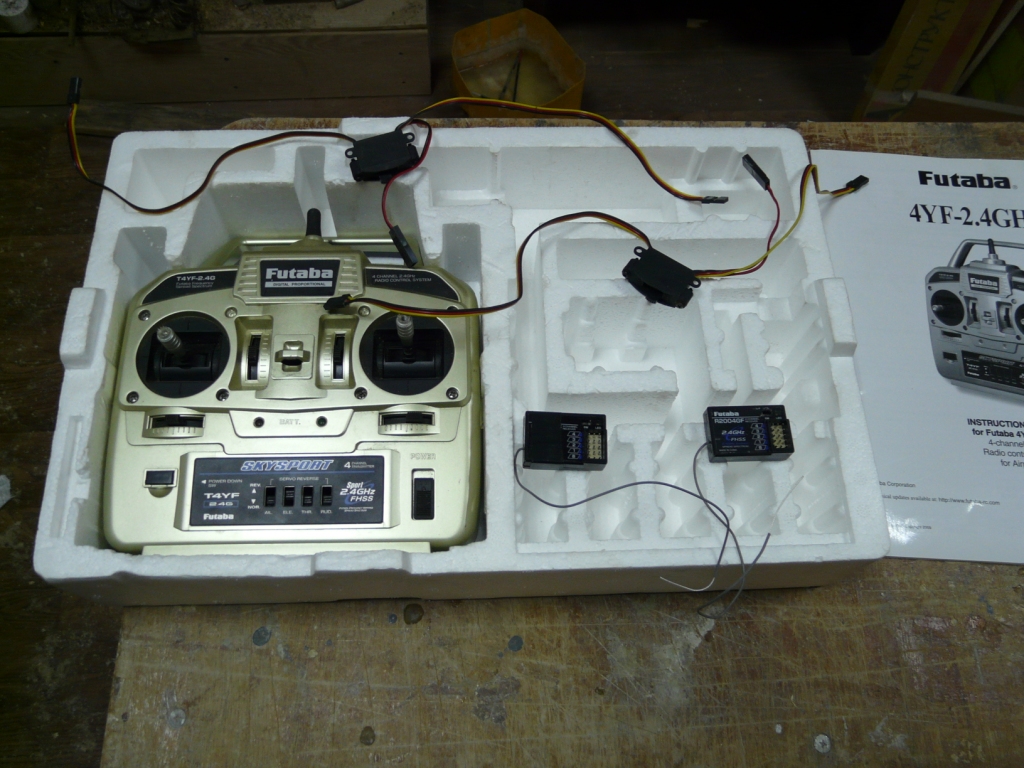 Аппаратура 4х канальная. В комплект входят передатчик, ДВА приемника(оба привязаны к передатчику), два бортовых выключателя.