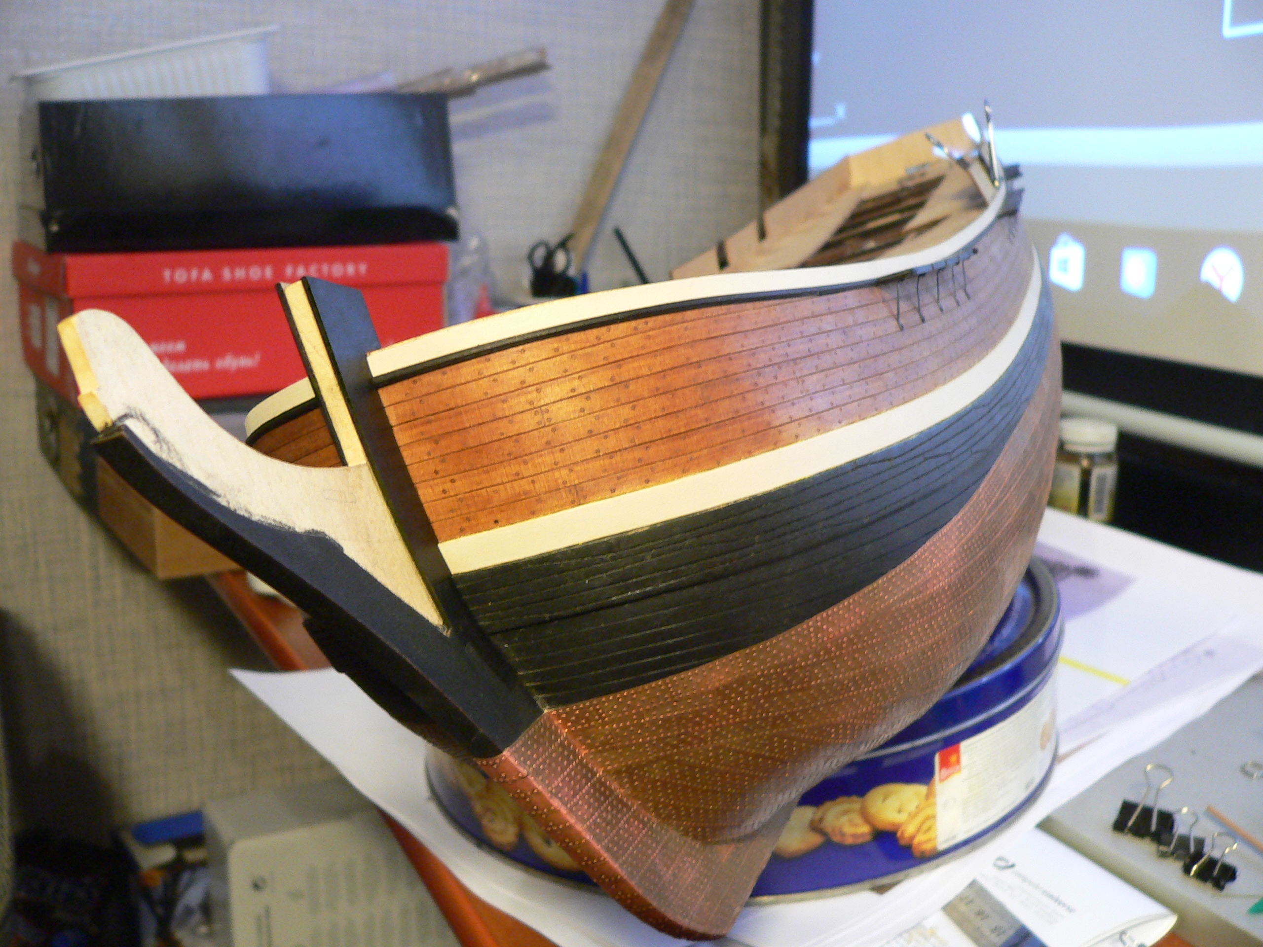 После некоторого перерыва стройка продолжается. Из изменений: дошил до верха борта, сделал руслени, оформил транец.