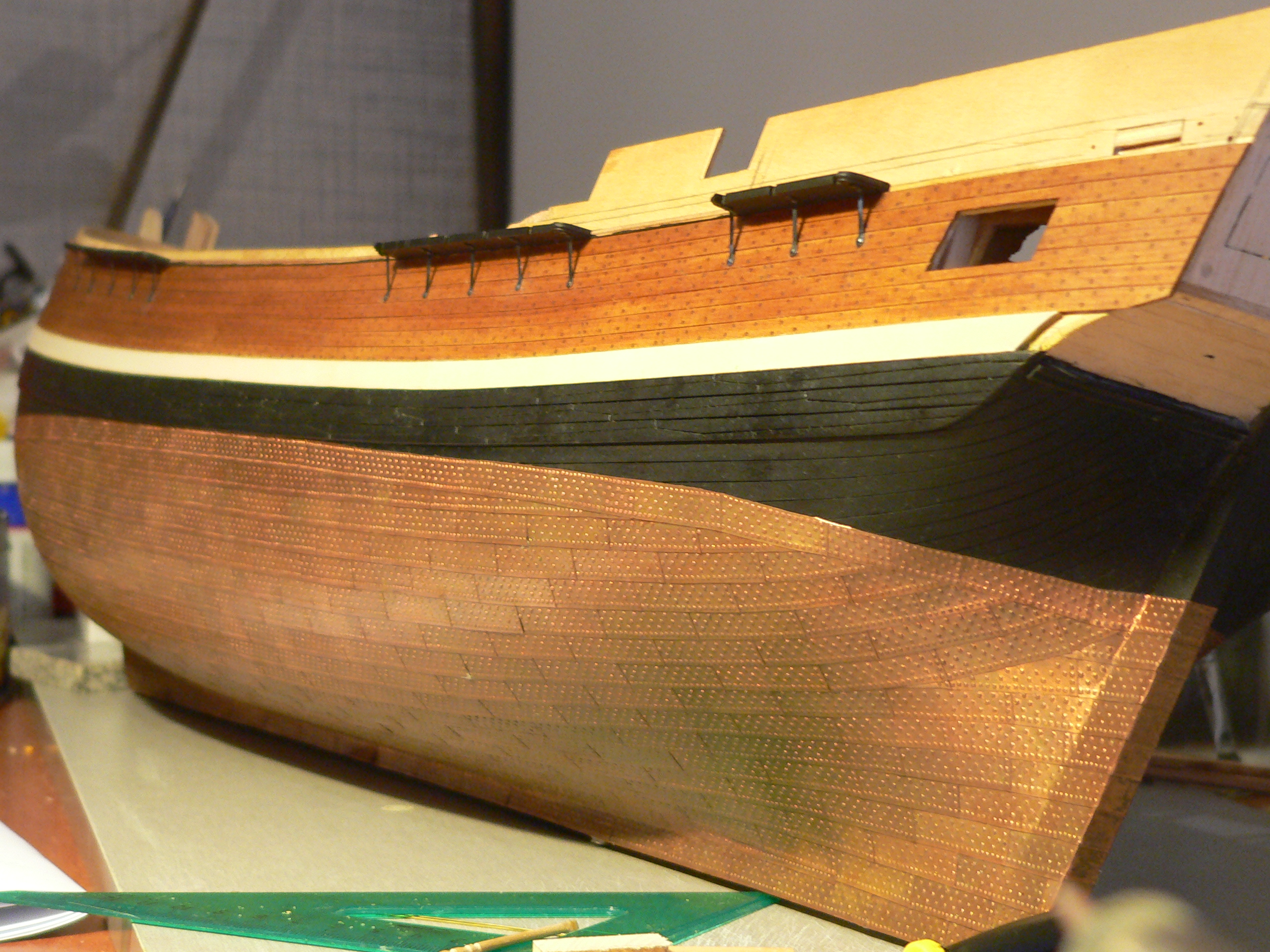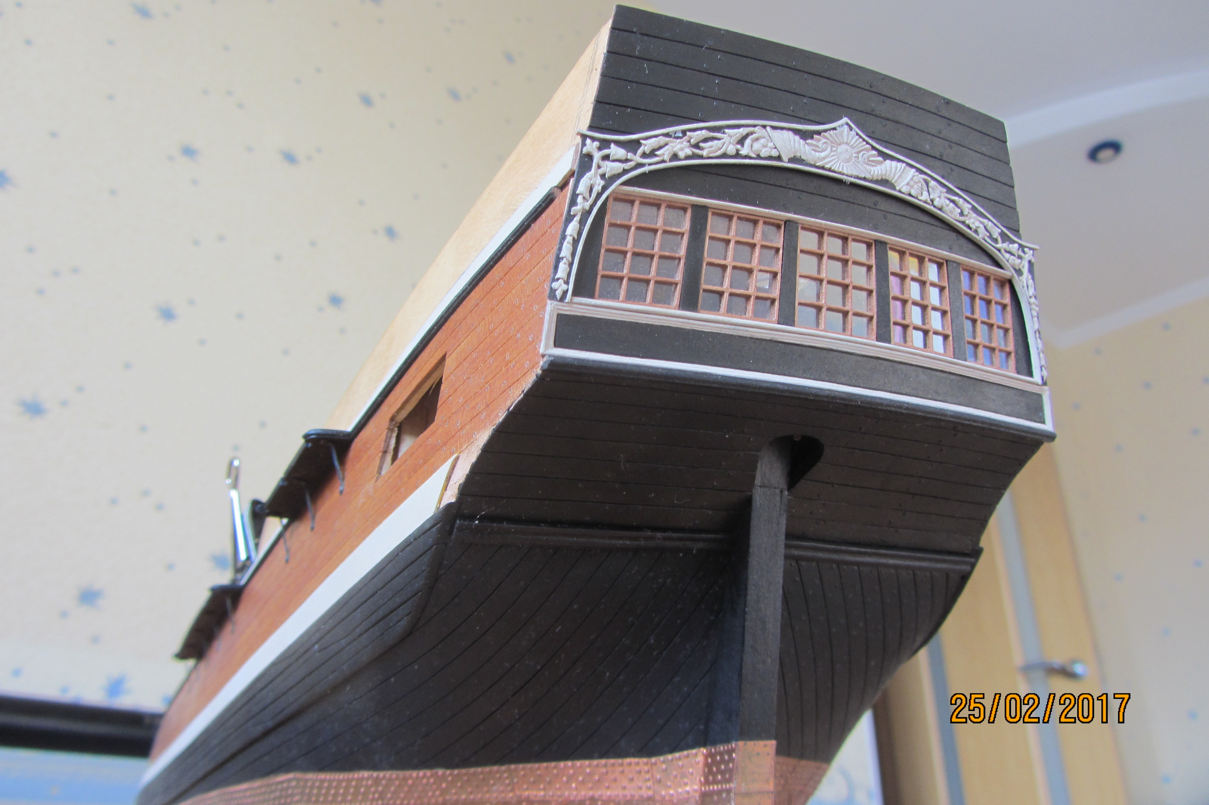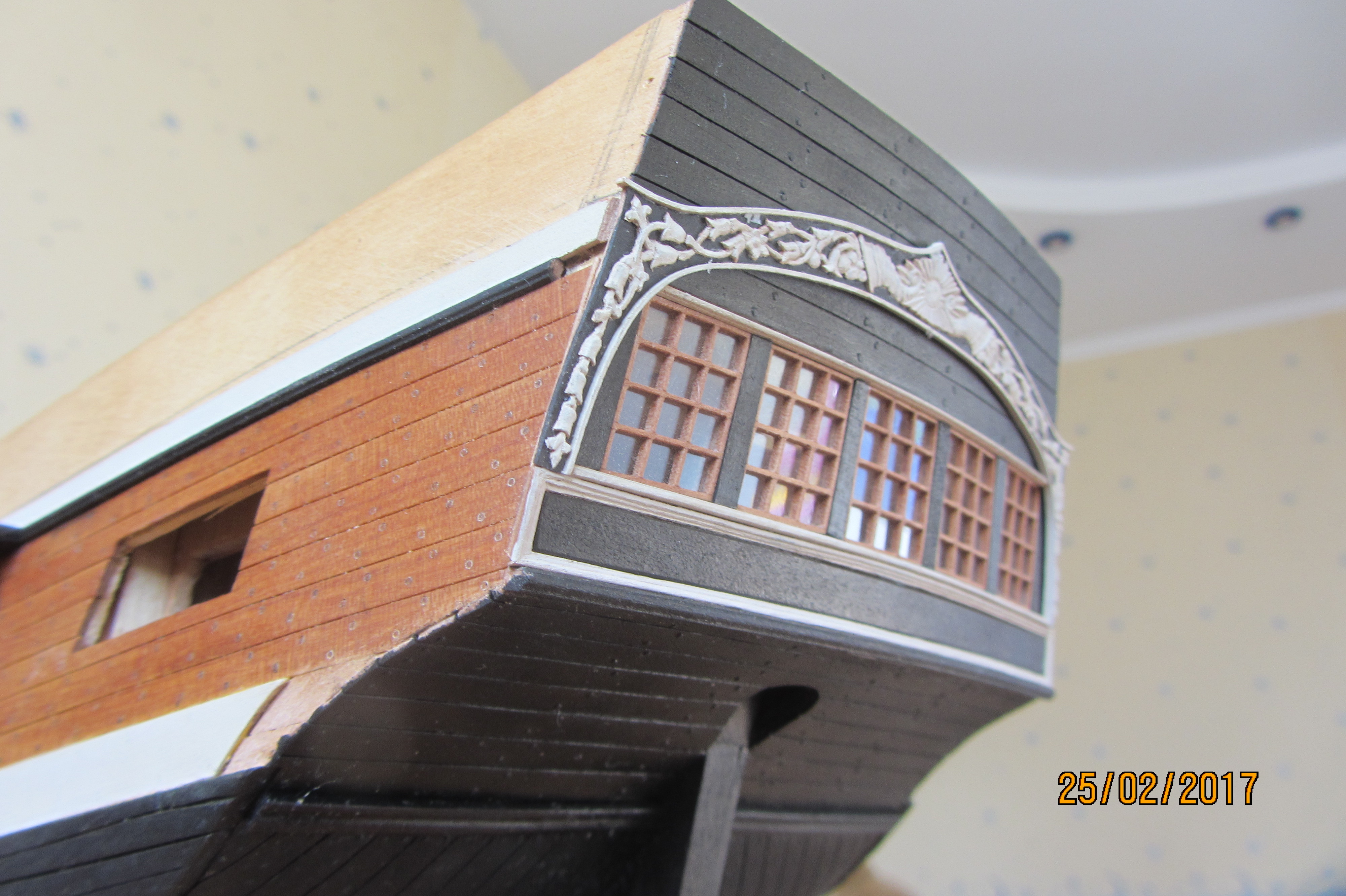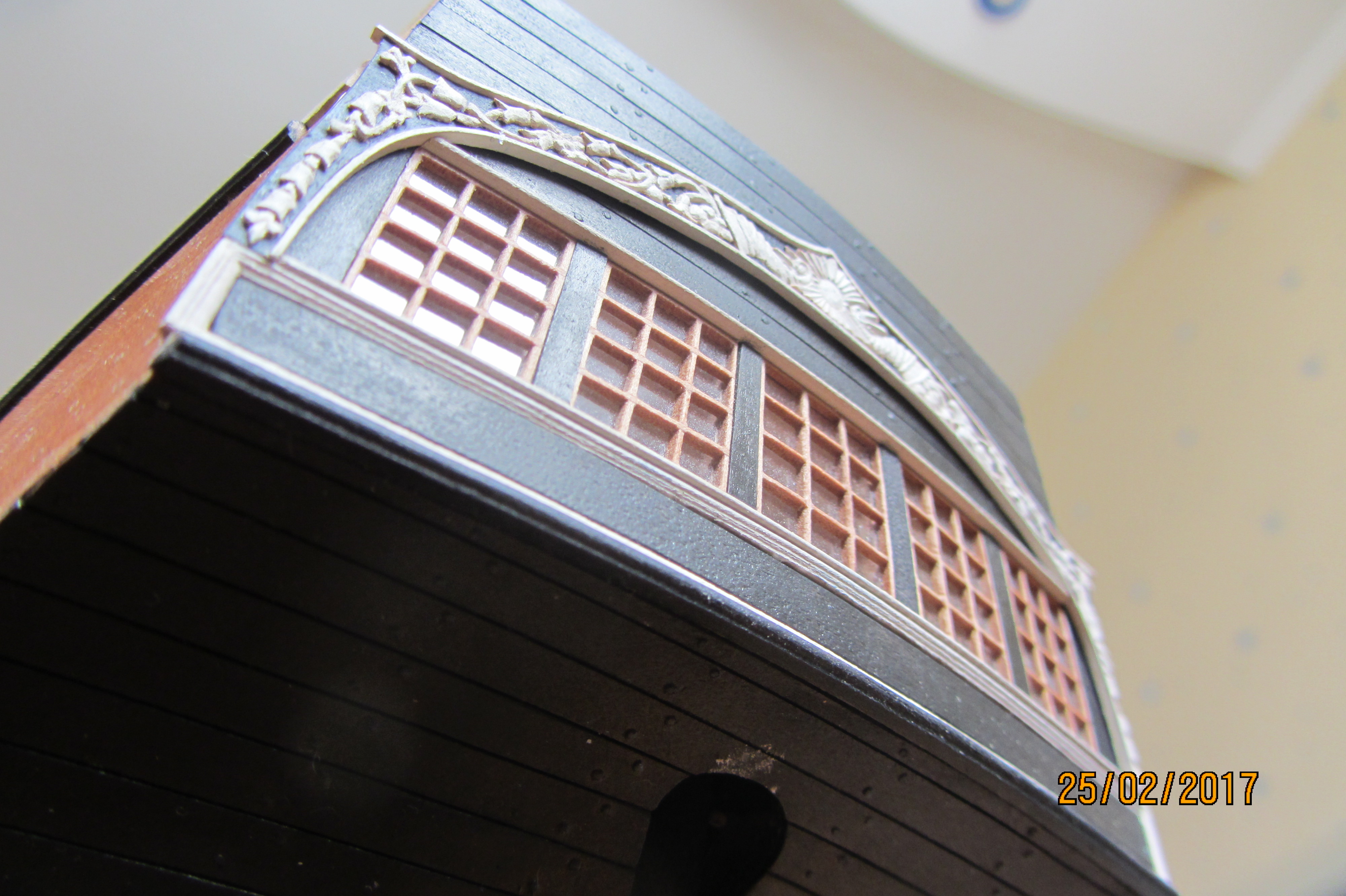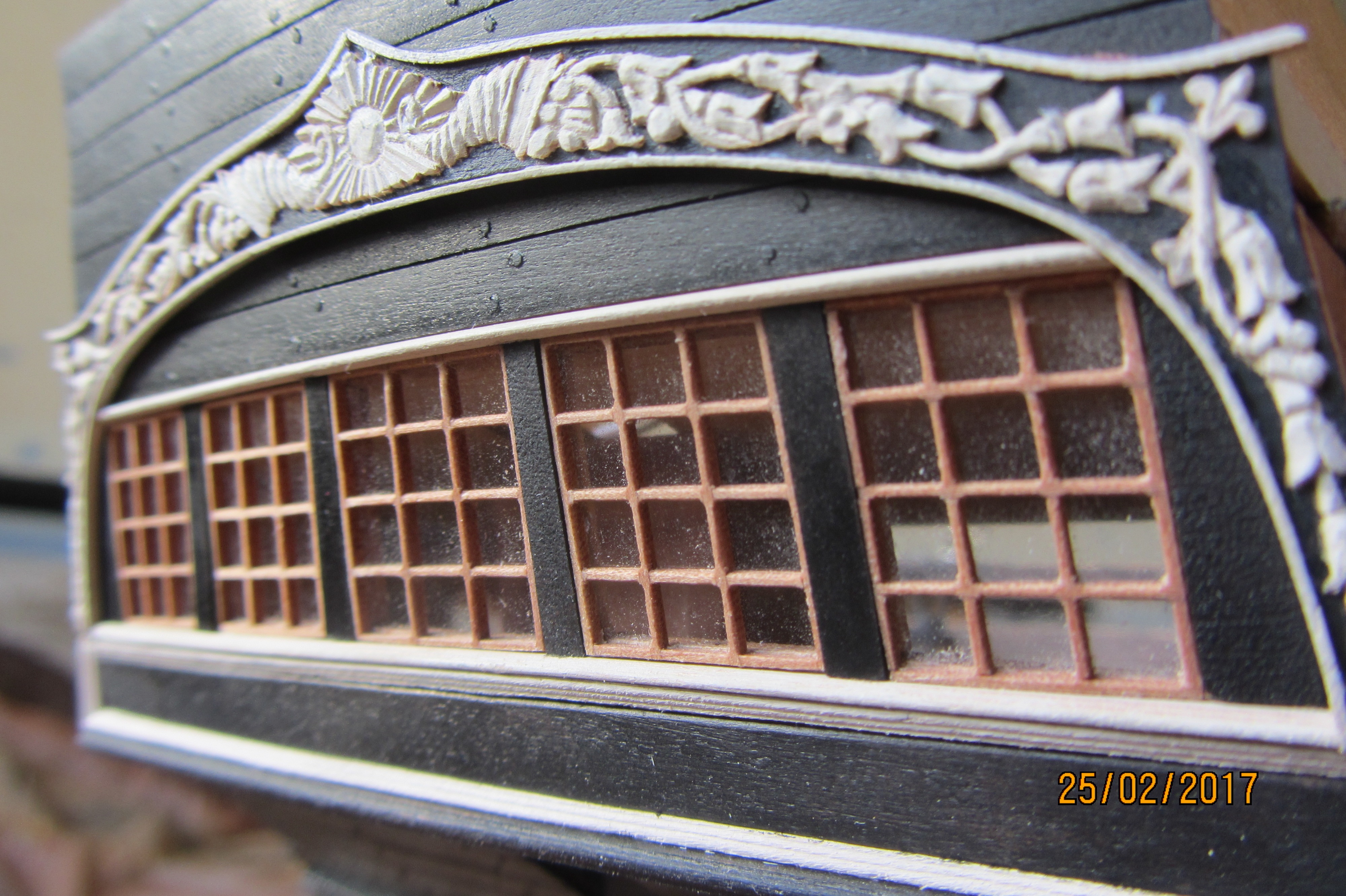 Патворк это журнальная серия с вложениями деталей для постройки. Эдакий кит в рассрочку. У меня родного от патворка только скелет, в том числе фанерки палуб. А окна... окна конечно сам делал. По принципу рустеров собирал.