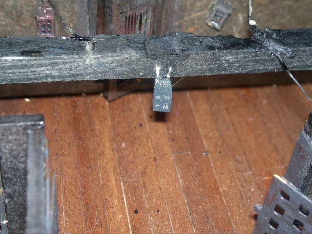 Если использовать тонкий эмалированный провод (с катушек различных реле) и провести его за фонарём, то фонарь можно вешать на крюк. Провода не будет заметно. А основной провод (большего сечения) заложить в паз сделанный по верхней плоскости бимса и закроется всё это палубой.