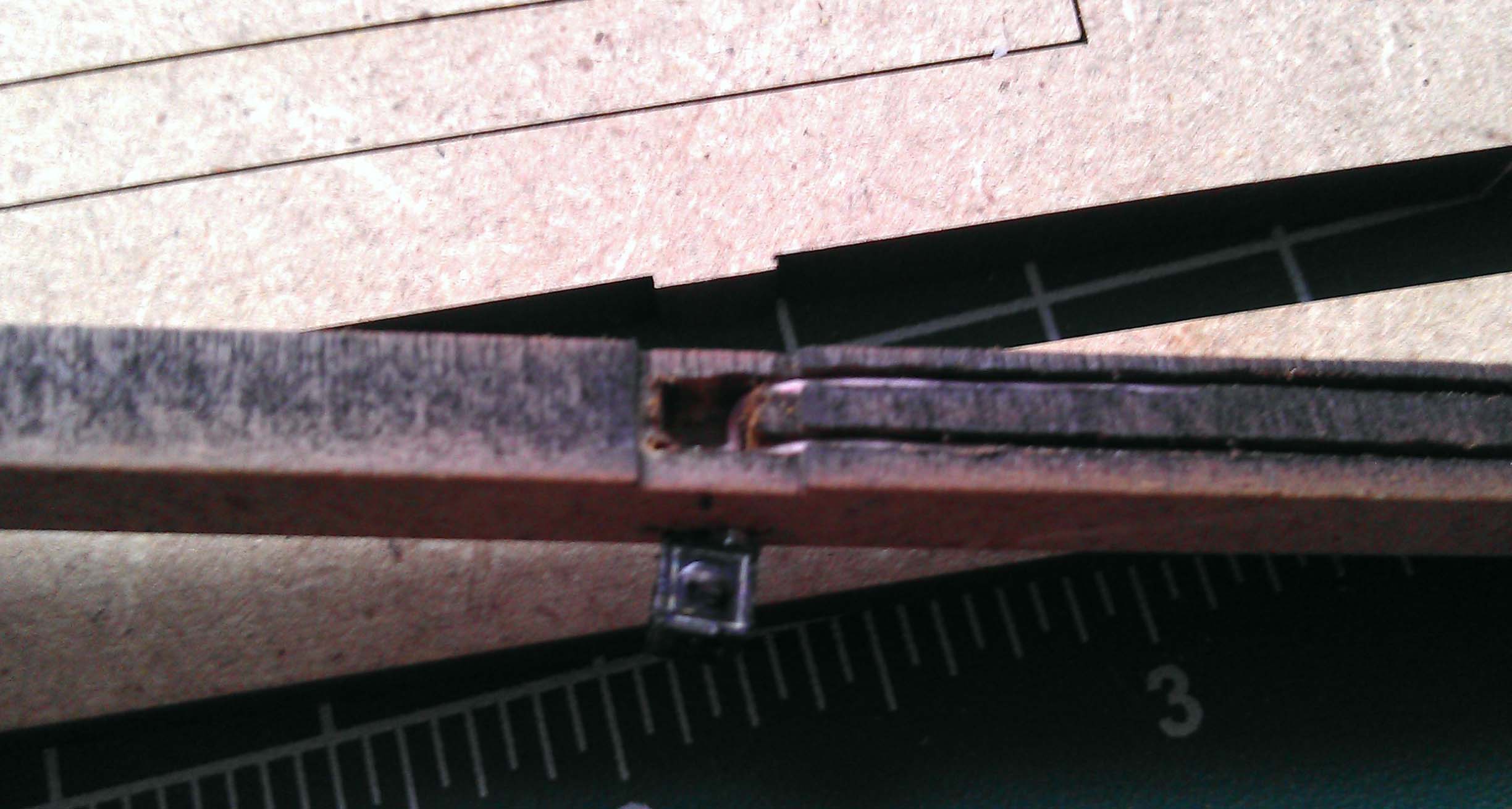 Я бы взял бескорпусные светодиоды для поверхностного монтажа. Такие используют на подсветке панелей мобильных телефонов, кнопочек магнитол и т.п. В этом случае мы уходим от толстых ножек старых светодиодов.Mamed писал(а):Диод- 3мм, сточен наждачкой!