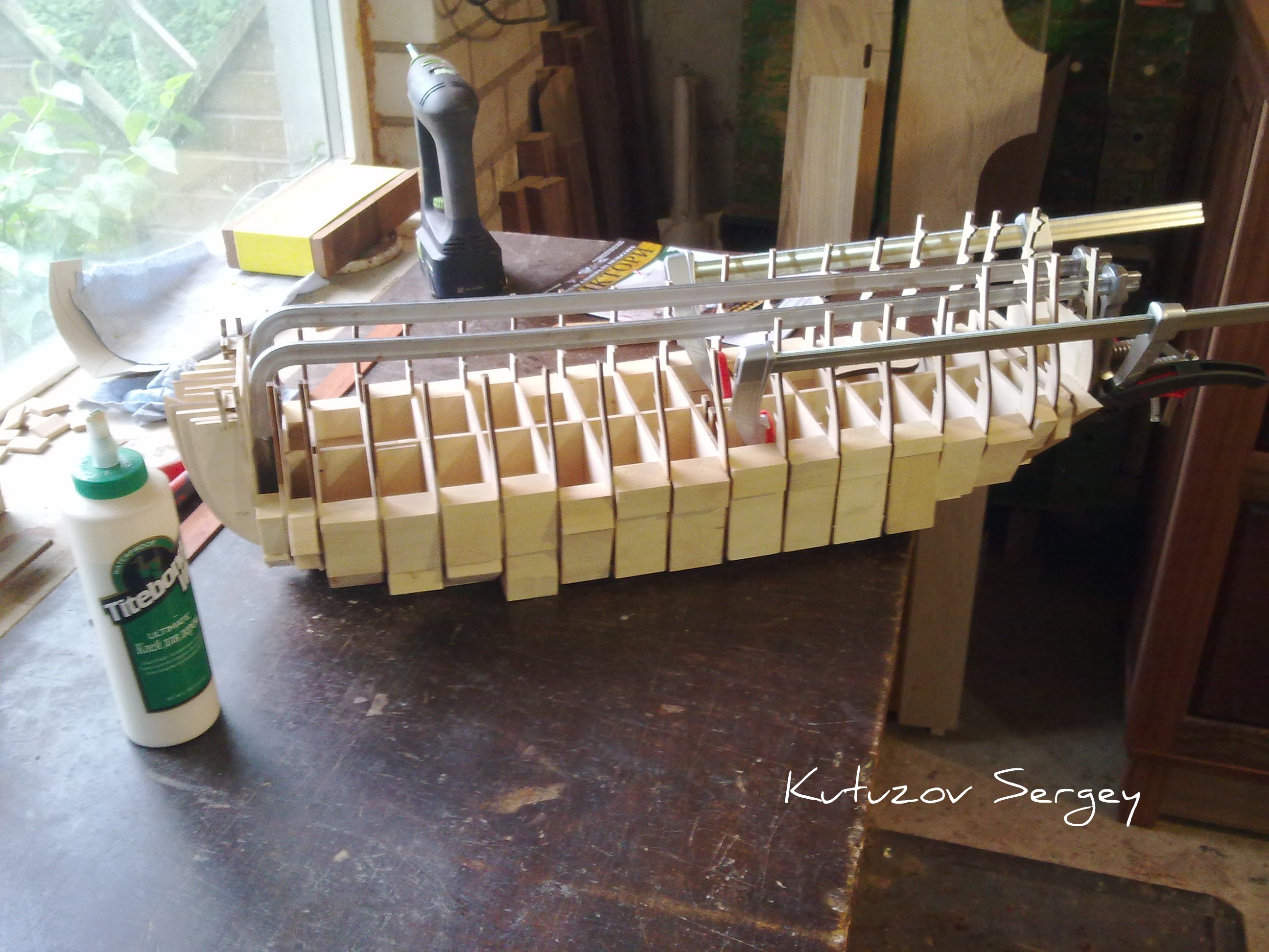 Склейку производил клеем Титебонд III в зеленой упаковке. Он схватывается не так быстро как обычный ПВА и дает возможность не торопясь нанести клей на все детали, подогнать все по месту и стянуть струбцинами. Через час первая пара шпангоутов была готова. По такому же принципу подгонял и клеил остальные.