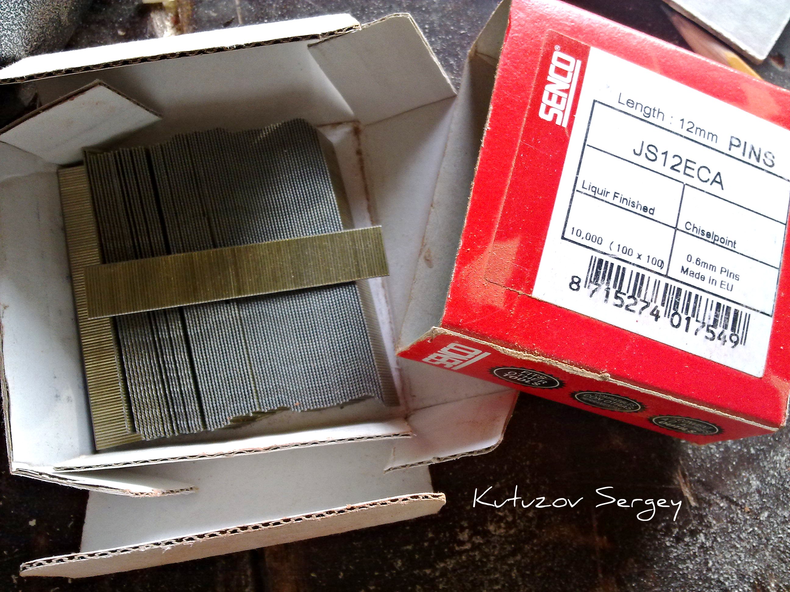 Т.к. гвоздаря у меня нет, решил использовать пневматический автоматический "гвоздарь". Включает в себя компрессор и 2 пистолета - один для гвоздей со шляпками различной длины и сечения, второй для шпилек без шляпок с заостренным концом. Пробивает легко дубовую пятидесятку. Я взял шпильки, т.к. нагрузка небольшая и фанерка палубы тонкая их вполне будет достаточно для удержания на момент приклеивания. Шпильки выбрал длиной 12 мм сечением 0,6 мм. В коробочке 10000 штук. Стоит коробочка порядка 20 евро в Финляндии.