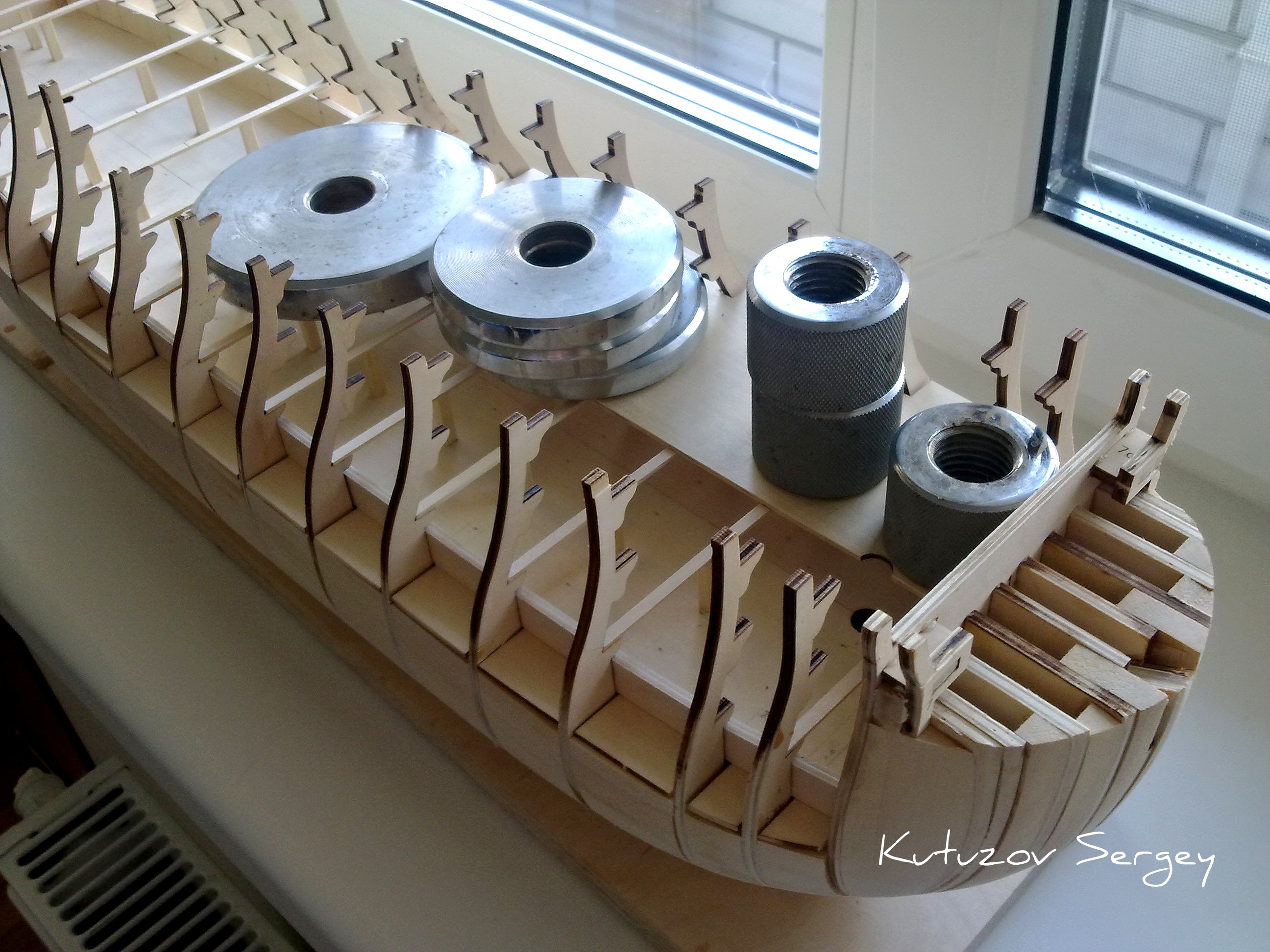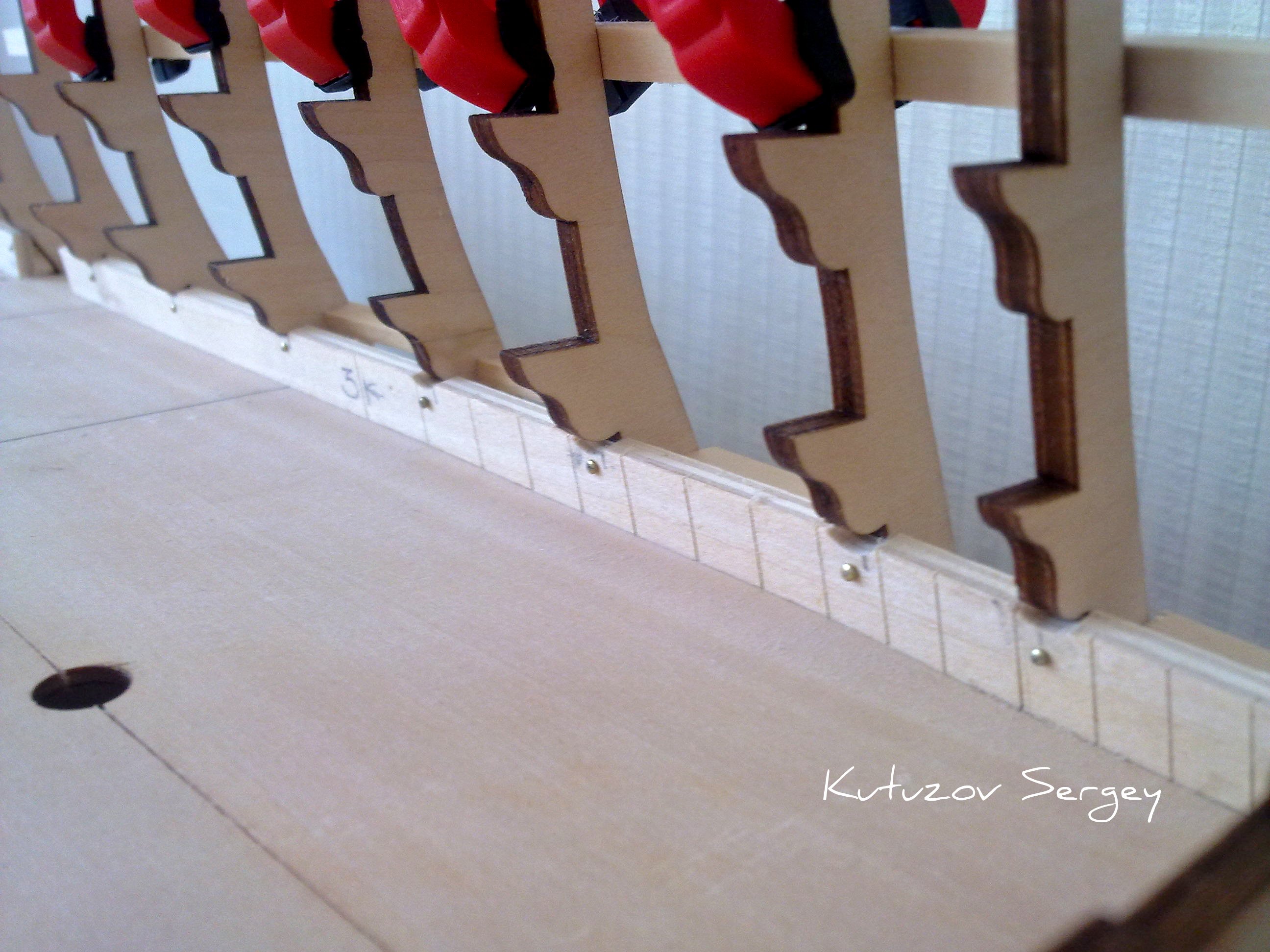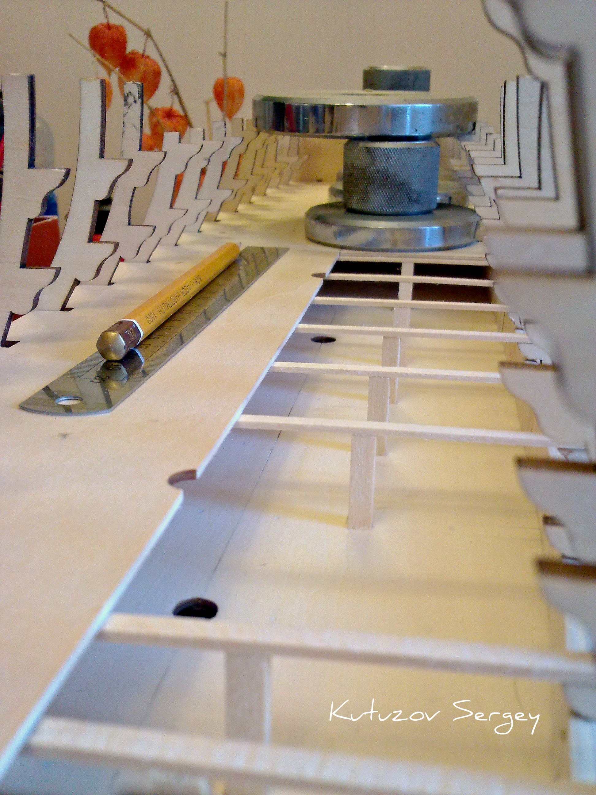 . Нанес клей на кромки шпангоутов, приложил симметричные половинки палубы и закрепил шпильками.