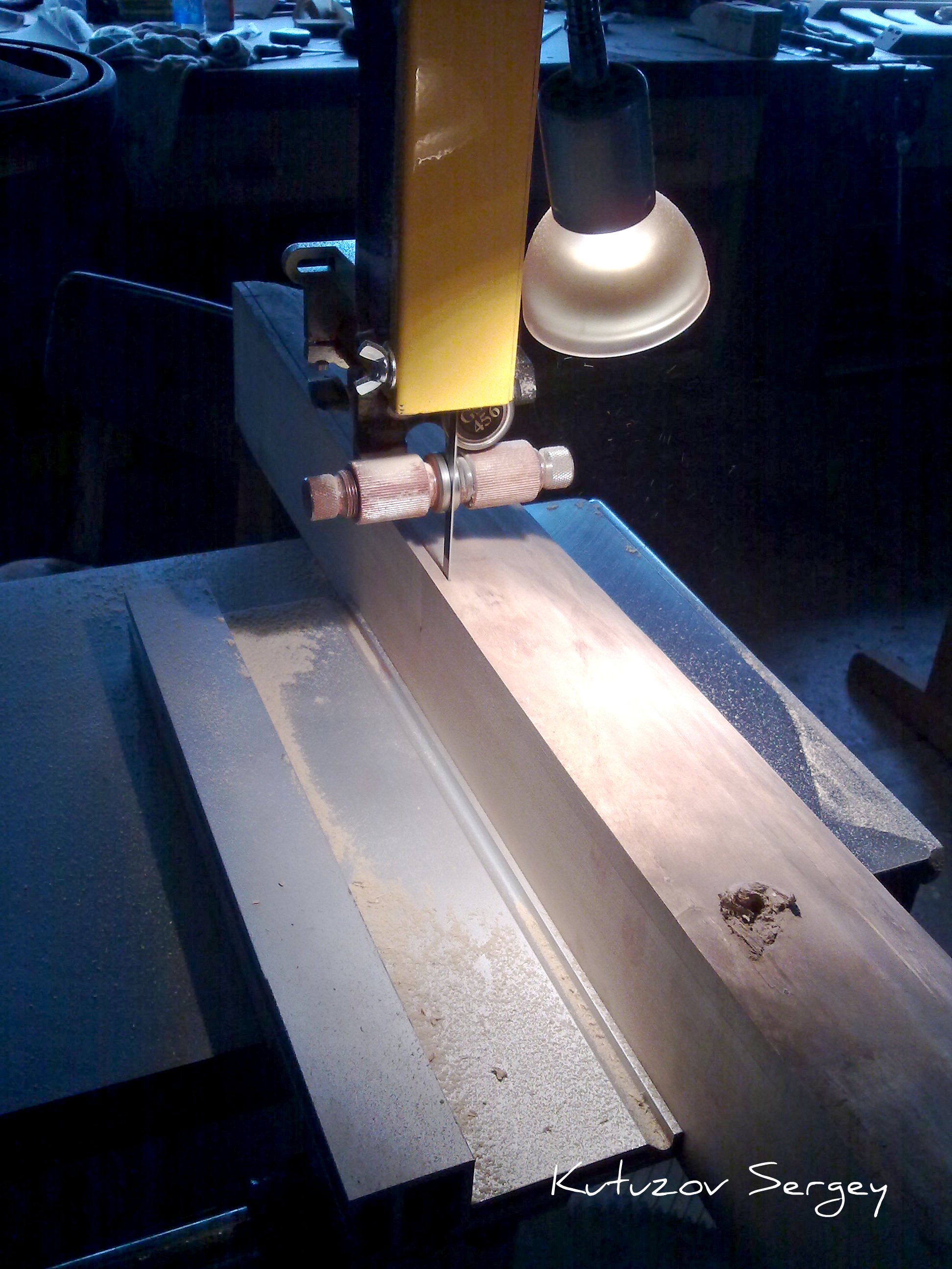 Отпили досочку 4 мм от бруска на ленточке. Судя по пилению древесина очень вязкая, по структуре напоминает орех, даже чуть помельче, но гораздо плотнее, очень тяжелое. Заготовочка для веретена готова. О дальнейших опытах с этой древесиной расскажу в будущем.