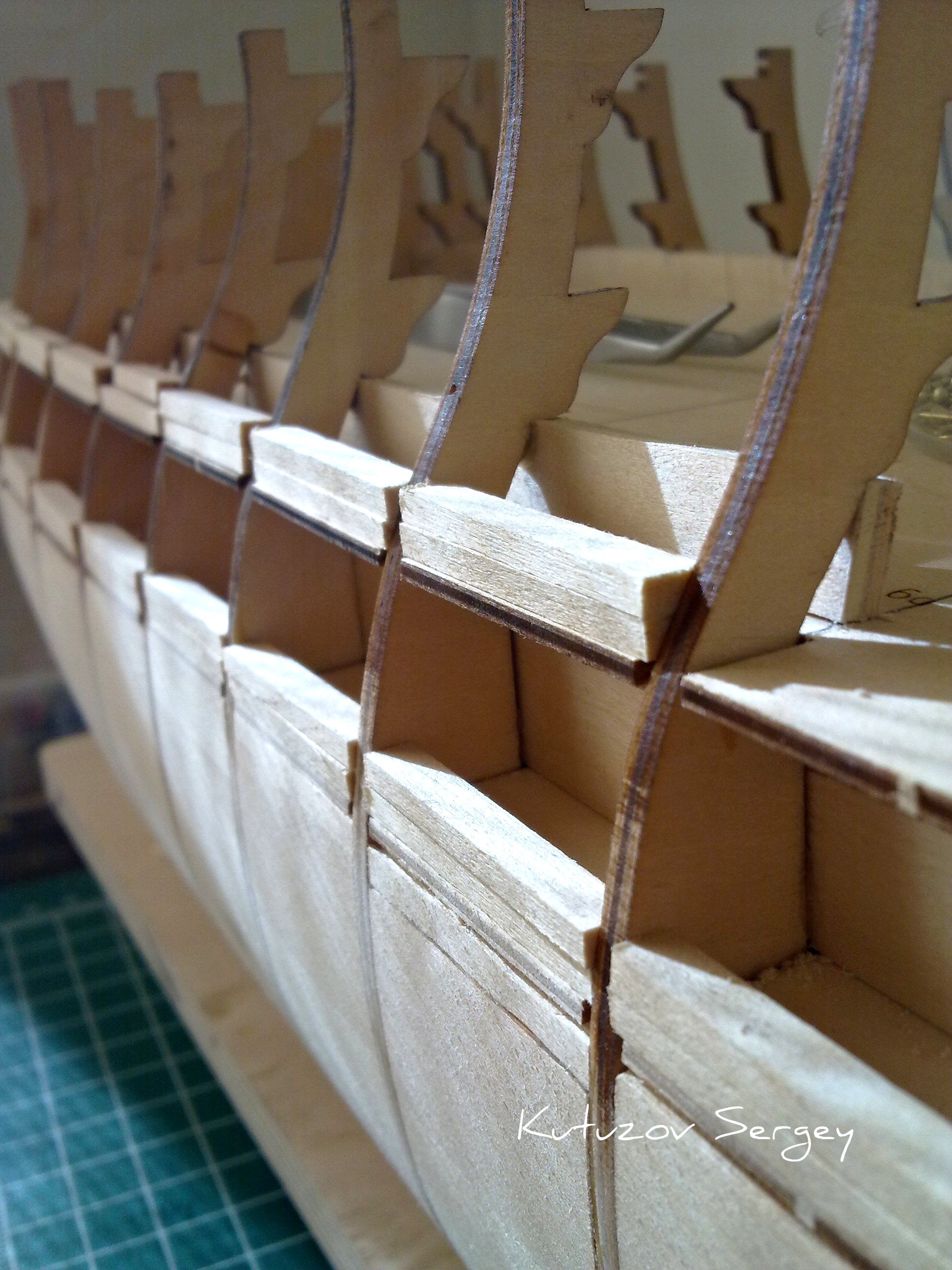 До монтажа палубных стрингеров второго яруса решил выправить топтимберсы, т.к. после установки стрингеров в проектное положение эту ситуацию выправить будет тяжело. А параллельность ветвей шпангоутов необходима.