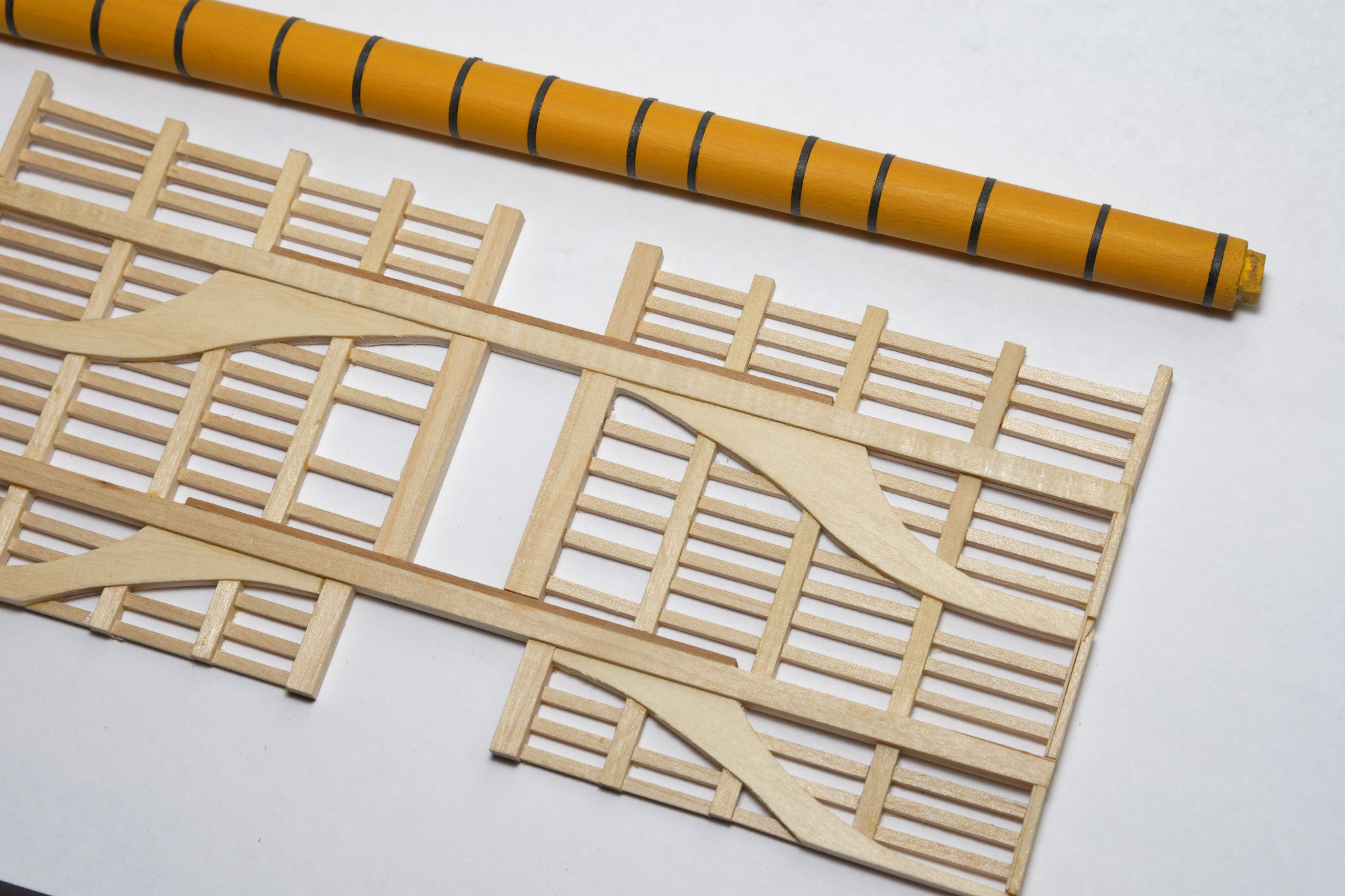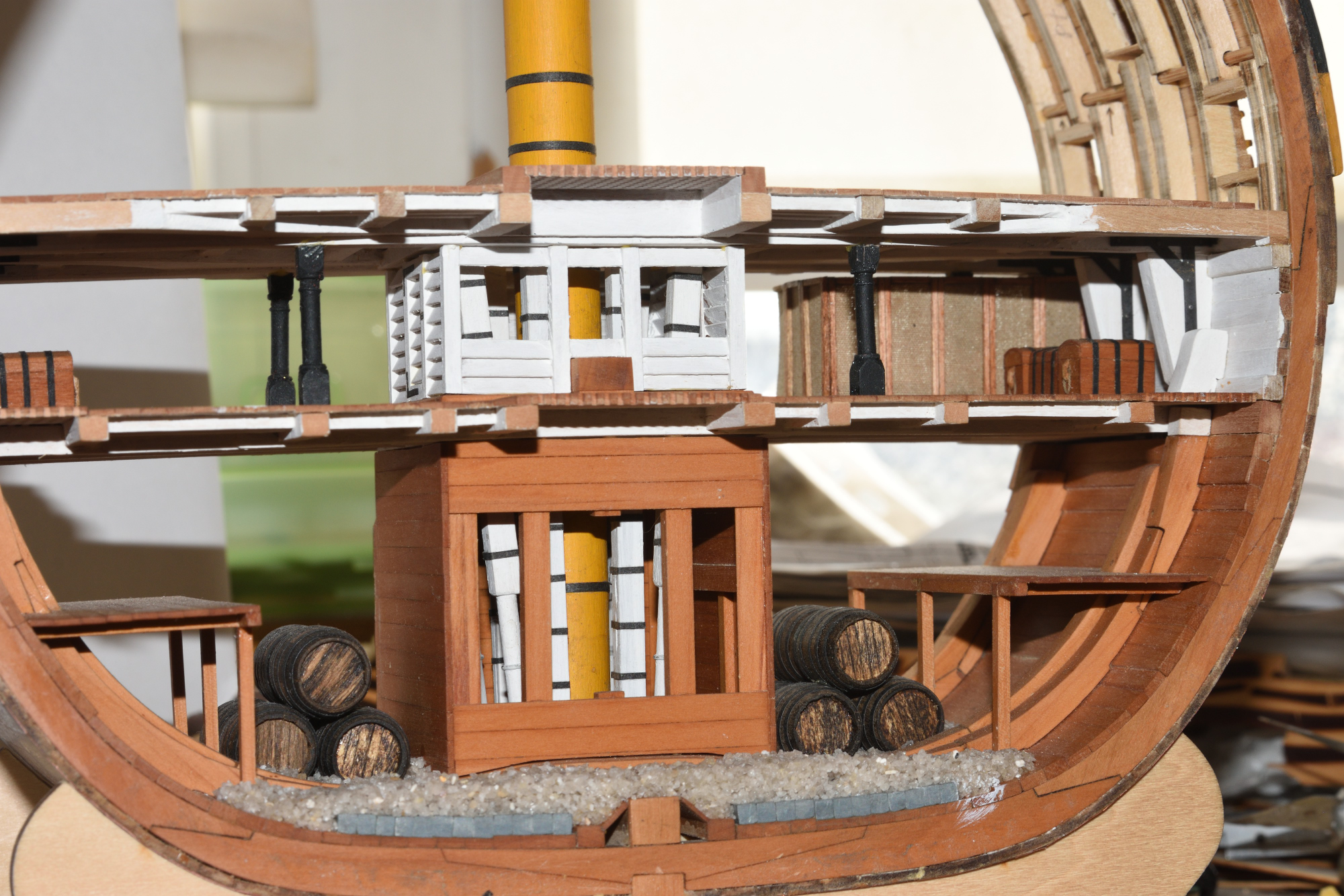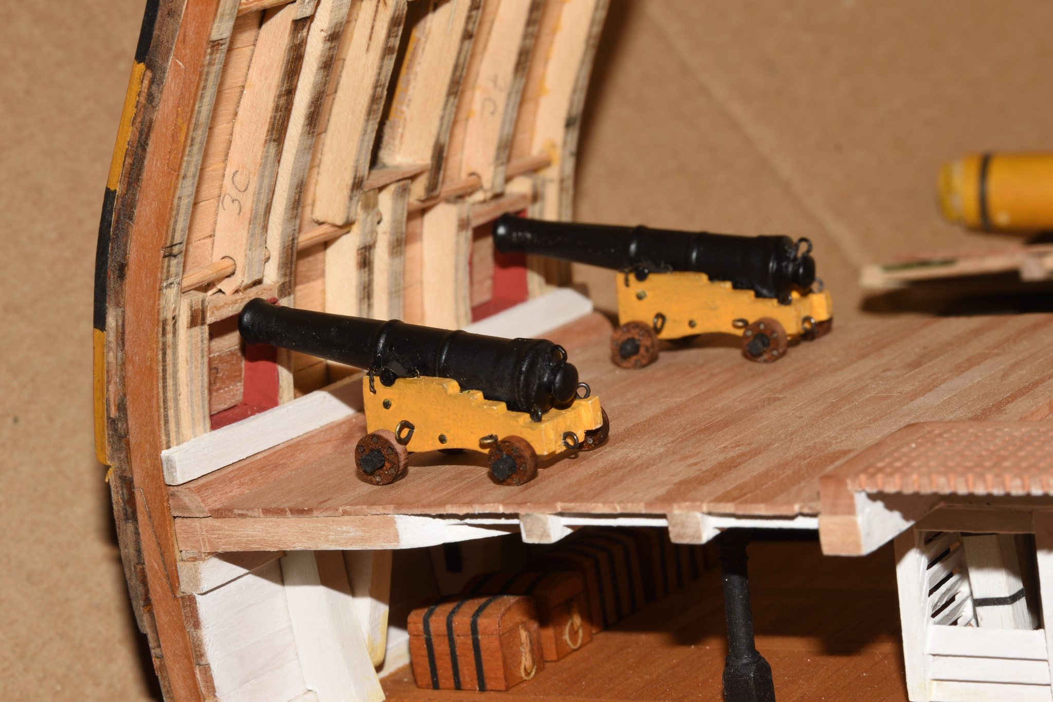 За отчетный период изготовил каркас мидель-дека и частично его обшил, плюс четыре пушки гон-дека. Станки и стволы из деагостиниевского набора, а вот колеса пришлось заменить, тк в наборе они все одинаковые, а в реале задние должны быть чуть меньше. Ну и детализацию набор предлагает куда проще.