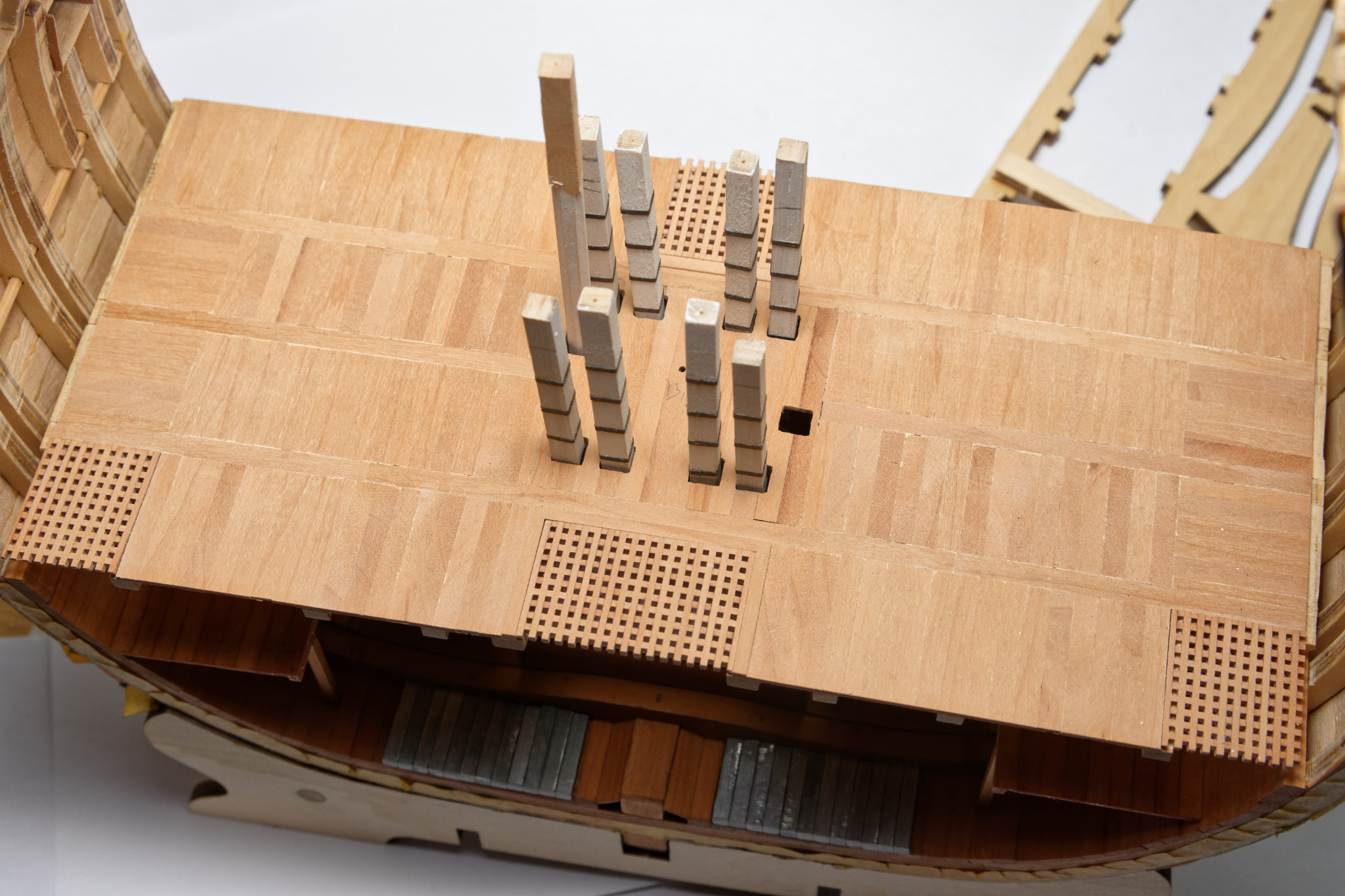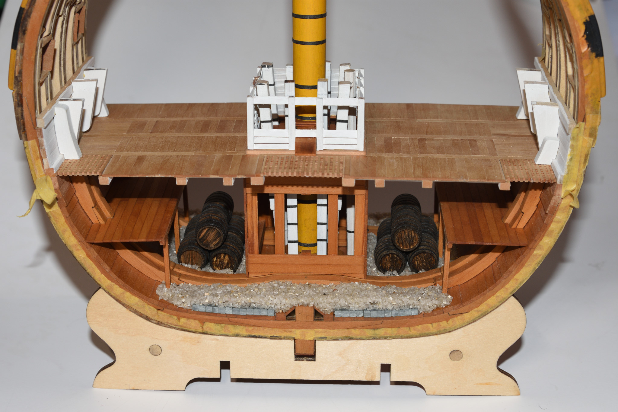 как я закончил с трюмом, вклеил на место орлоп-дек и доделал помповый колодец. Но по орлопу еще полно работы - сундуки, пиллерсы, переборка мичманской берлоги и прочее... И еще надо будет как-то вклеить железные кницы, раз уж делаю по Анатомии.