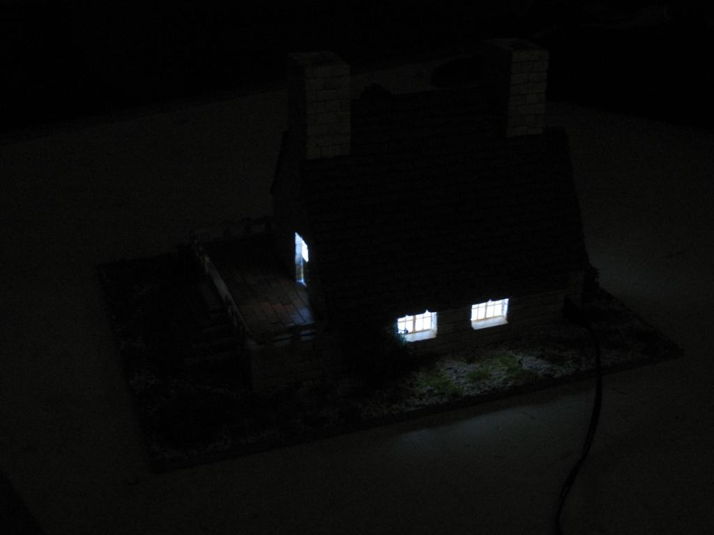 По набору: Кирпичей не хватило для изготовления как по инструкции. Немного поимпровизировал. "Щебенки" тоже маловато было, добавил камешков мелких. С окнами вот пролетел немного, надо было бы их до кирпичей клеить. Стекла не делал. Со светом перебор немного, были в наличие диоды от "рекламмы" белые. Пробывал татонировать желтым не понравилось свечение, оставил как есть. Когда собрал полностью, осознал ошибку.