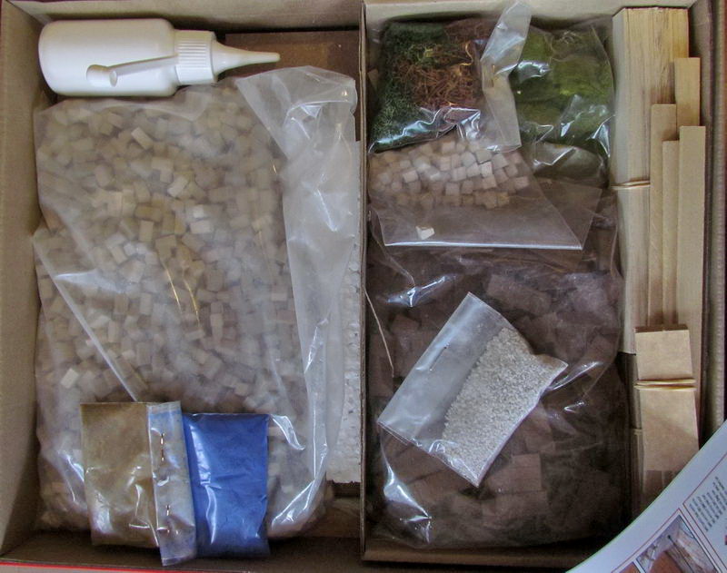 Вот пожалуйста, наполнение коробки. В коробке присутствуют: поэтапная схема сборки картонного каркаса, цветная схема сборки отдельных элементов, вырезанные из картона элементы каркаса, которые остается только согнуть, два листа МДФ для основания, разнокалиберные рейки и бруски для деревянных элементов конструкции, огромный пакет с кирпичиками, чуть поменьше с черепицей и совсем маленький с плиткой, пакетик с гравием для дорожки, пакетик с травой и еще один с кустами, два пакетика с колером, пузырек с клеем. Вес коробки около двух килограмм. В общем содержимое внушает уважение, руки чешутся попробовать собрать, но пока есть другие дела.Станислав Кушнир писал(а):Хотелось глянуть в середину коробки. Как это все выглядит в разобранном виде. А так здорово!