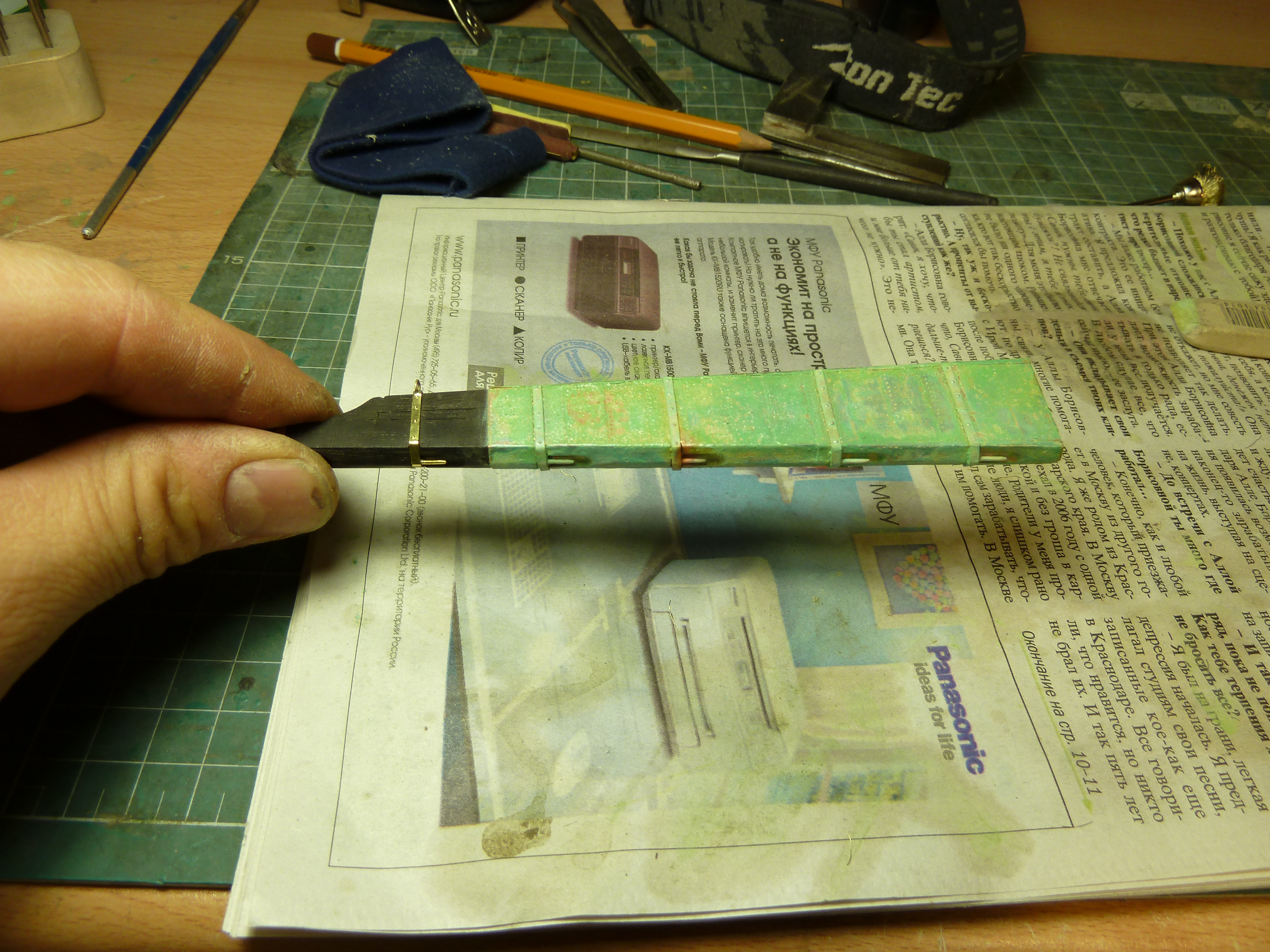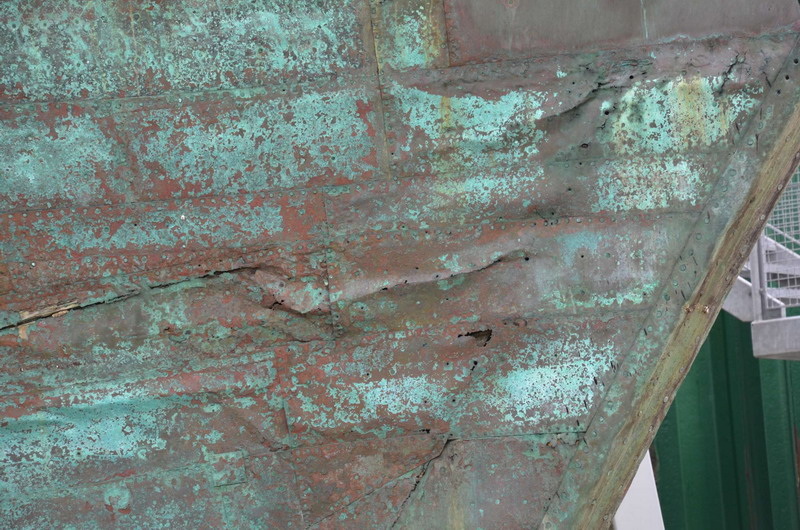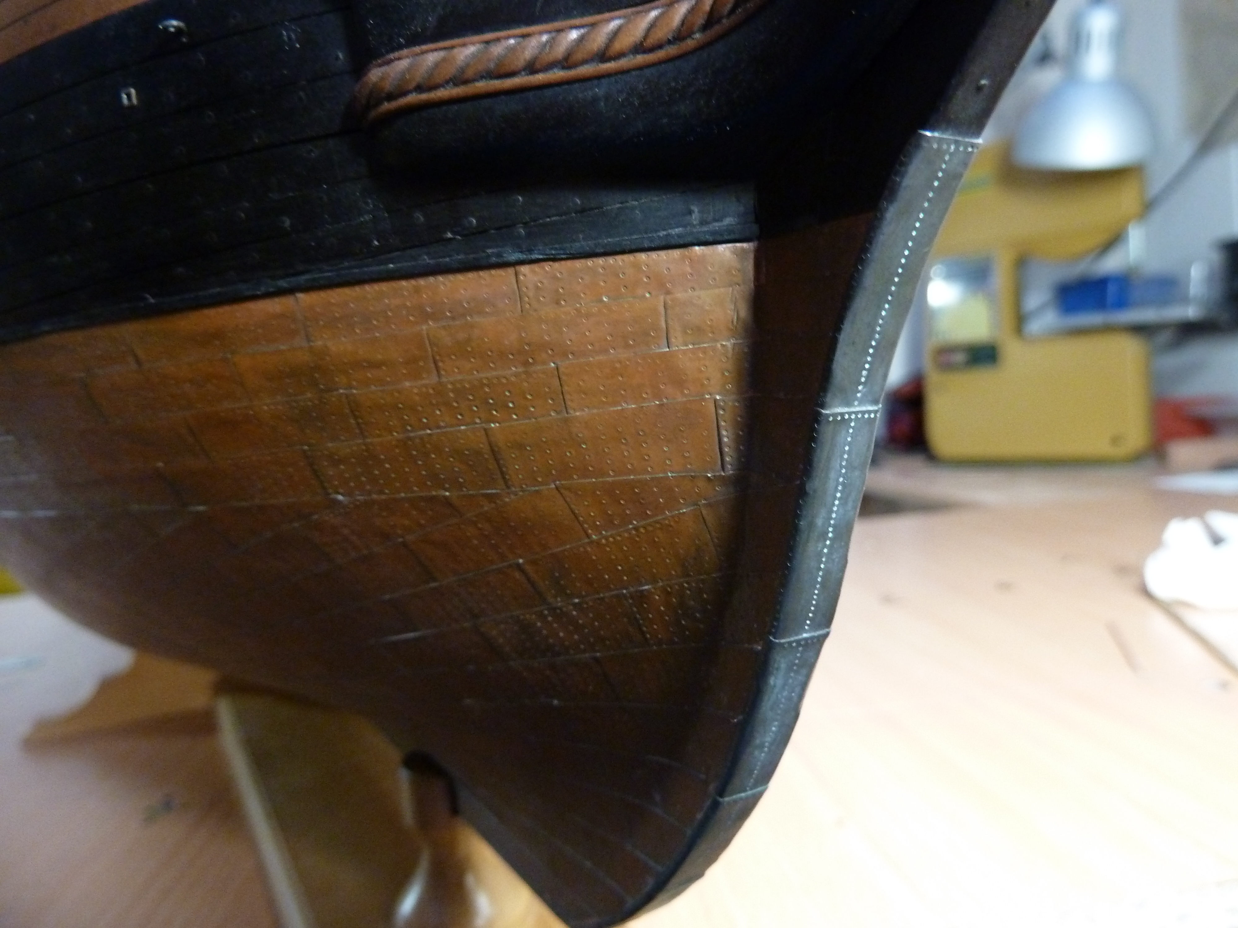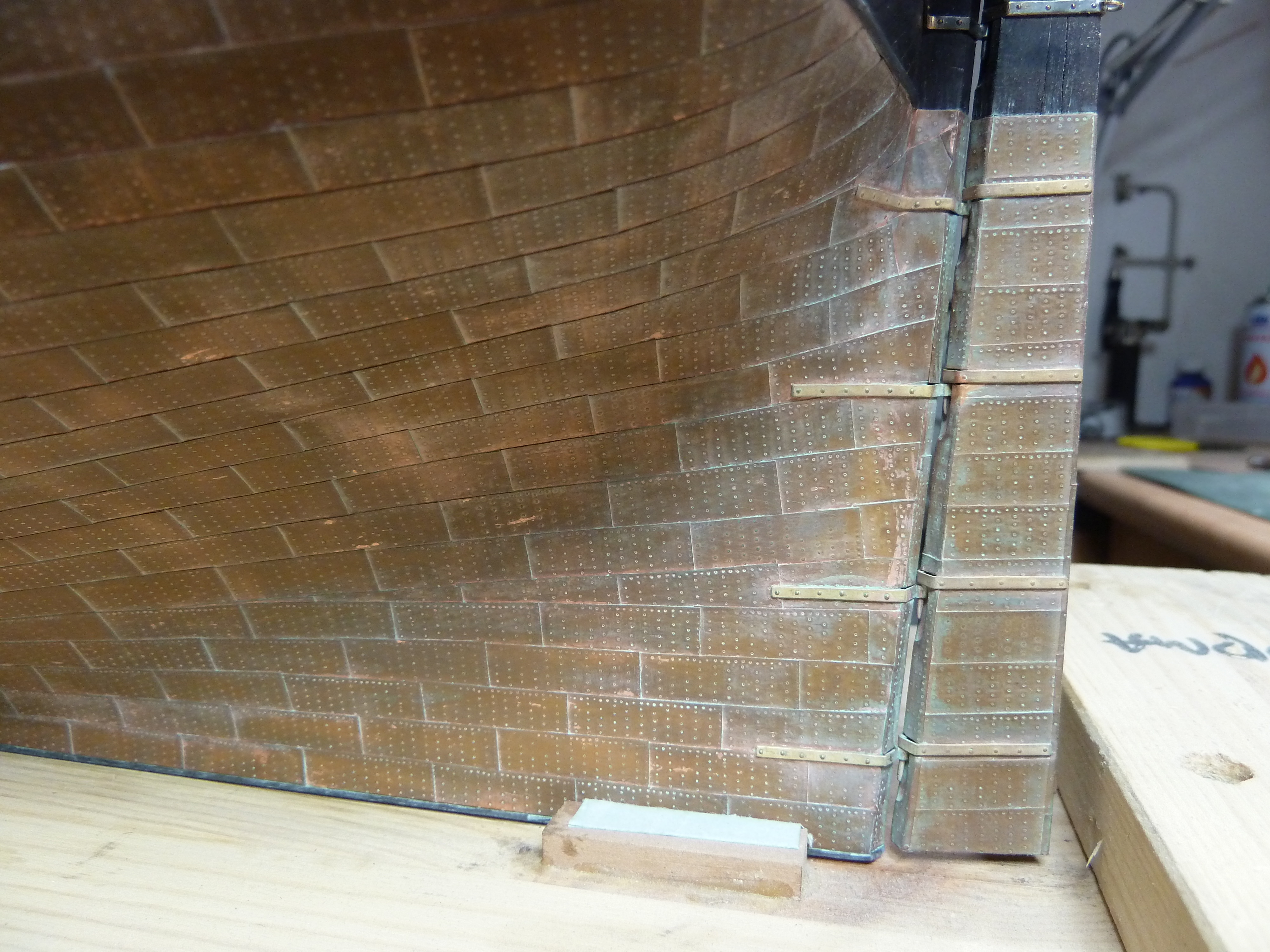 Вот так медь выглядит сейчас. Прошел год. Можно наверное не стирать налет и тогда модель будет как корабль на снимке выше. Форштевень на кораблях обивался свинцом, я заменил листами из раскатанного припоя.