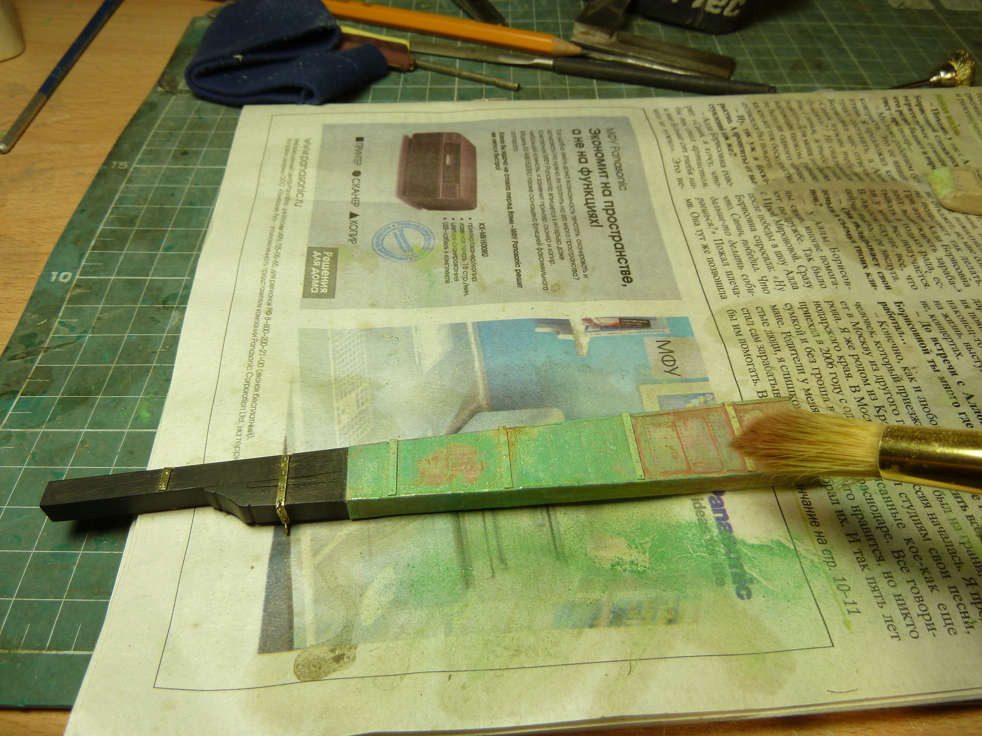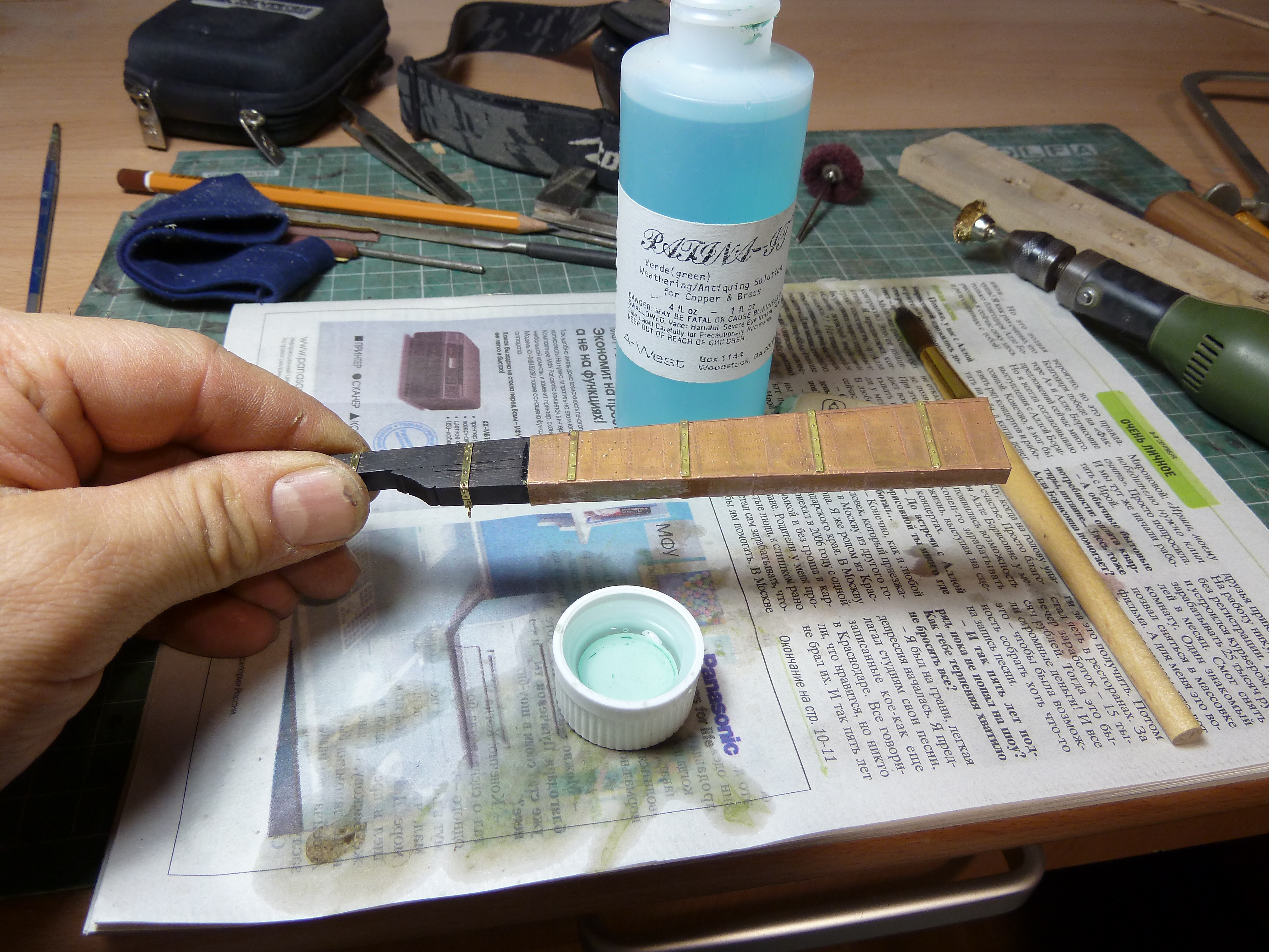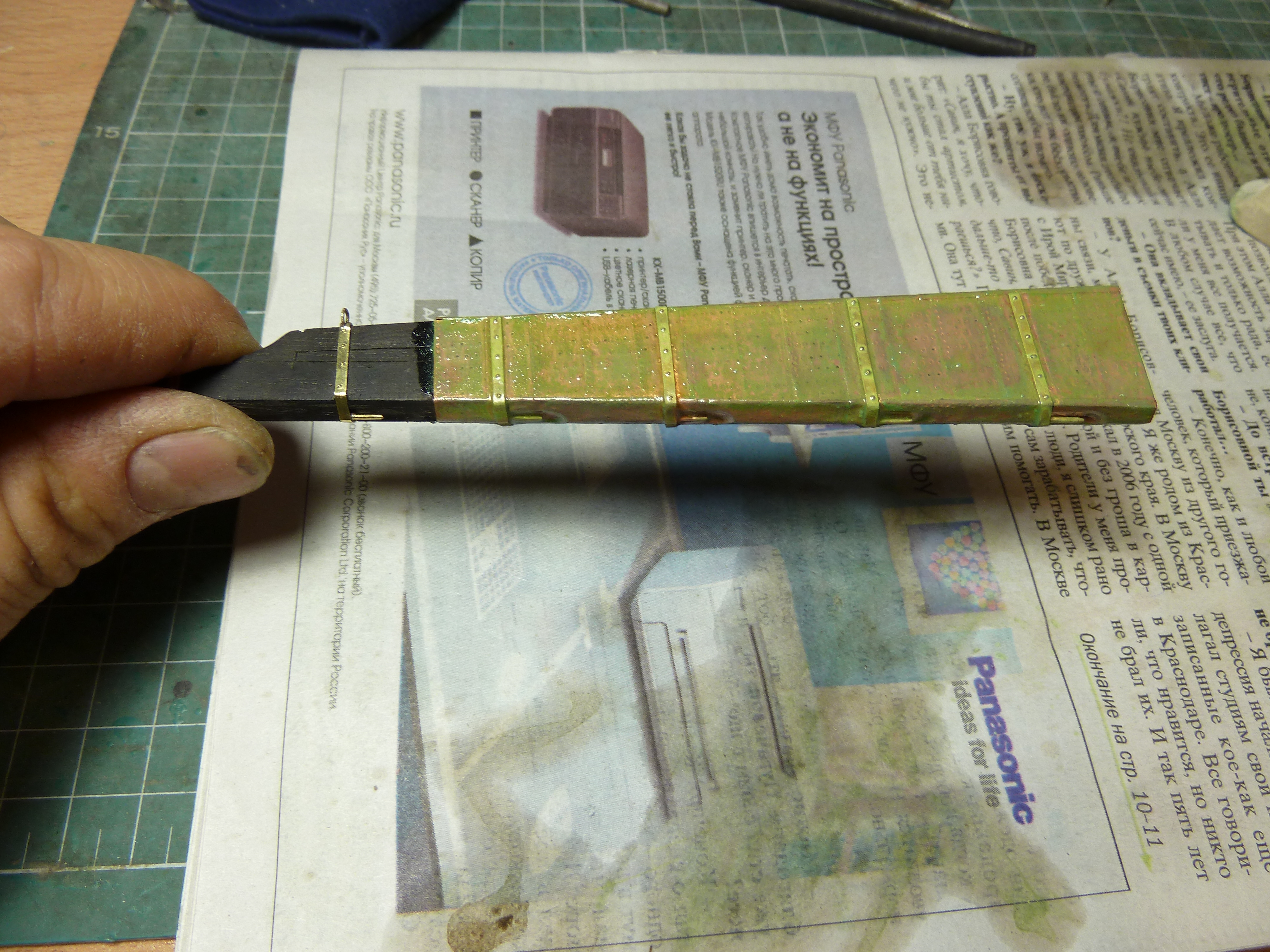 Вот так медь выглядит сейчас. Прошел год. Можно наверное не стирать налет и тогда модель будет как корабль на снимке выше. Форштевень на кораблях обивался свинцом, я заменил листами из раскатанного припоя.