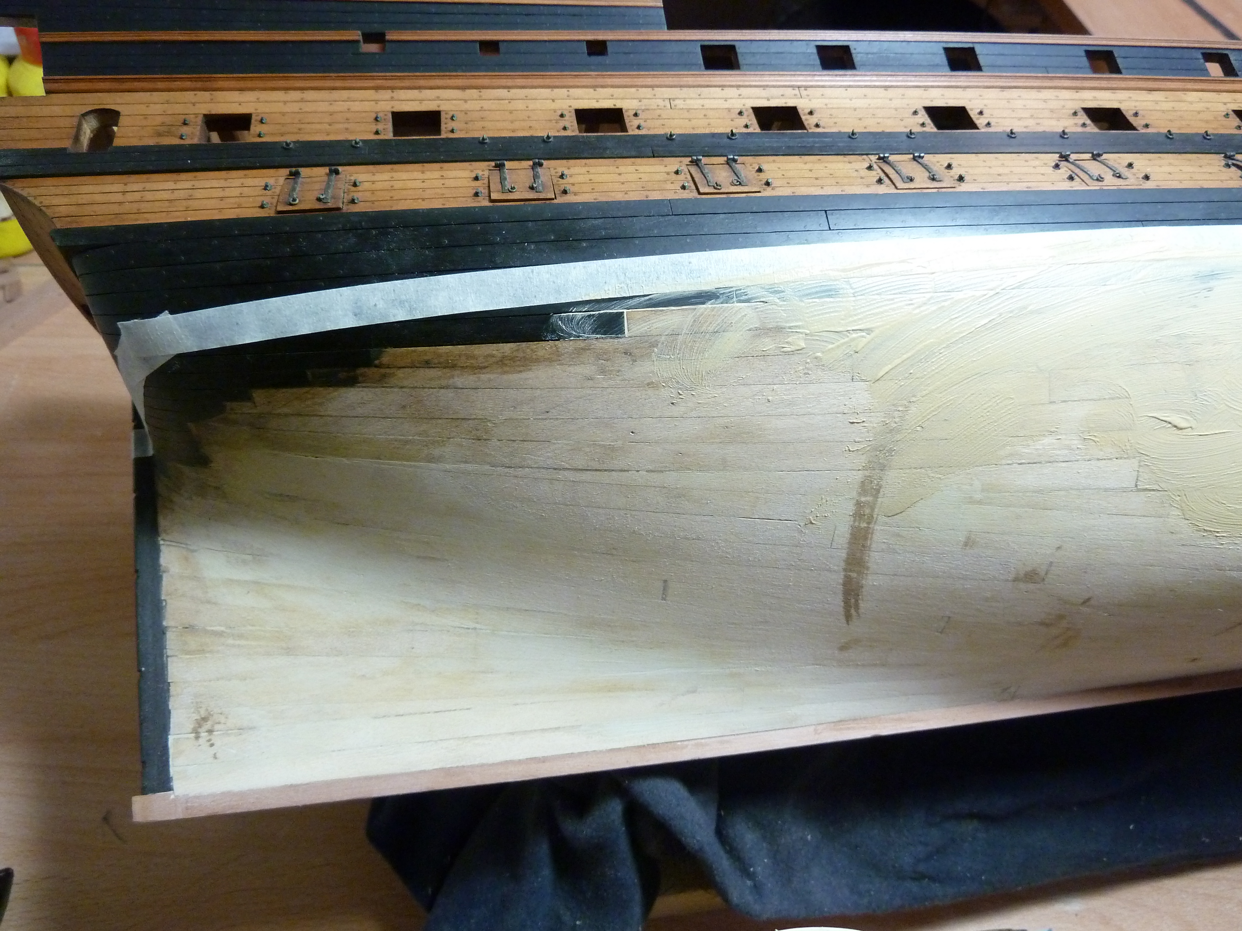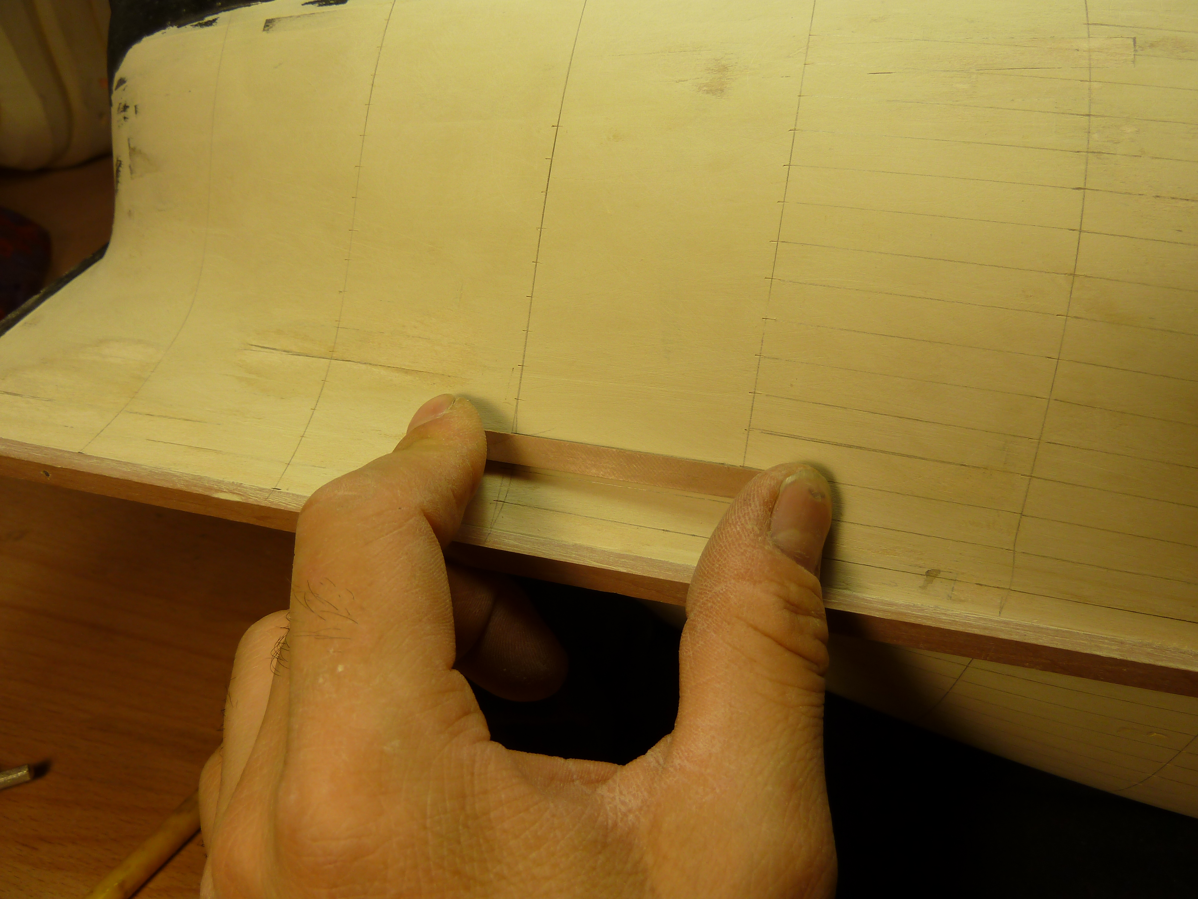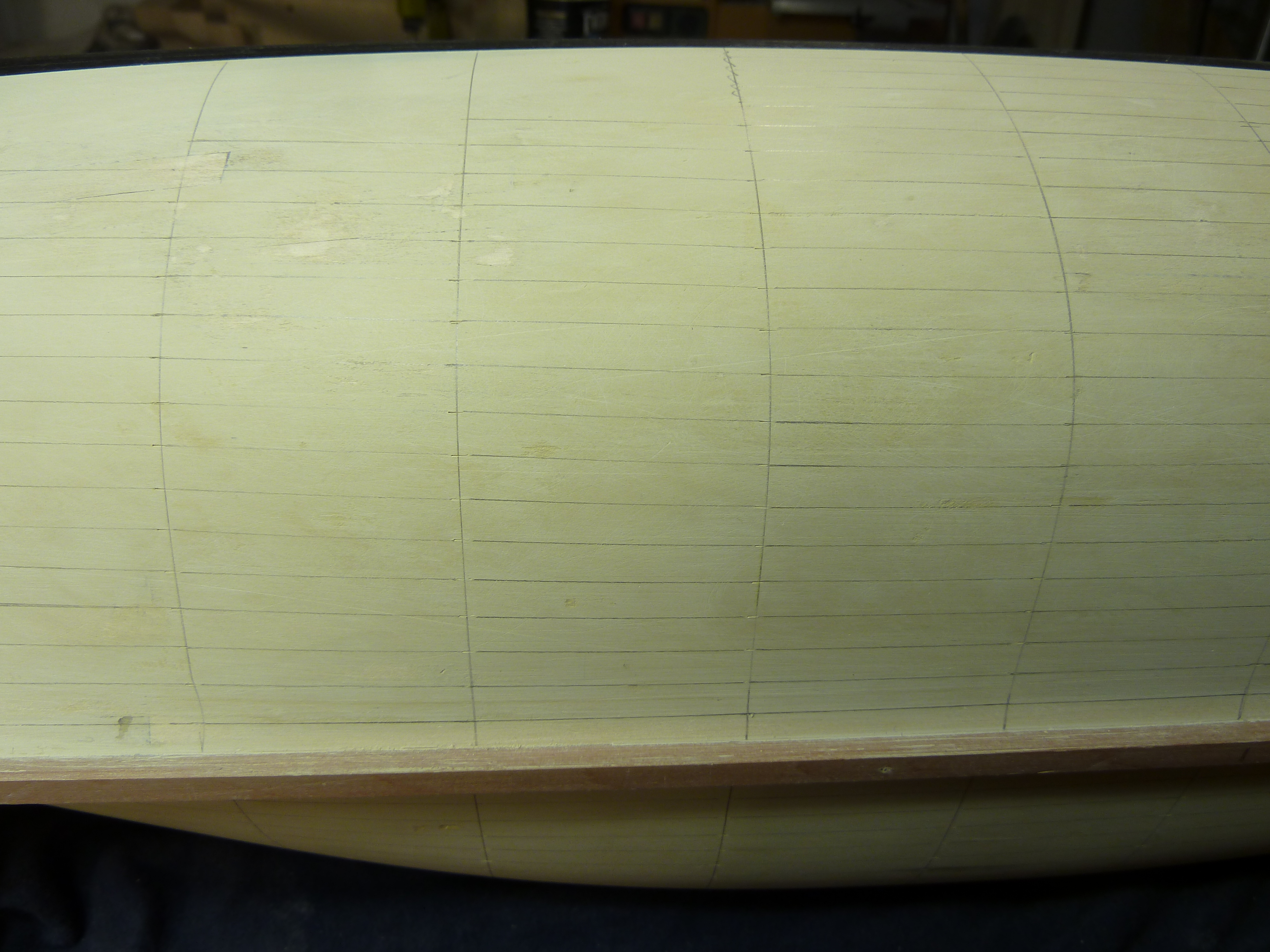 Однако продолжаем. Поверхность под медь должна быть совершенно гладкая, поэтому всё сплошь шпаклюется и зачищается. Я наносил шпаклевку просто пальцами. Так получается меньше горбов, особенно если после растереть поверхность смоченной ладонью. Теперь главное правильно разметить. Выбрал одну из французских схем обшивки где верхние 4 пояса идут параллельно ВЛ, к корме сходясь на нет, а остальные пояса идут параллельно килю без сужения. Лишь в корме пояса имеют два потеряйных пояса, иначе это место получается криво. Верхний участок размечаю от ВЛ. Нижний от киля. Для разметки изготовил из полоски картона шаблон с метками ширины поясов. Примерно через 50 мм начертил сечения и на каждом из них с помощью шаблона ножом дал метки. Потом с помощью короткой рейки карандашом соединил их. Линии получаются немного ломанные но тем не менее в целом плавные и позволяющие оценить всю работу.