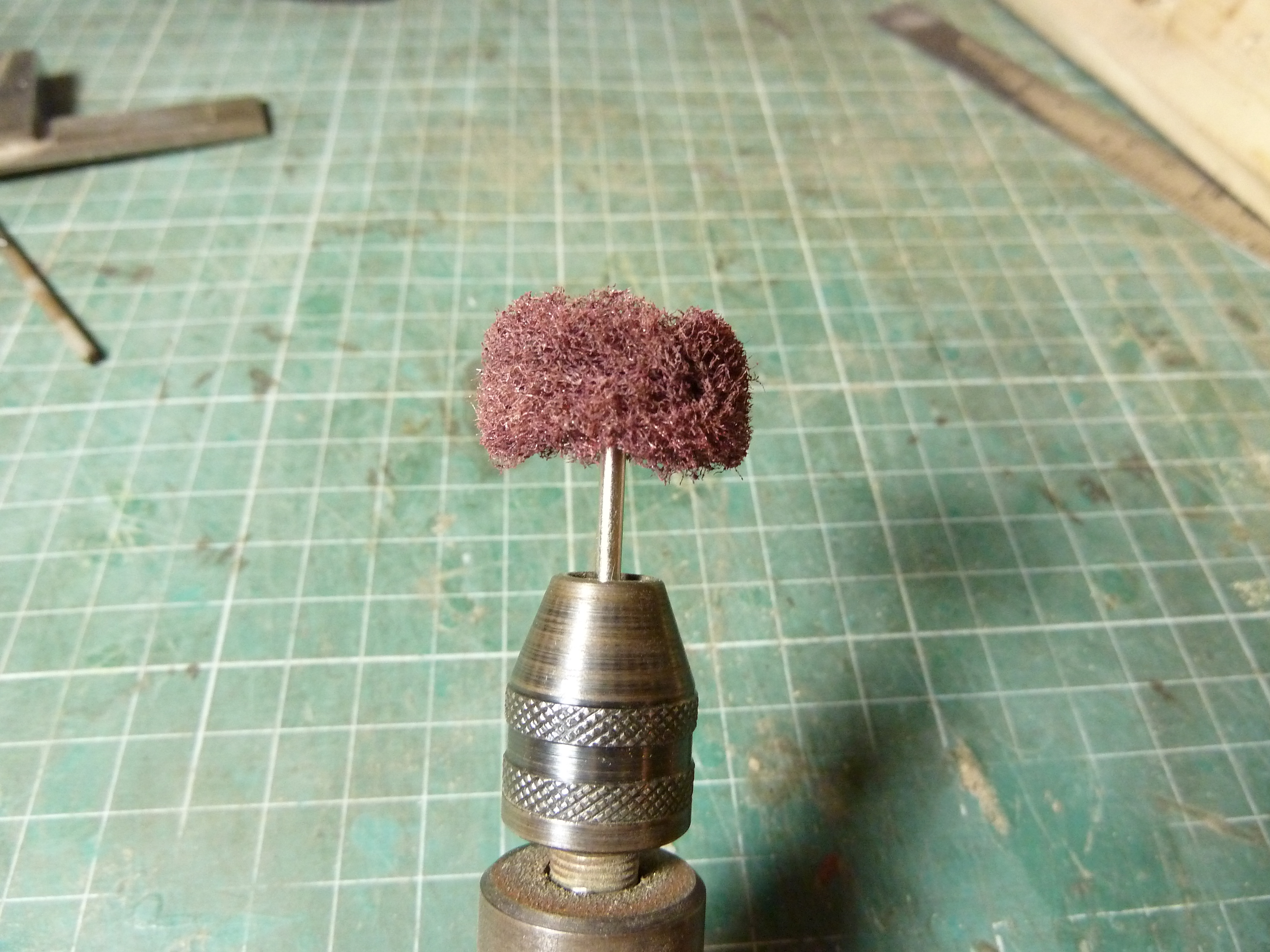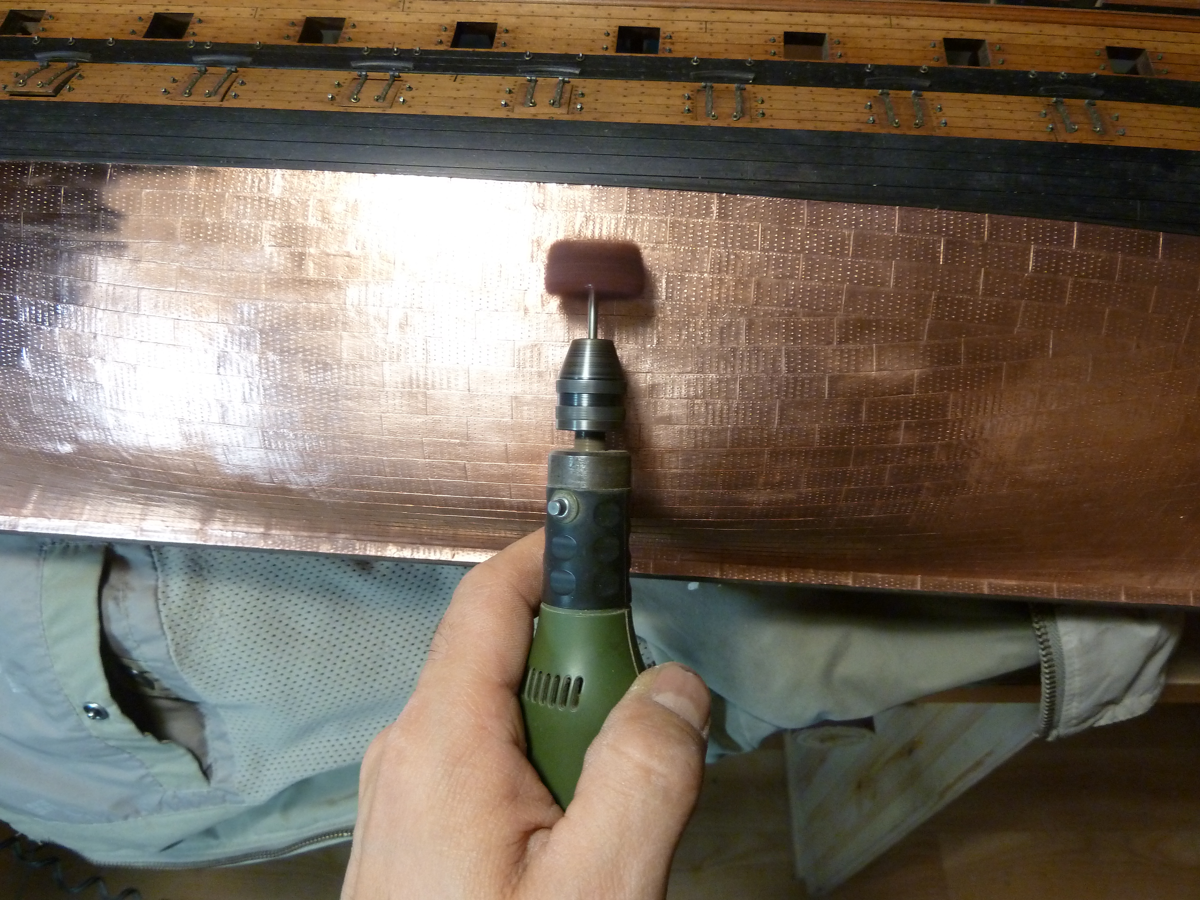 Наклейку начинаю с кормы, от ВЛ на жидкий циакрин. Первые листы согласно схеме сходят на нет, поэтому.их приходится обрезать. Ватерлиния конечно должна быть уже нанесена. Перед тем как клеить обшивку следует наклеить направляющую полосу малярного скотча. При наклейке ориентируюсь только на метки. В общем скотч ложится плавно не обращая внимание на ломаную линию. Следующие пояса операция повторяется. Выступающий клей удаляется, но все равно потом придется внимательно все подскабливать, так как патина на клей не ложится. Перед патинированием предстоит важная операция - подготовка поверхности Делать её нужно непосредственно перед покрытием, так как для него нужна совершенно чистая поверхность. Шлифовку делаю с помощью специальной насадки в бормашину. Что то типа скотчбрайта, только на хвостовике. Уходит на модель около 4 - 5 шт. Шлифовка происходит мягко, по всей поверхности, обходя даже неровности. При этом следы клея пачкаются и делаются хорошо заметными для удаления. Обязательно нужно учитывать направление наклейки листов, то есть не шлифовать против шерсти. Непосредственно перед покрытием вся поверхность обработана жидкостью для удаления засоров, то есть щелочью. Процесс патинирования несложен. Нужно кистью нанести жидкость на поверхность, подождать когда высохнет образовавшийся густой зеленый налет и потом сухой кистью удалить его, оставив немного в стыках листов. Удалять налет нужно сразу, так как через некоторое время он крепнет. Сразу после покрытия медь розовато серая с зеленью. Примерно через полгода цвет будет красно коричневый.