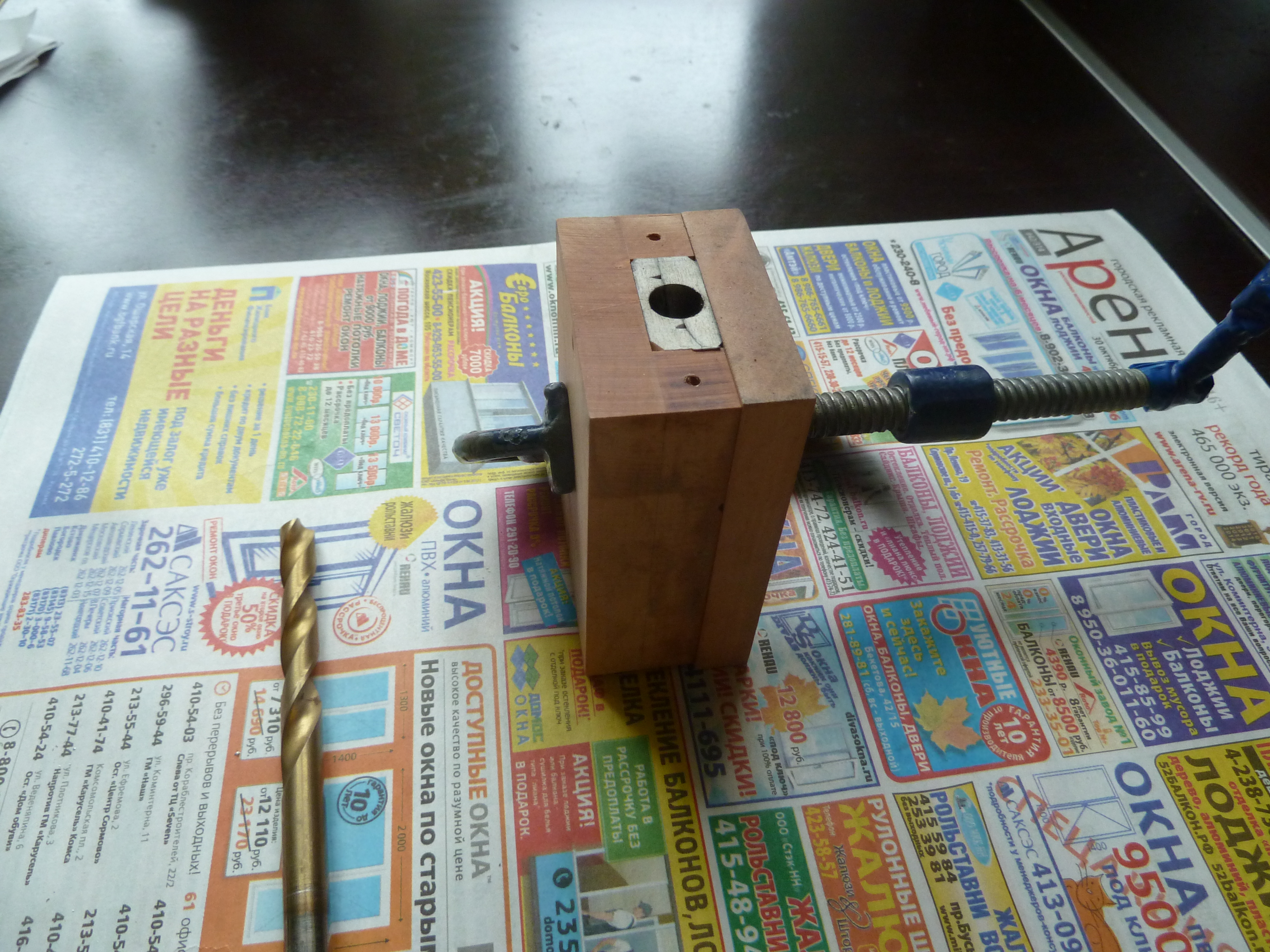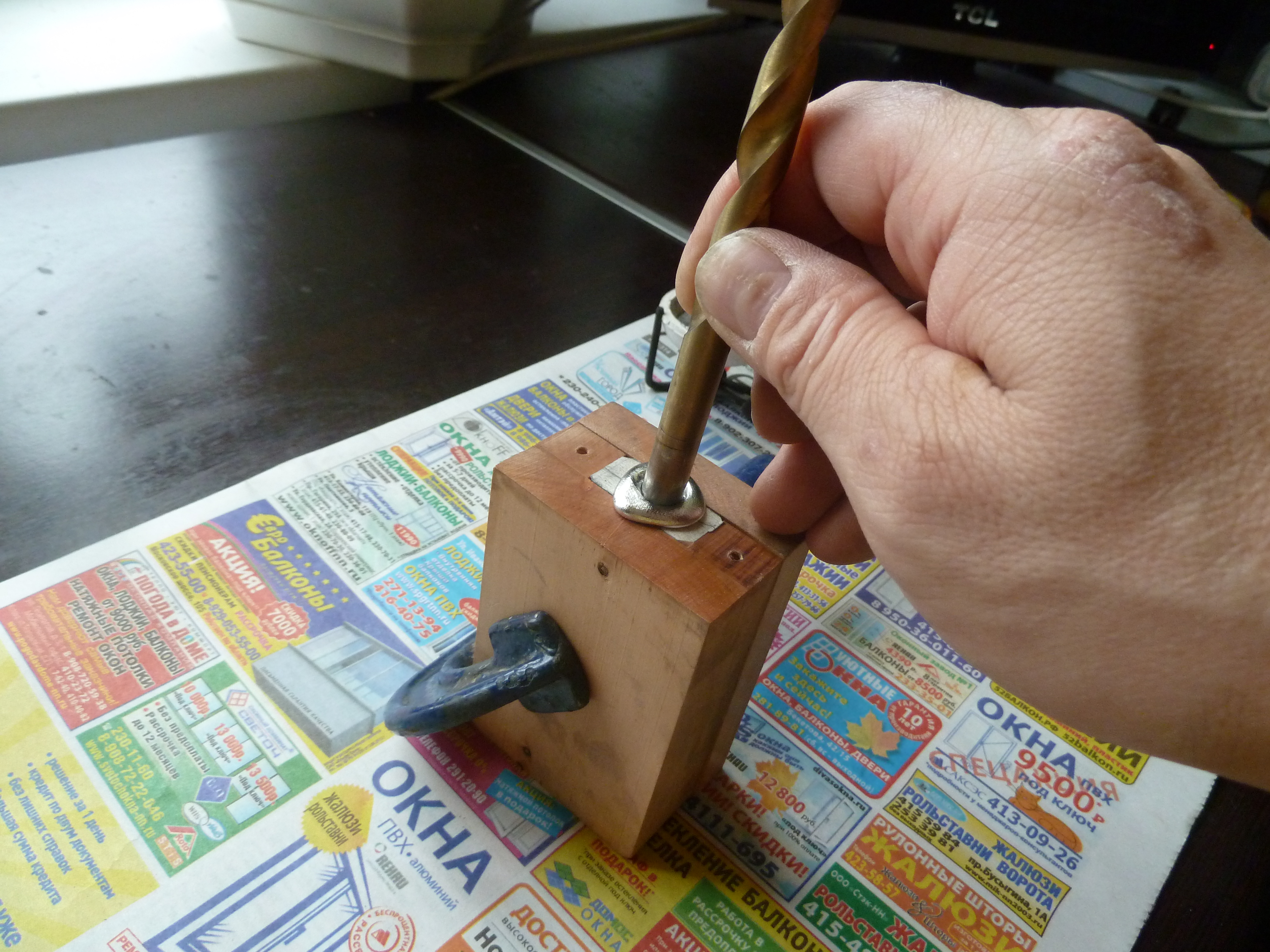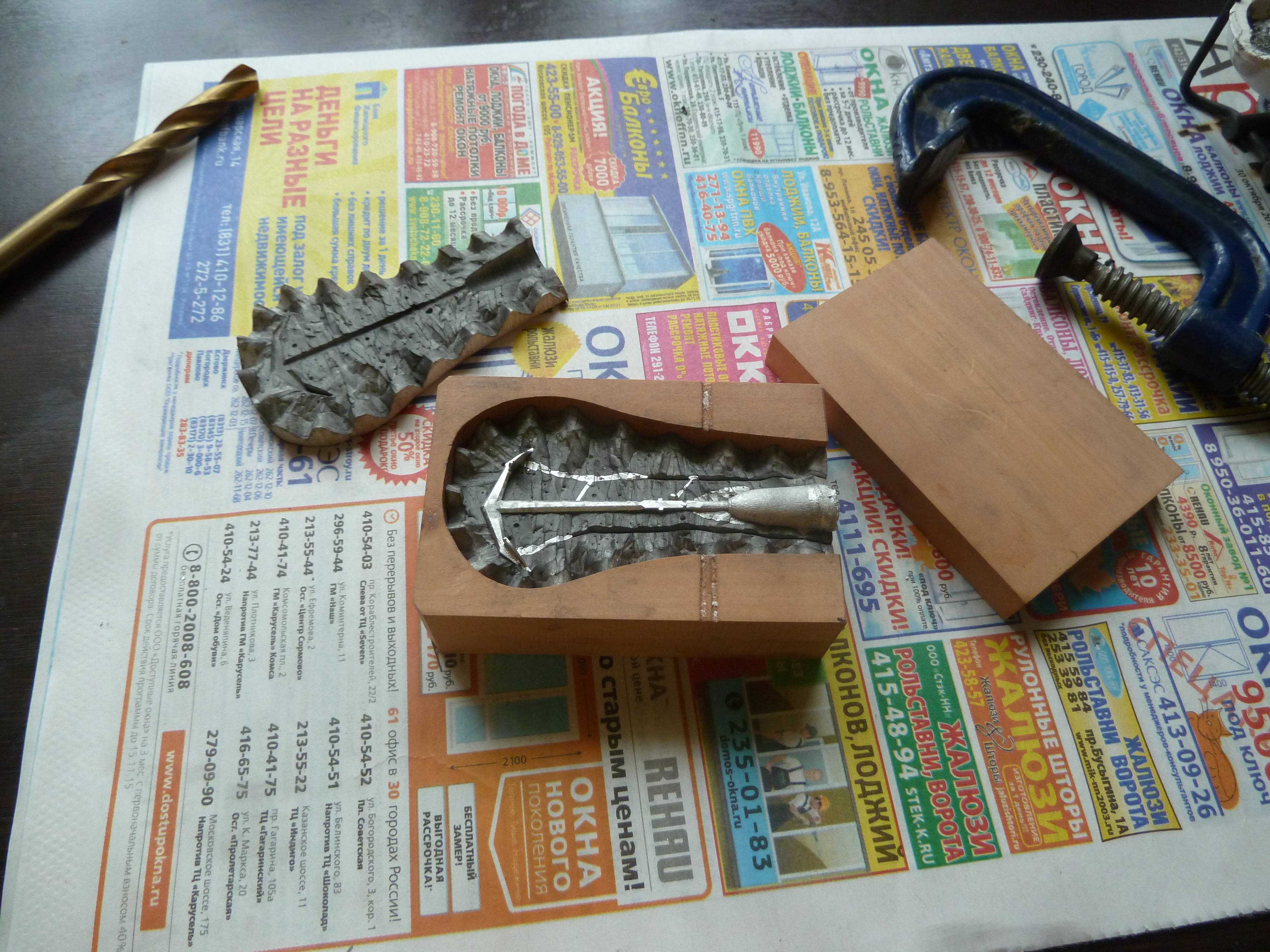 Резинку укладываю обратно в опоку и прижимаю струбциной стенку. Все, форма готова к литью. Первая отливка всегда в брак, так как форма не прогрета. Начиная со второй, третьей попытки как правило получаются годные отливки. Для дополнительного давления металла сверлом чуть меньшего диаметра чем прибыль свежезалитый сплав продавливаю внутрь.