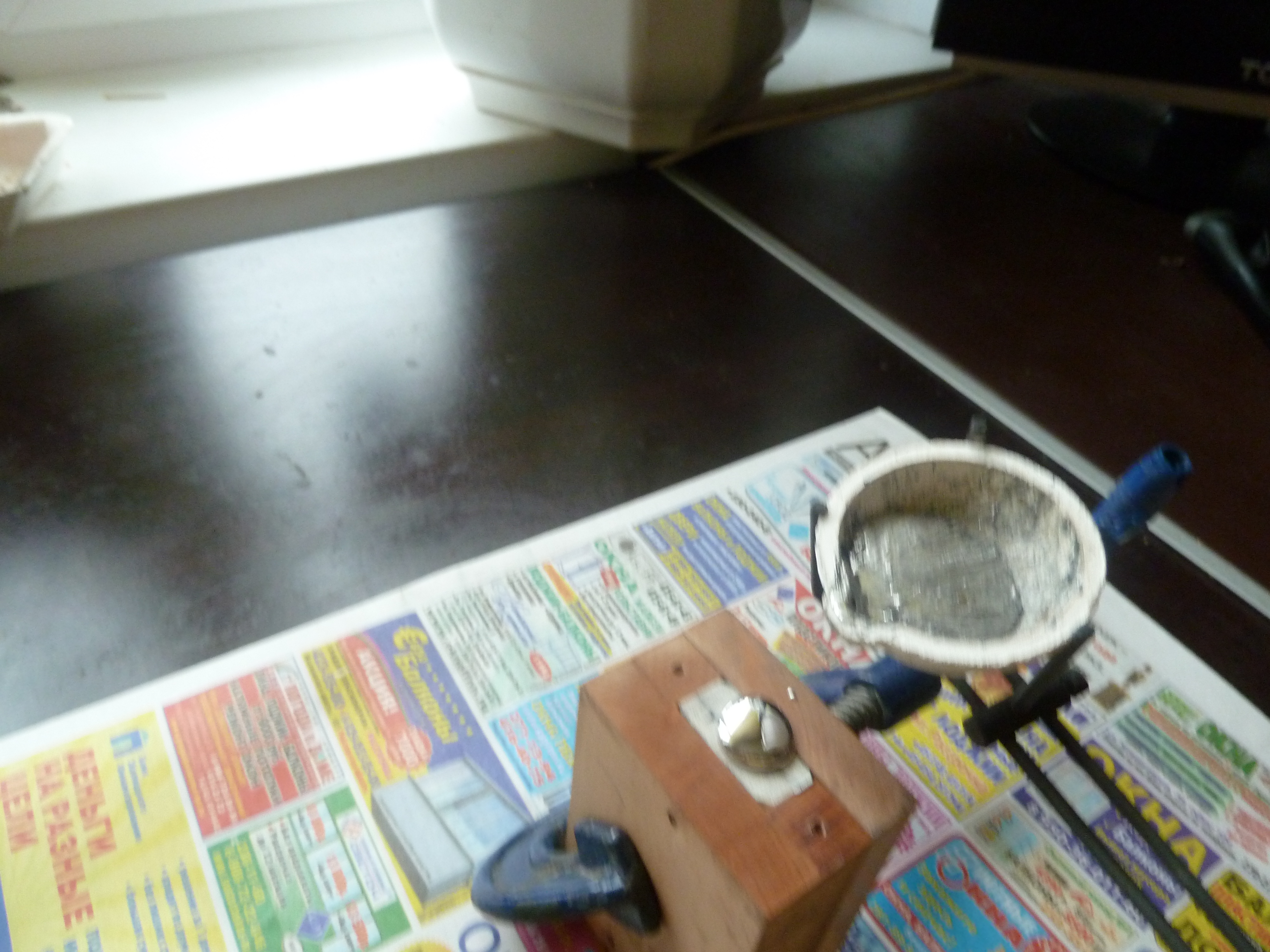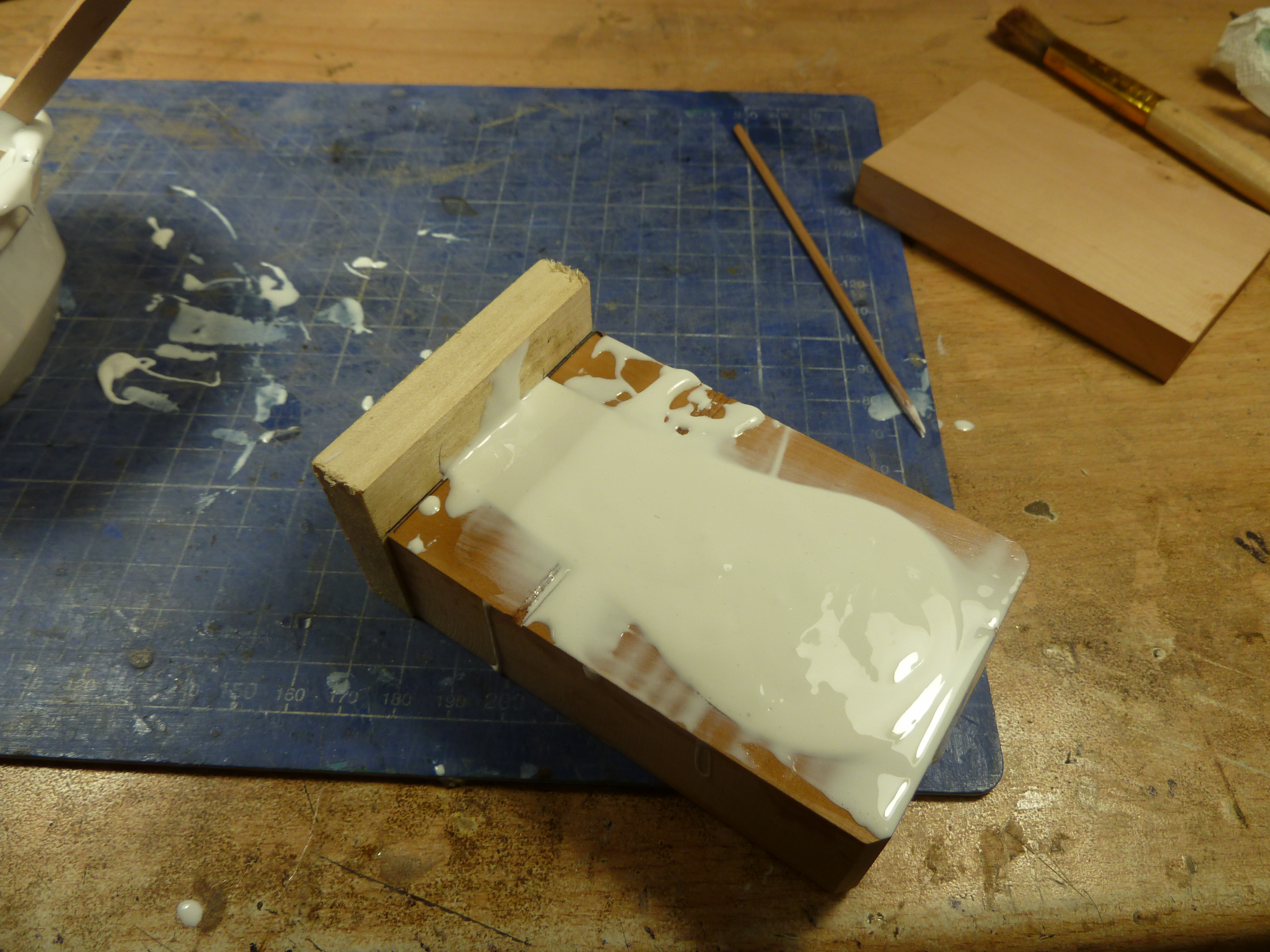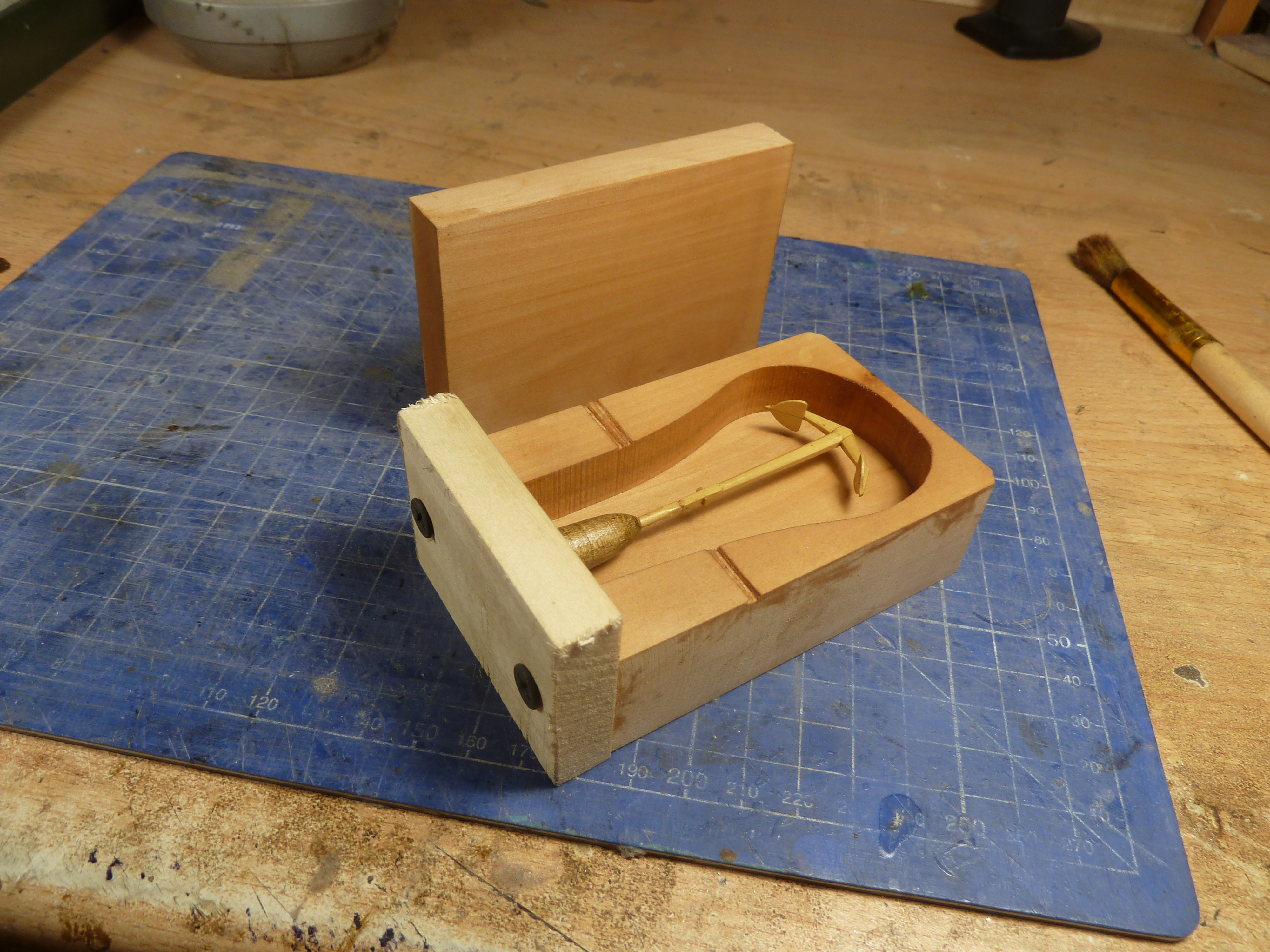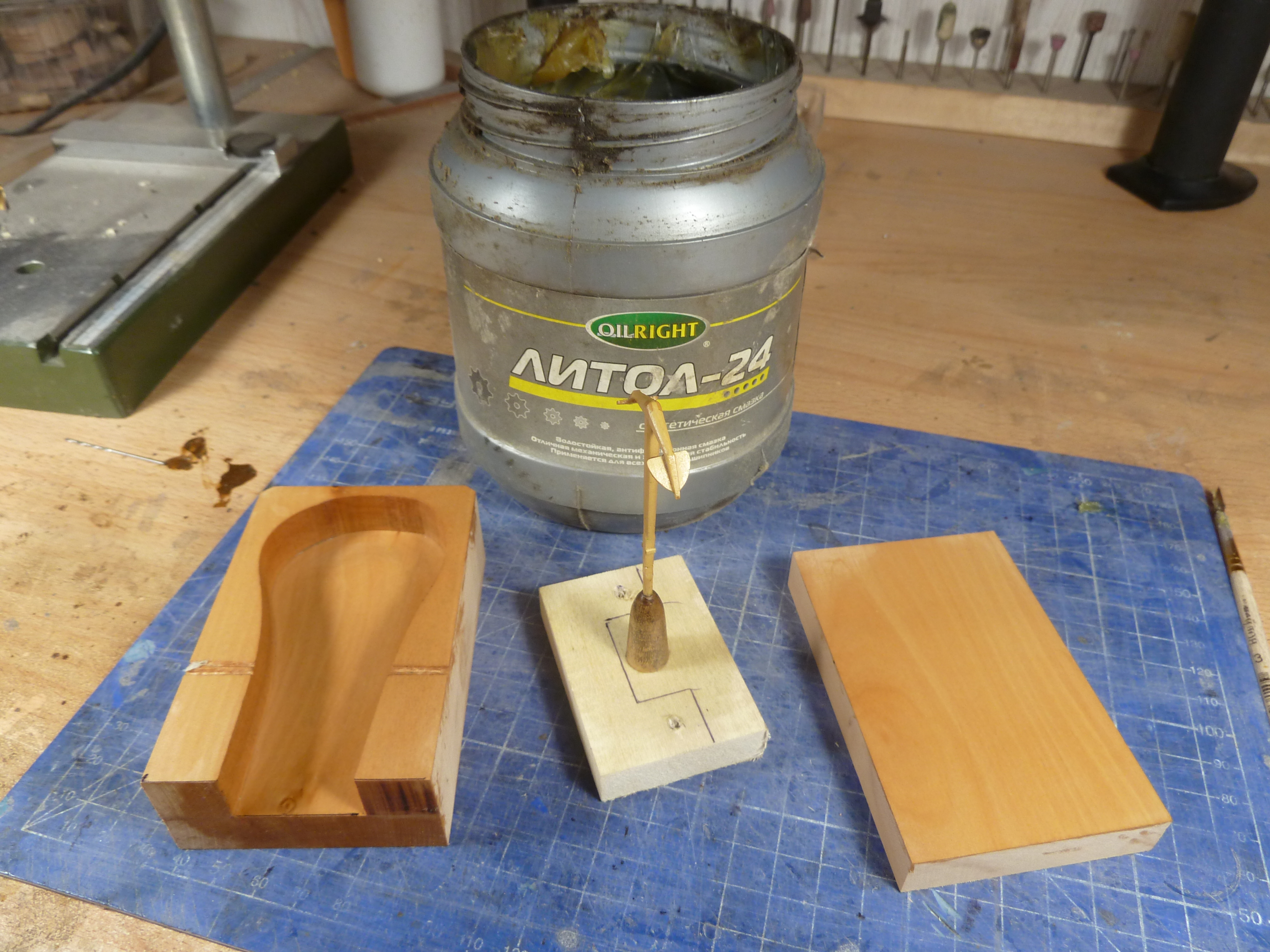 Сначала из дерева изготавливается опока и на одну съемную стенку, на каплю цианокрилата приклеиваю модель. Предварительно и модель и опока смазаны густой смазкой. Слой смазки очень тонкий, практически поверхность после нанесения располирована сухой кистью. Теперь по инструкции развожу виксинт и тщательно перемешиваю. Работать на этом этапе нужно быстро так как время приемлемой текучести у состава примерно 10 минут.