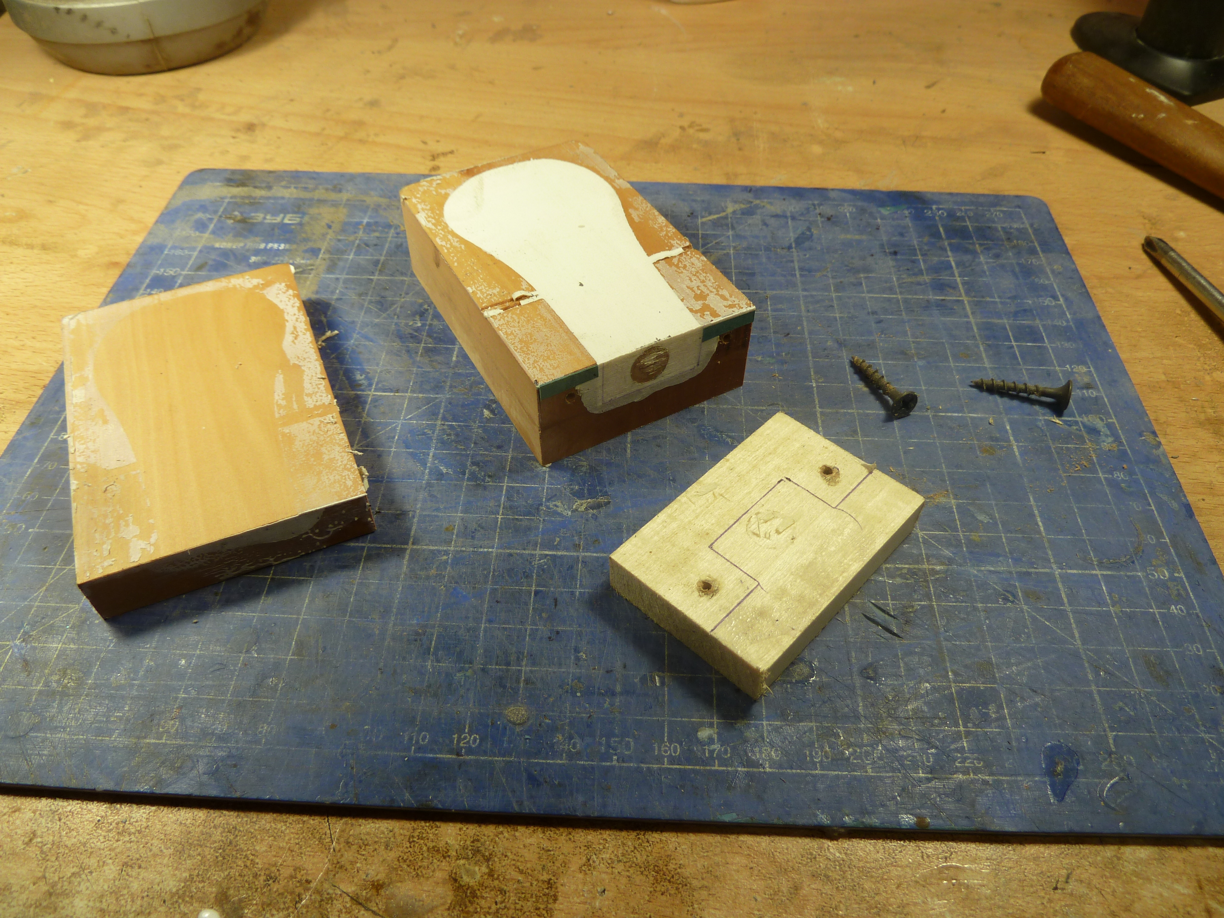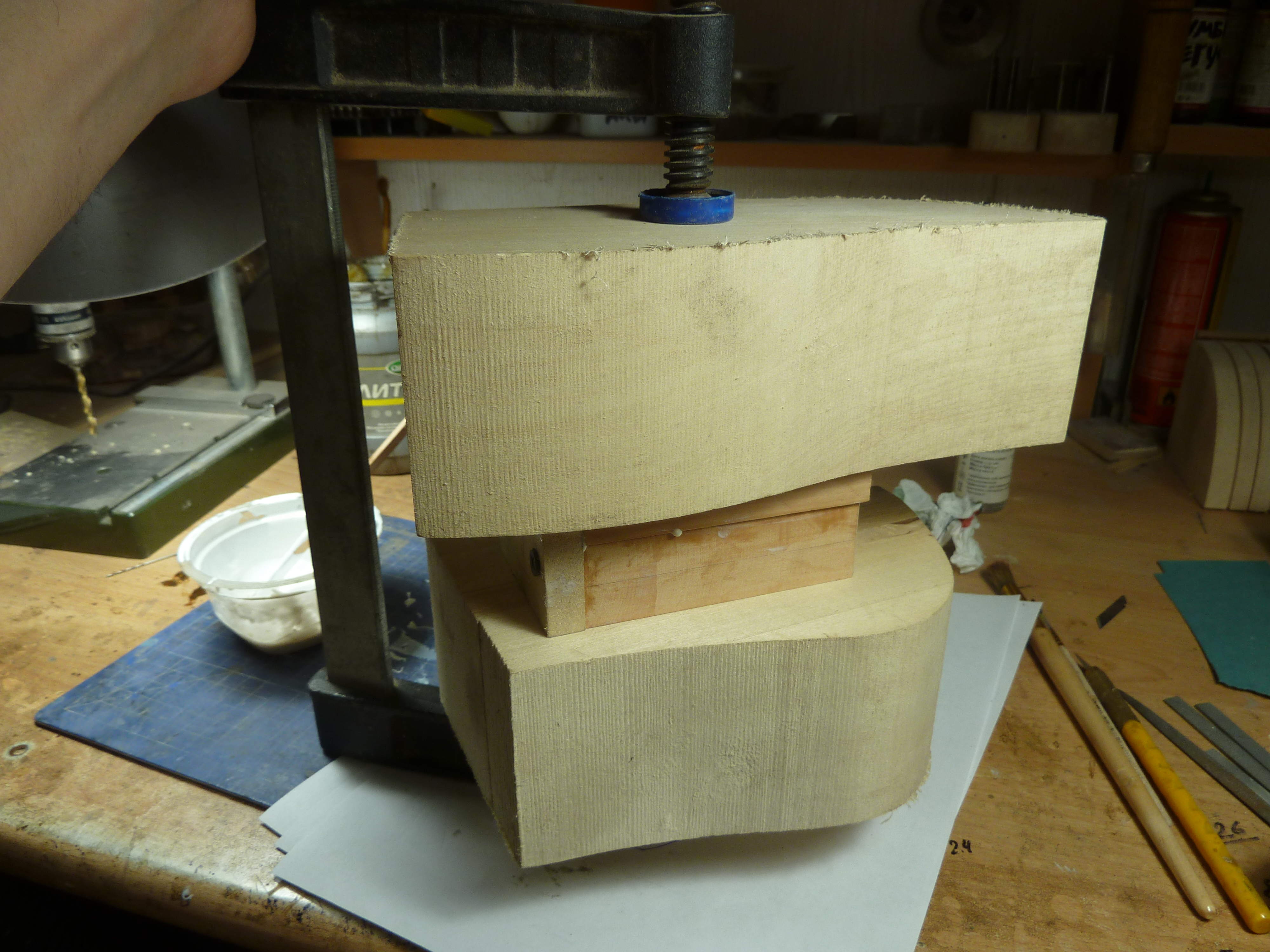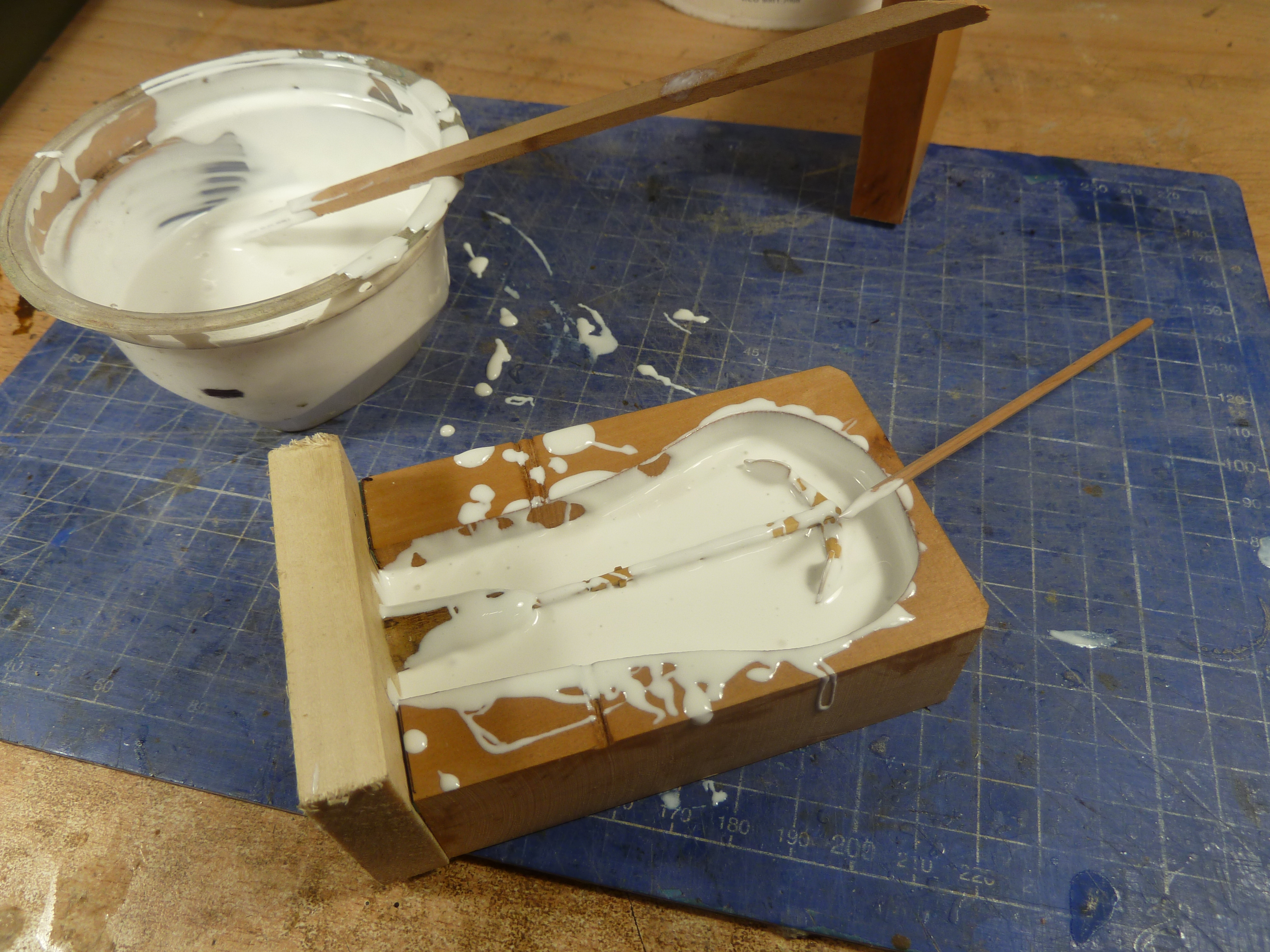 Сначала заливаю форму наполовину и острой деревянной палочкой удаляю все пузыри, затем обмазываю верхнюю часть модели и тоже прокалываю пузыри. После этого форму можно заливать до верха и прикрыть деревянной стенкой. Всю конструкцию зажимаю струбциной, не сильно, что бы не деформировать форму но достаточно что бы вытек весь лишний силикон и стенки сошлись. Оставляю форму сохнуть до завтра.