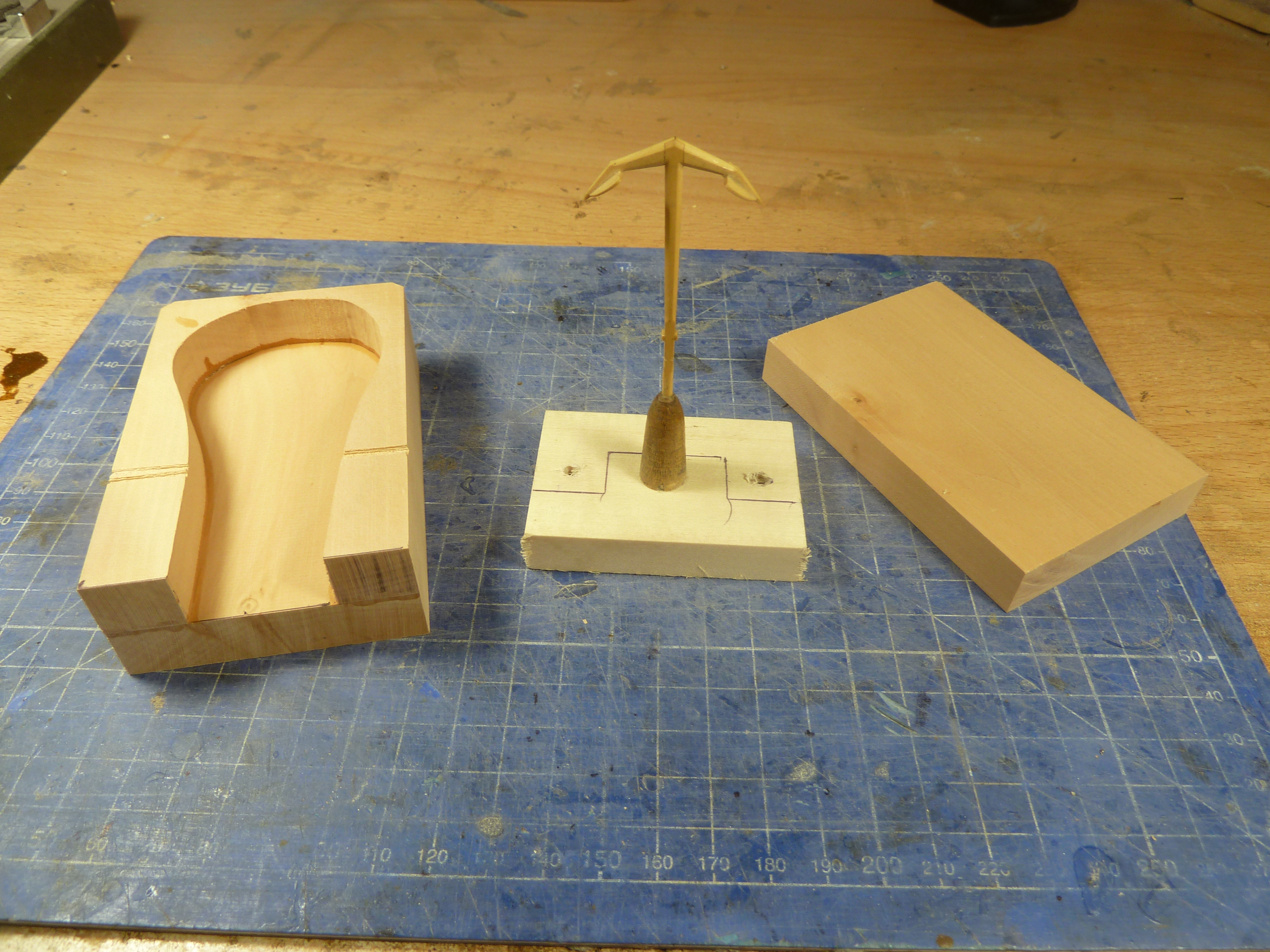Модель выполнена из самшита совместно с частью литниковой системы - питателем и прибылью.Форма будет отливаться из силиконовой резины Пентаэласт -710, или попросту Виксинт. Он вполне держит температуру до 300 градусов, хоть столько и не нужно.