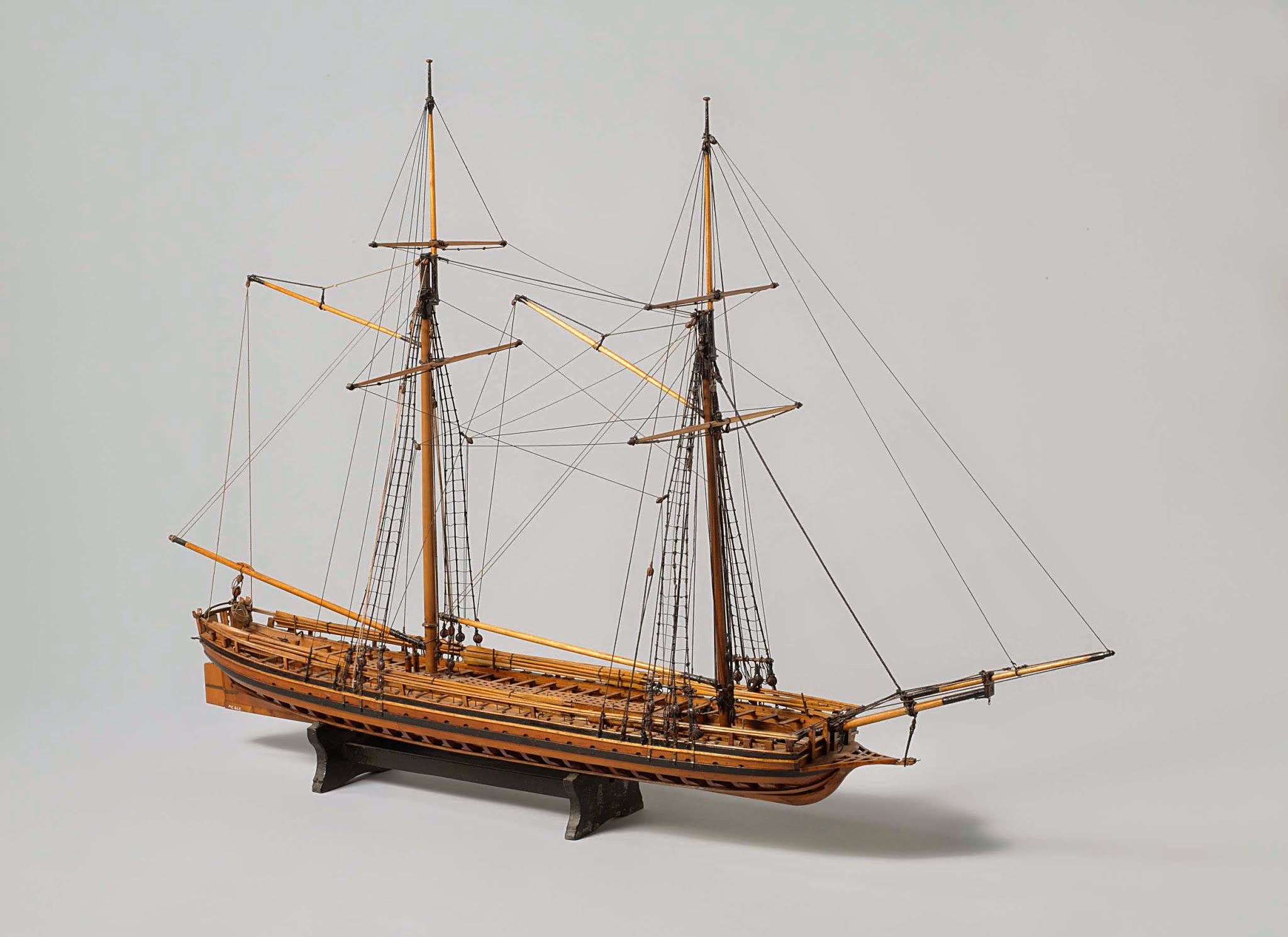 Короче, я пришел к таким измышлениям. По схеме видно что парусное вооружение как у шхуны гафельное...... с узлом сочленения вроде все ясно, можно делать салинги как на шхуне ( с учетом особенностей страны....)..... Но прочитал в одной книге где Марквардт пишет что на шхунах делали упрощенный вариант такелажа, а именно мачту со стеньгой соединяли железными бугелями. Я логически прикинул что судно военное, артиллерийское - а значит долго не живущее, а их надо много для войны....... поэтому делали проще что бы уменьшить затраты и время на изготовление....... Также есть фотка модели из голландского музея (модель рангоутная без парусов, по корпусу и надстройкам есть правда различия - но однотипное....)) где видно что салингов нет, соединение бугелями.