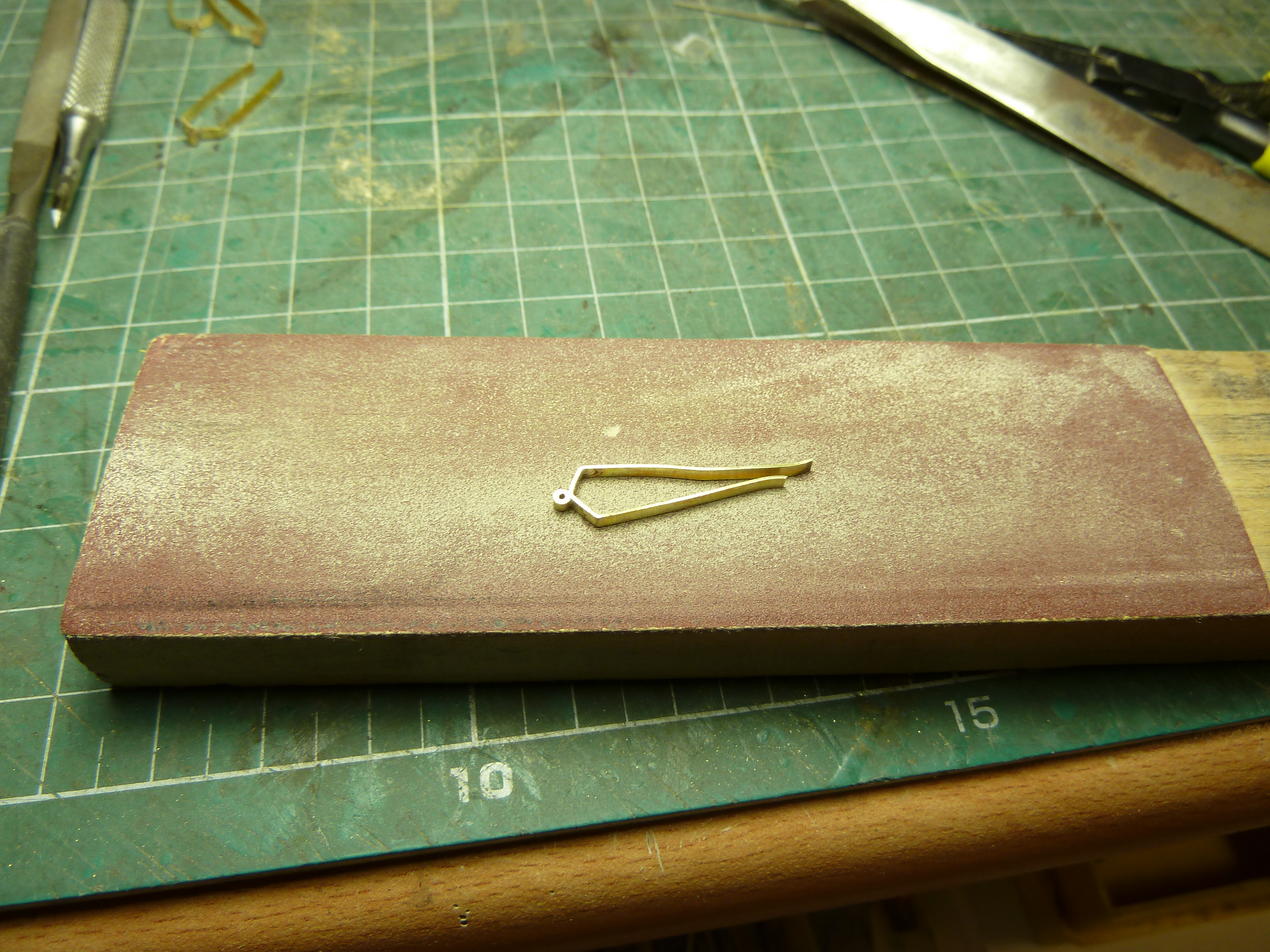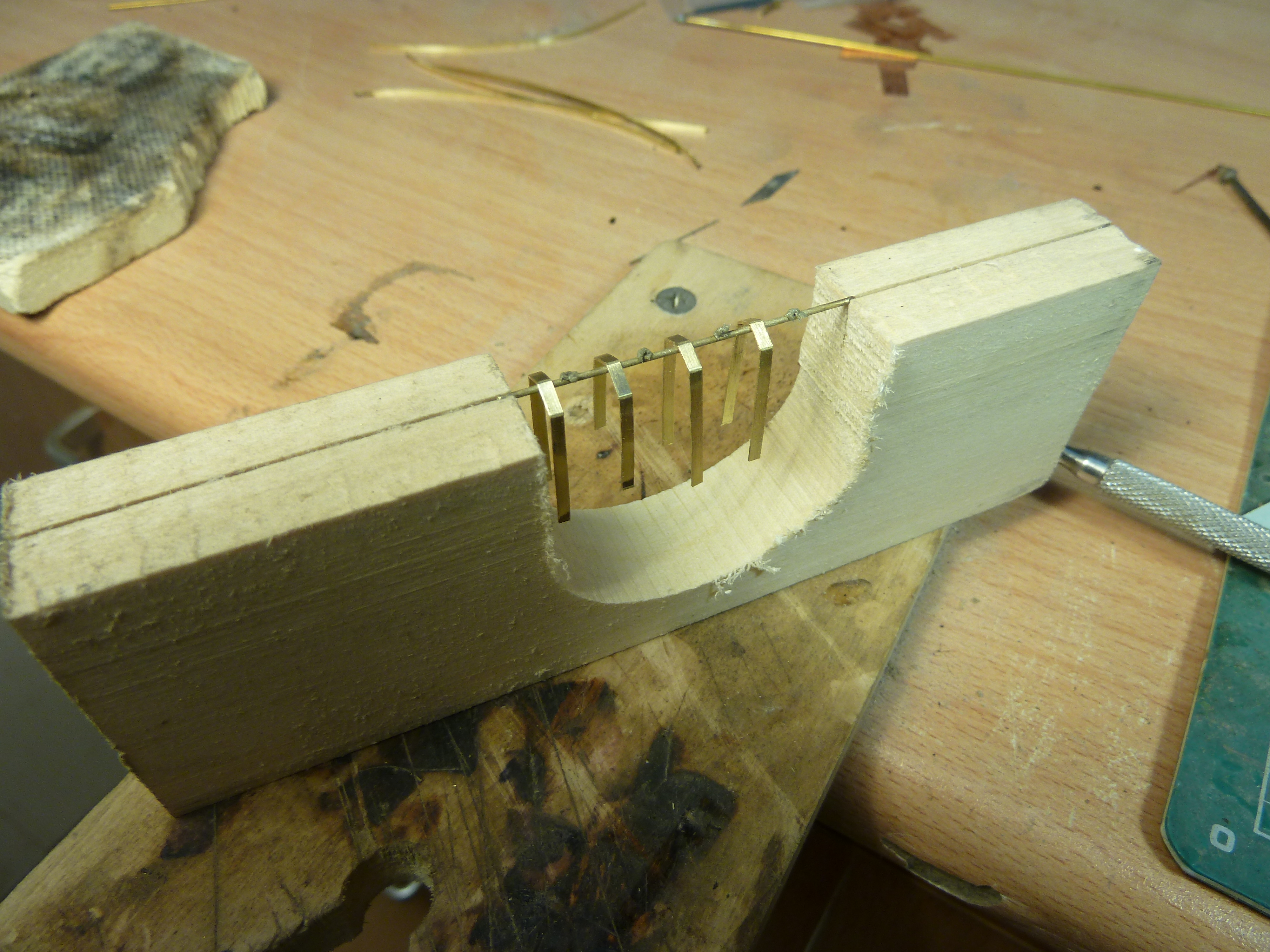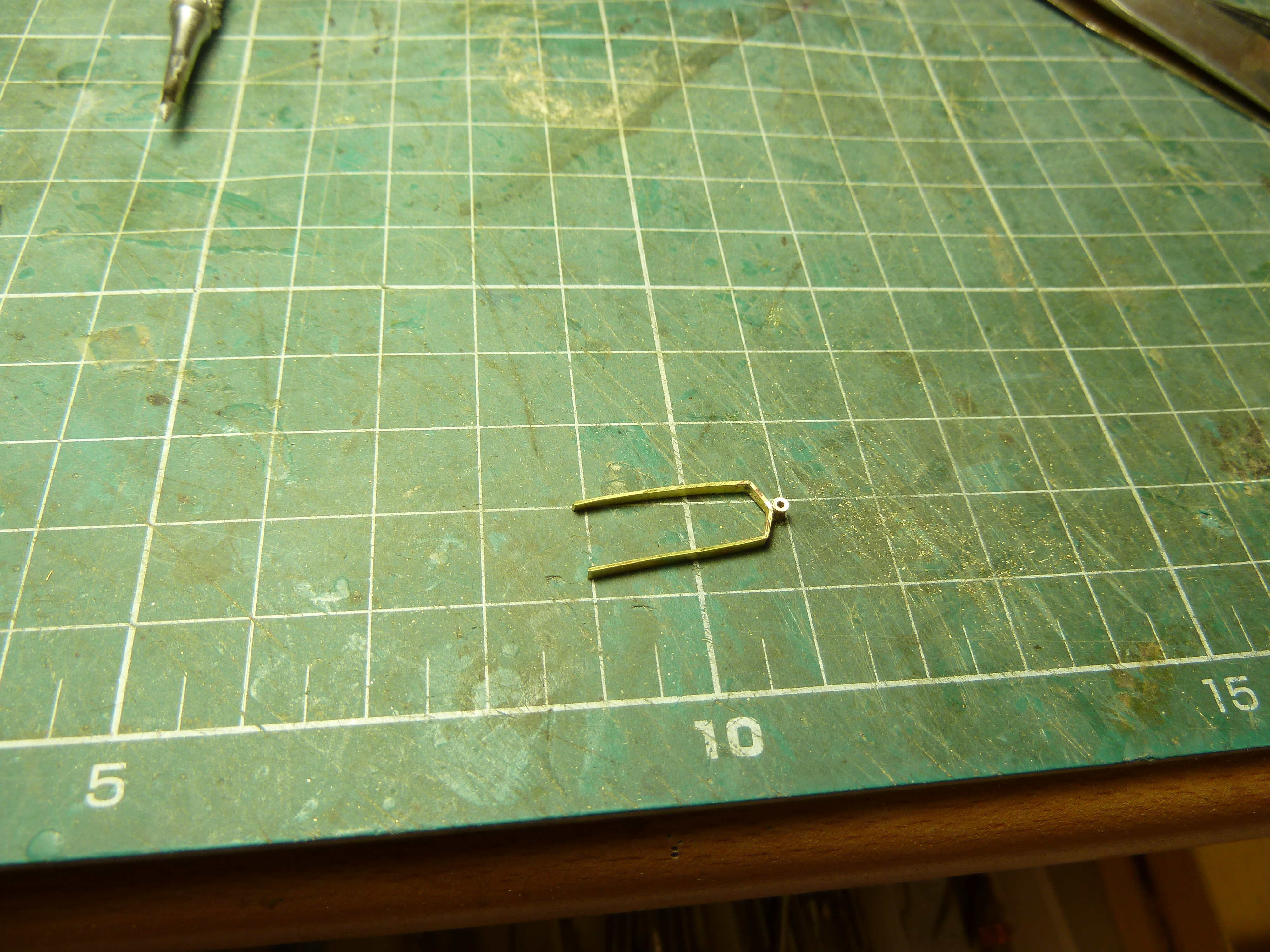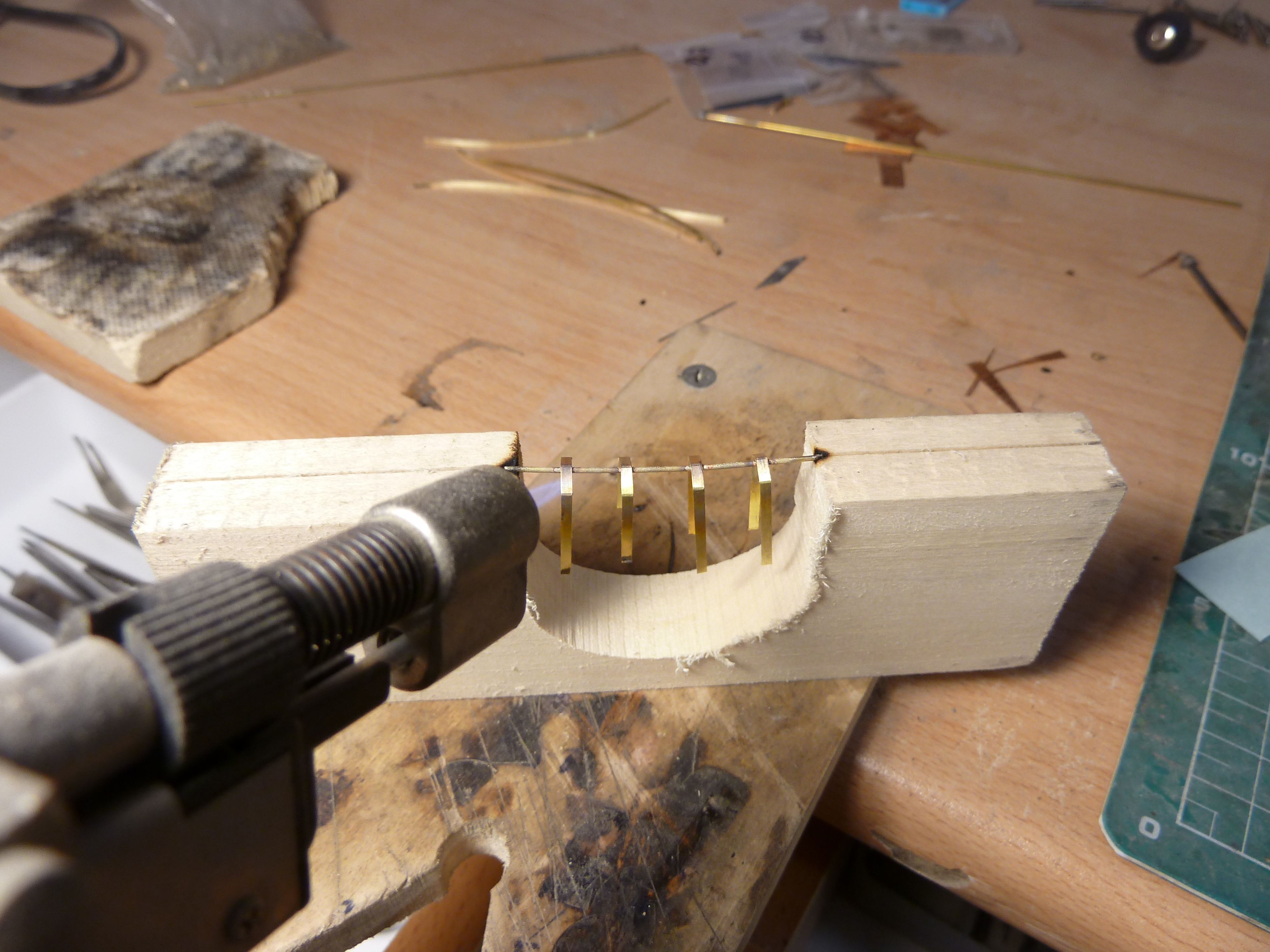 Как то я ранее пропустил процесс изготовления рулевых петель. Сначала на КС ке напиливаю из 0,5 мм латуни полосы нужной ширины. Начнем с папы, тоесть части которая стоит на руле. Как это ни странно для начинающих но, сам штырь стоит внутри петли. Это позволяет поставить перо руля максимально плотно к штевню. По центру заготовки петли квадратным надфилем делаю засечку, с помощью балеринки отмечаю расстояние до еще двух. Расстояние между засечками равно длине скошенной грани руля. Сгибаю заготовки по засечкам, что бы они приняли форму руля. Далее делаю из дерева нехитрую приспособу и закрепляю в ней латунную проволоку Ф 0,7.Это будущие оси петель, сразу на три четыре штуки. На проволоку через некоторое расстояние наношу немного пасты для пайки и вешаю на эти места заготовки петель. В углы петель тоже предварительно нужно нанести немного пасты. Прогреваю всю конструкцию и получаю сразу три - четыре полуфабриката петель. Далее нужно разделить их и зачистить.