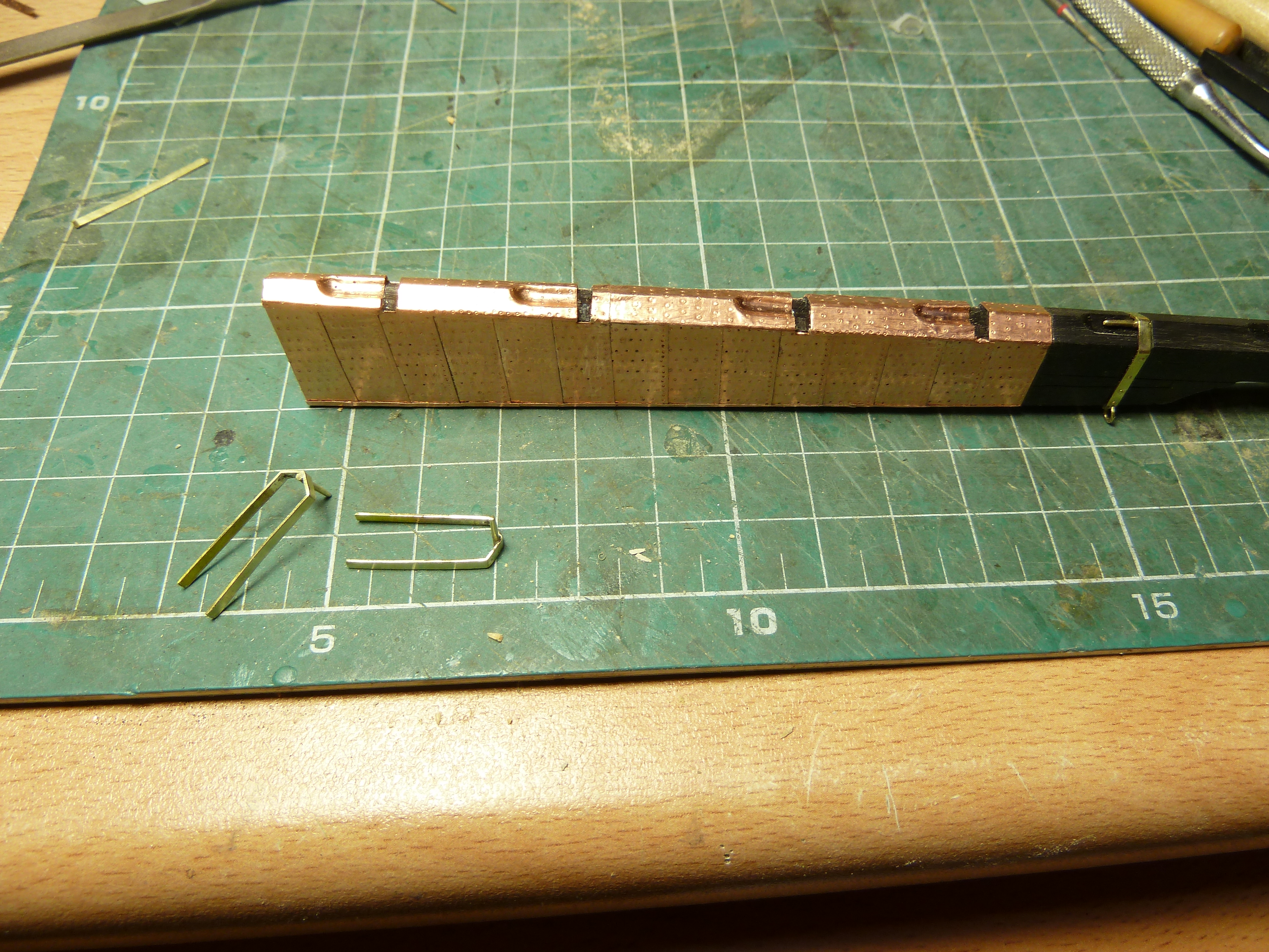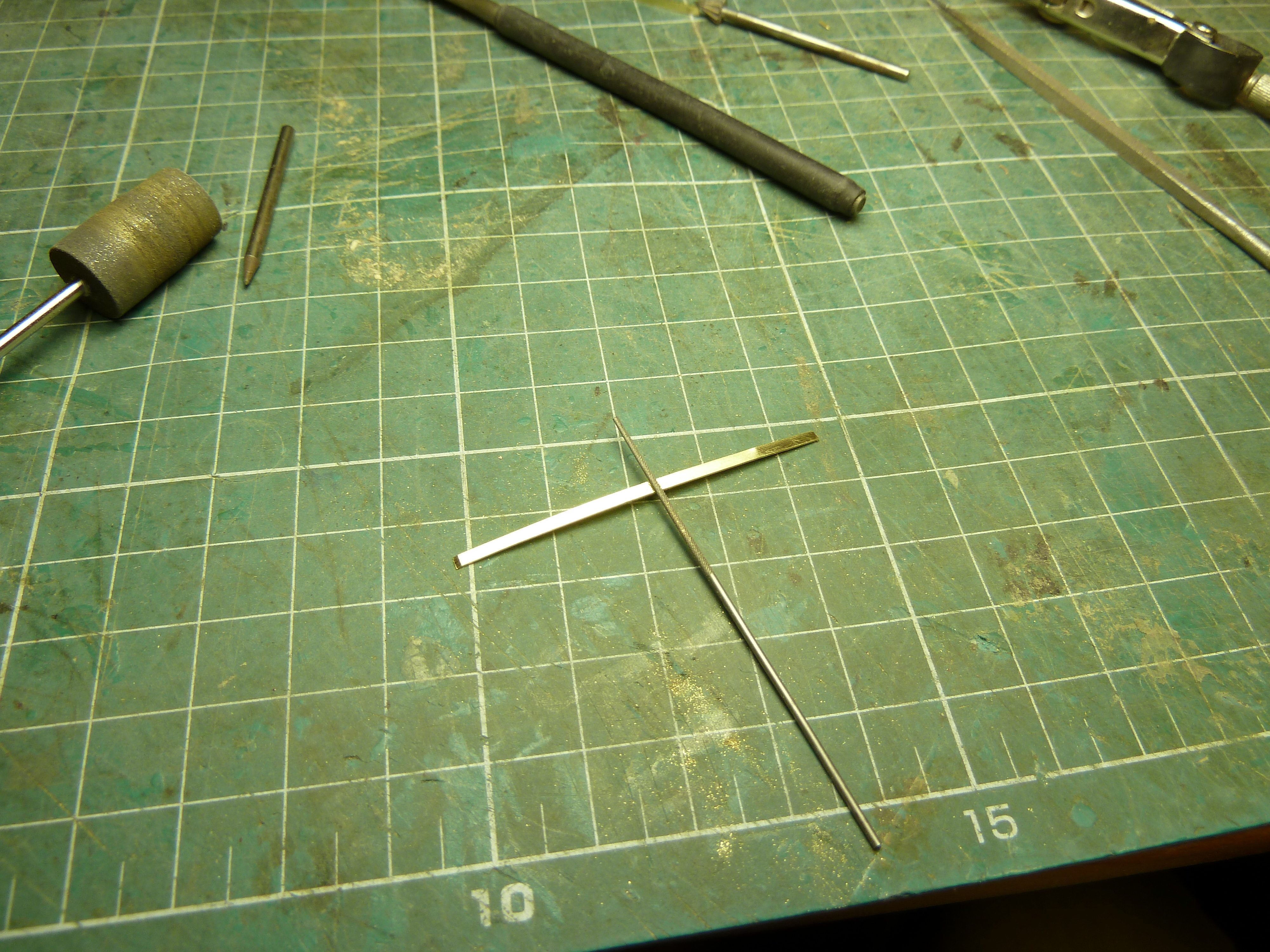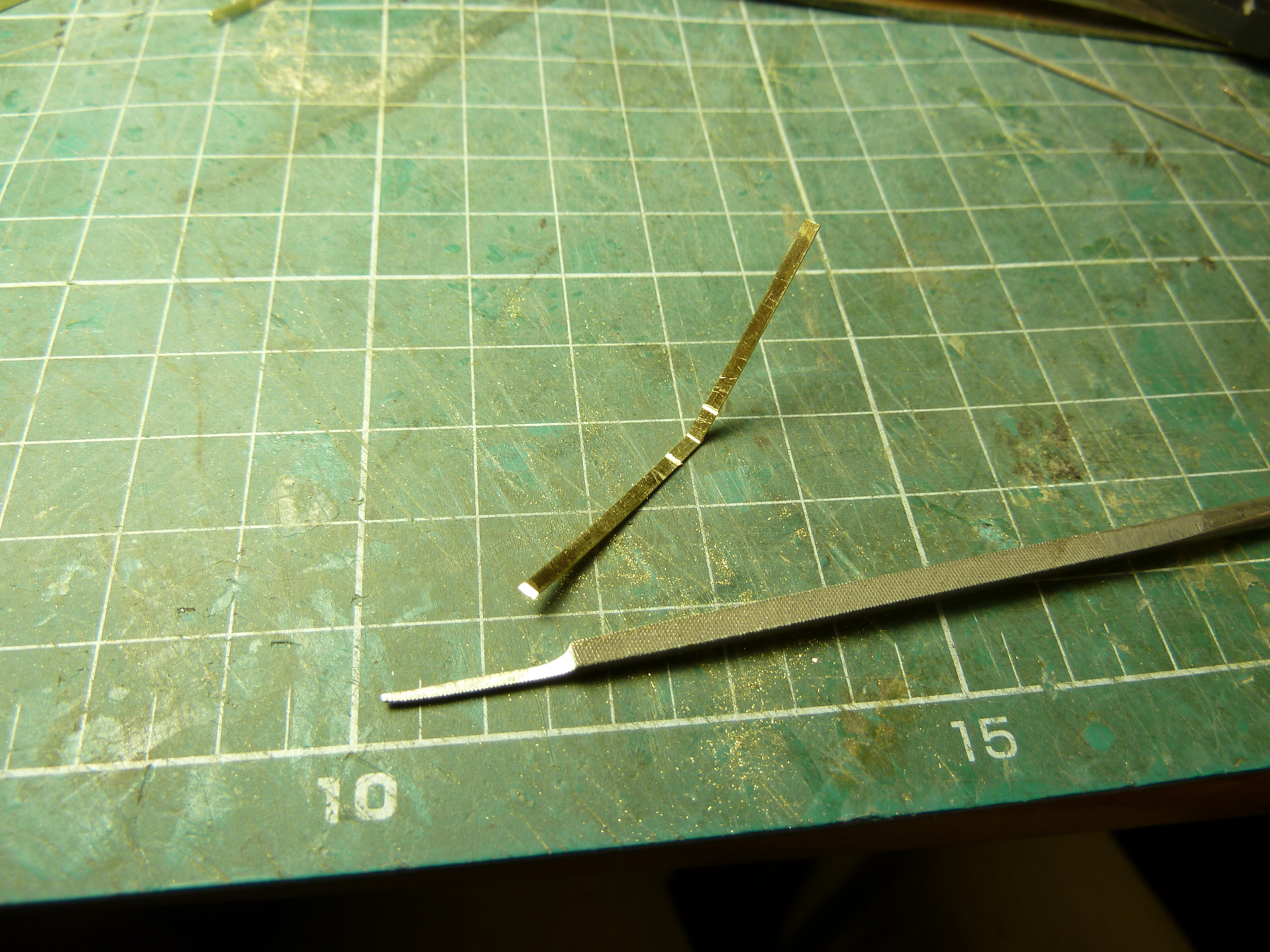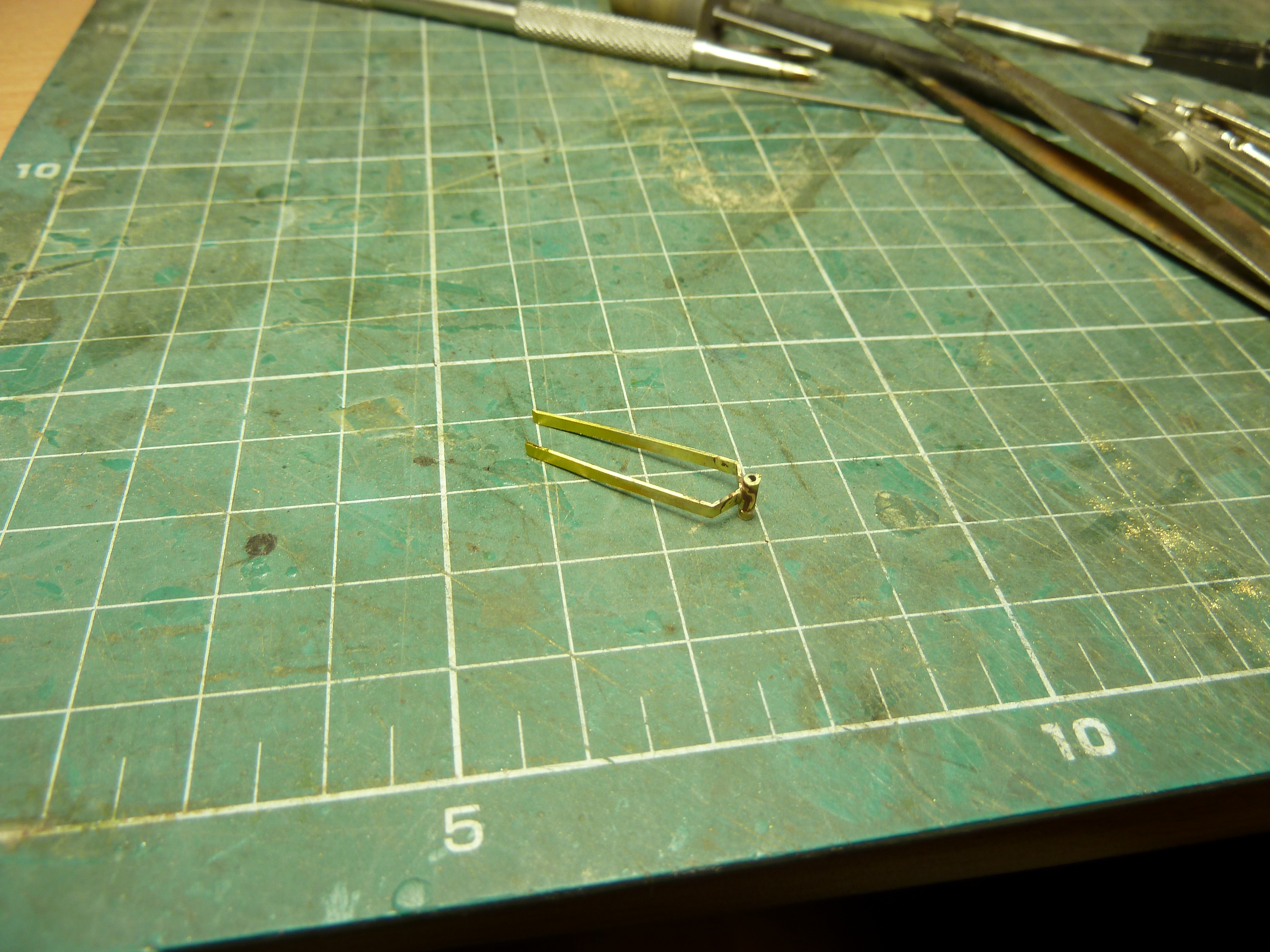 Как то я ранее пропустил процесс изготовления рулевых петель. Сначала на КС ке напиливаю из 0,5 мм латуни полосы нужной ширины. Начнем с папы, тоесть части которая стоит на руле. Как это ни странно для начинающих но, сам штырь стоит внутри петли. Это позволяет поставить перо руля максимально плотно к штевню. По центру заготовки петли квадратным надфилем делаю засечку, с помощью балеринки отмечаю расстояние до еще двух. Расстояние между засечками равно длине скошенной грани руля. Сгибаю заготовки по засечкам, что бы они приняли форму руля. Далее делаю из дерева нехитрую приспособу и закрепляю в ней латунную проволоку Ф 0,7.Это будущие оси петель, сразу на три четыре штуки. На проволоку через некоторое расстояние наношу немного пасты для пайки и вешаю на эти места заготовки петель. В углы петель тоже предварительно нужно нанести немного пасты. Прогреваю всю конструкцию и получаю сразу три - четыре полуфабриката петель. Далее нужно разделить их и зачистить.
