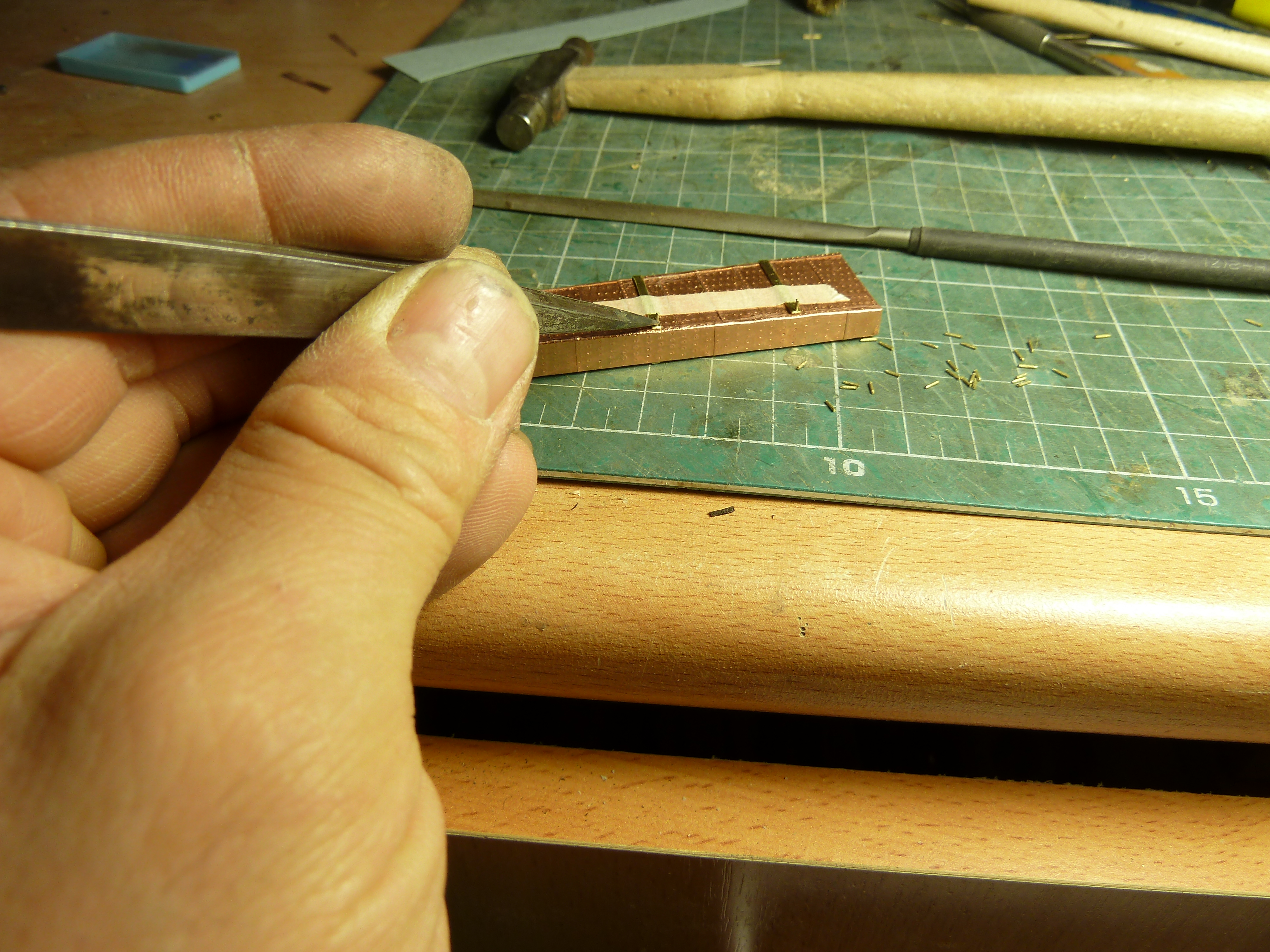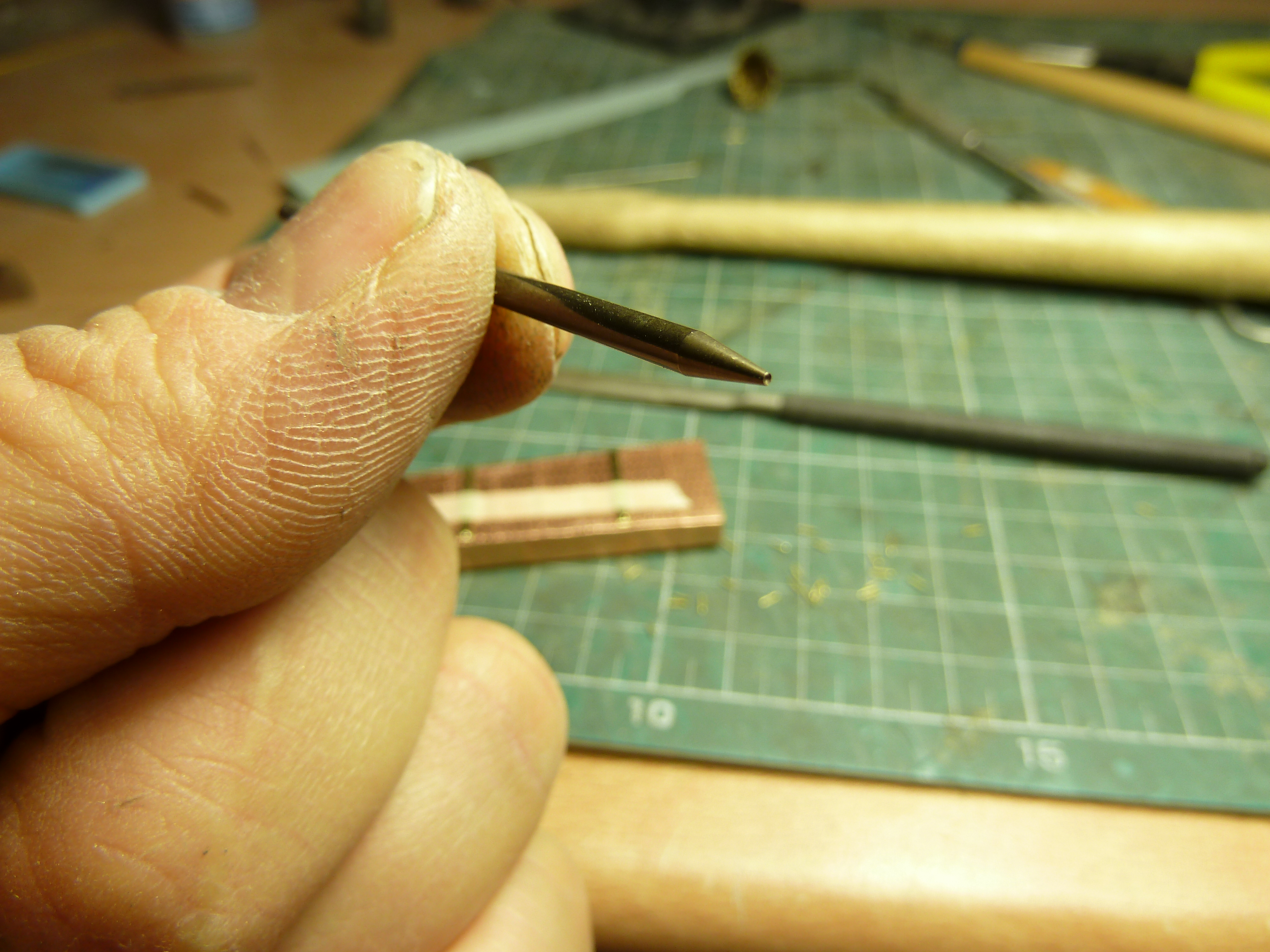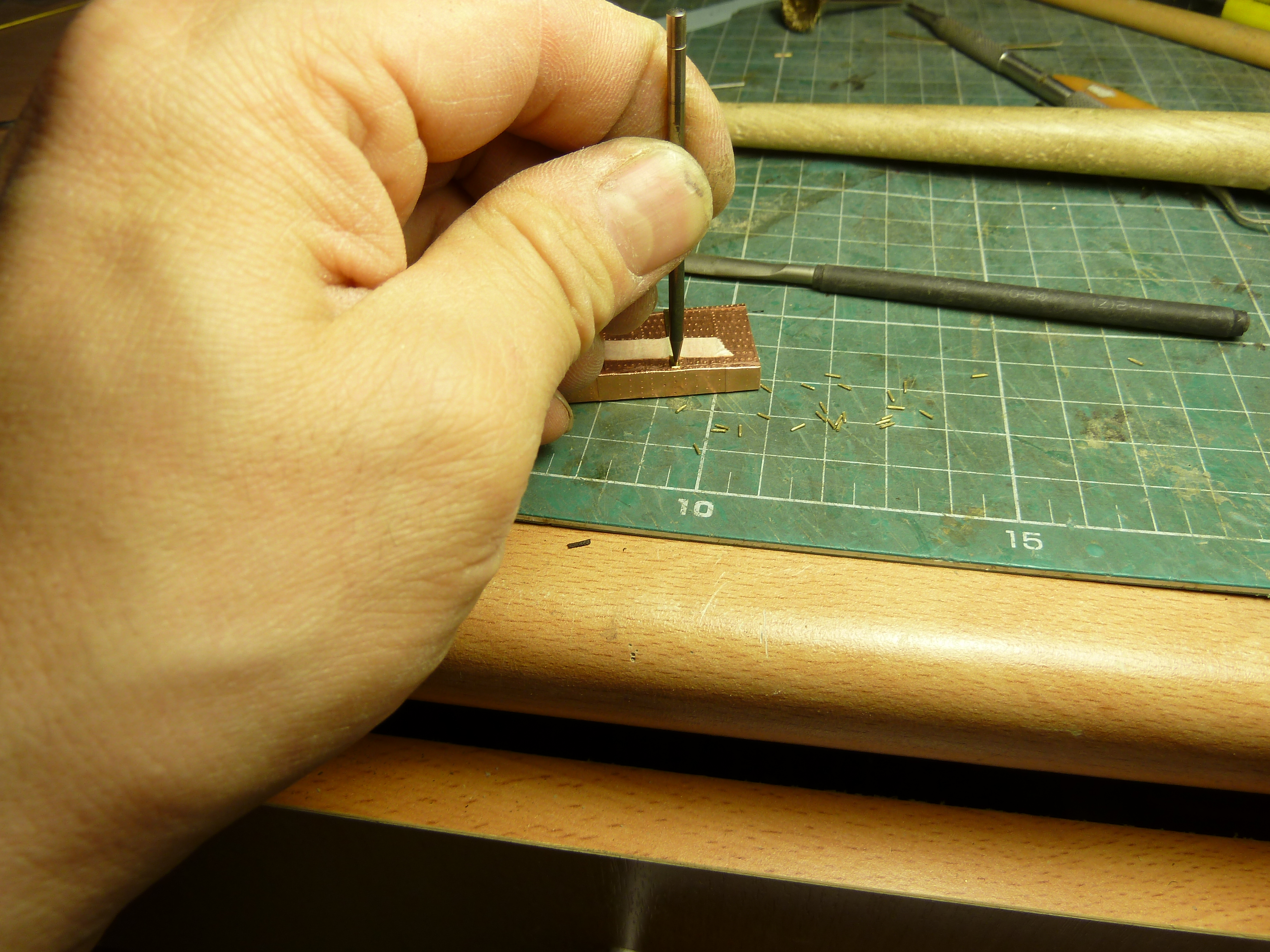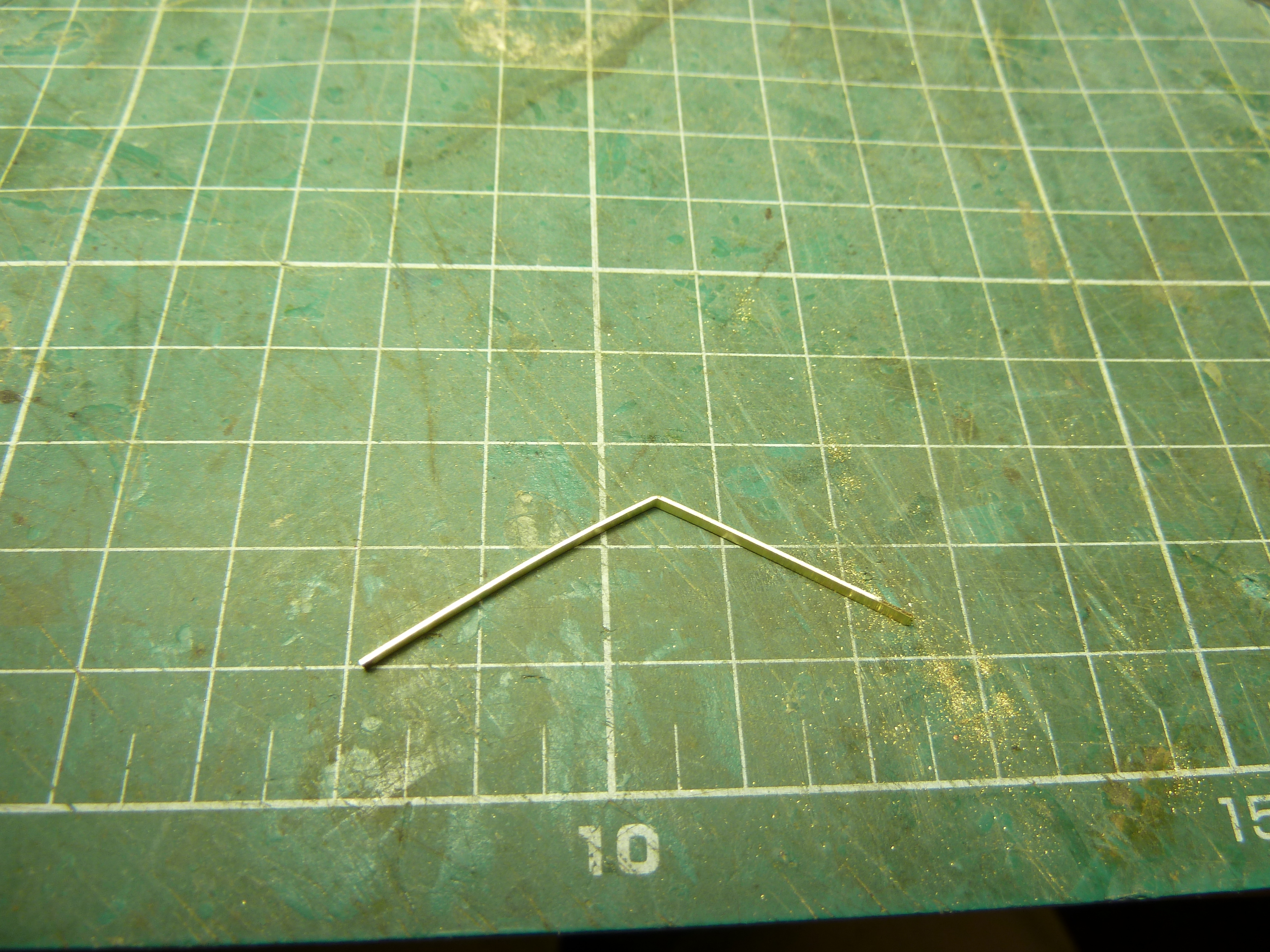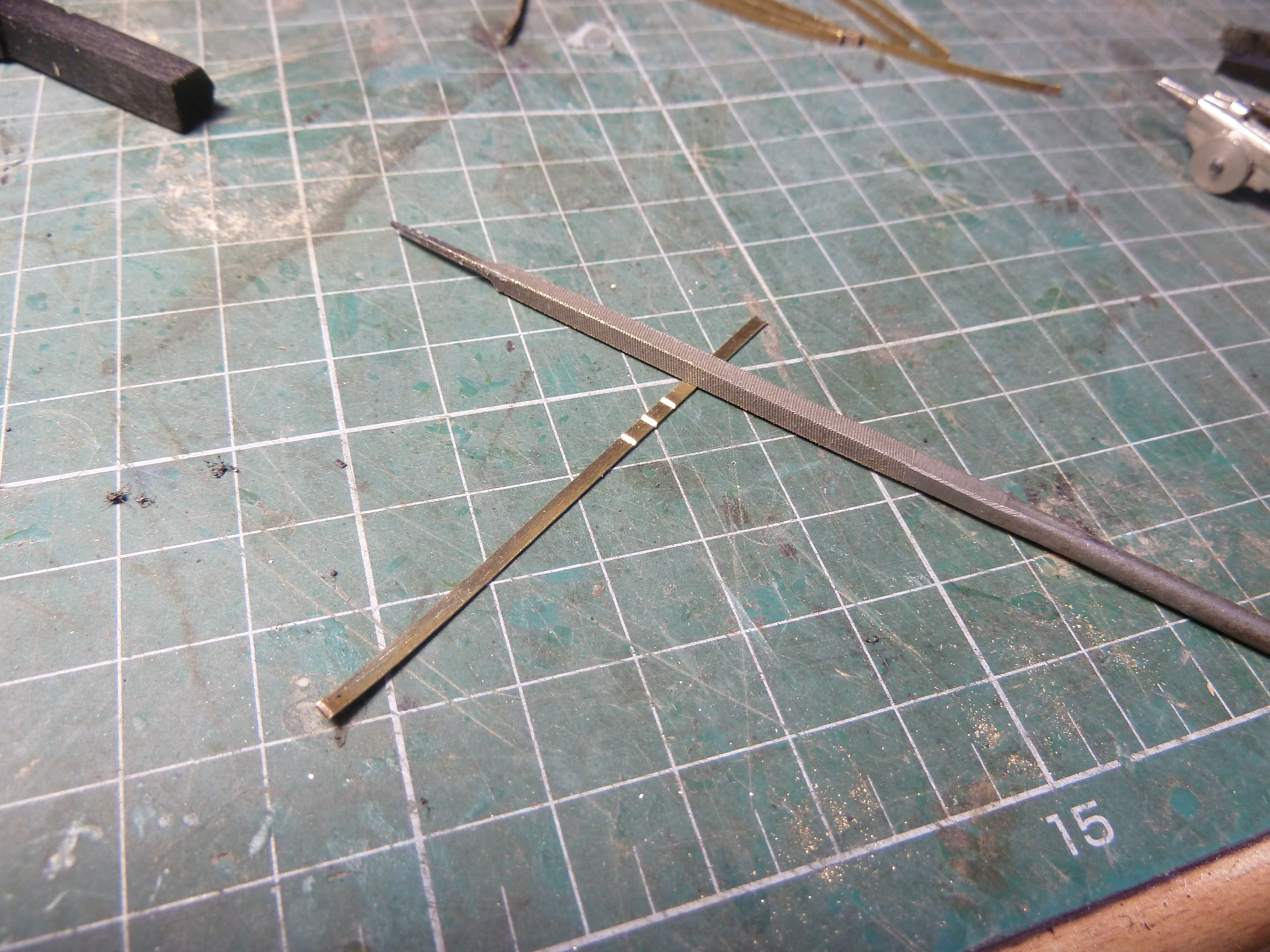 Как то я ранее пропустил процесс изготовления рулевых петель. Сначала на КС ке напиливаю из 0,5 мм латуни полосы нужной ширины. Начнем с папы, тоесть части которая стоит на руле. Как это ни странно для начинающих но, сам штырь стоит внутри петли. Это позволяет поставить перо руля максимально плотно к штевню. По центру заготовки петли квадратным надфилем делаю засечку, с помощью балеринки отмечаю расстояние до еще двух. Расстояние между засечками равно длине скошенной грани руля. Сгибаю заготовки по засечкам, что бы они приняли форму руля. Далее делаю из дерева нехитрую приспособу и закрепляю в ней латунную проволоку Ф 0,7.Это будущие оси петель, сразу на три четыре штуки. На проволоку через некоторое расстояние наношу немного пасты для пайки и вешаю на эти места заготовки петель. В углы петель тоже предварительно нужно нанести немного пасты. Прогреваю всю конструкцию и получаю сразу три - четыре полуфабриката петель. Далее нужно разделить их и зачистить.