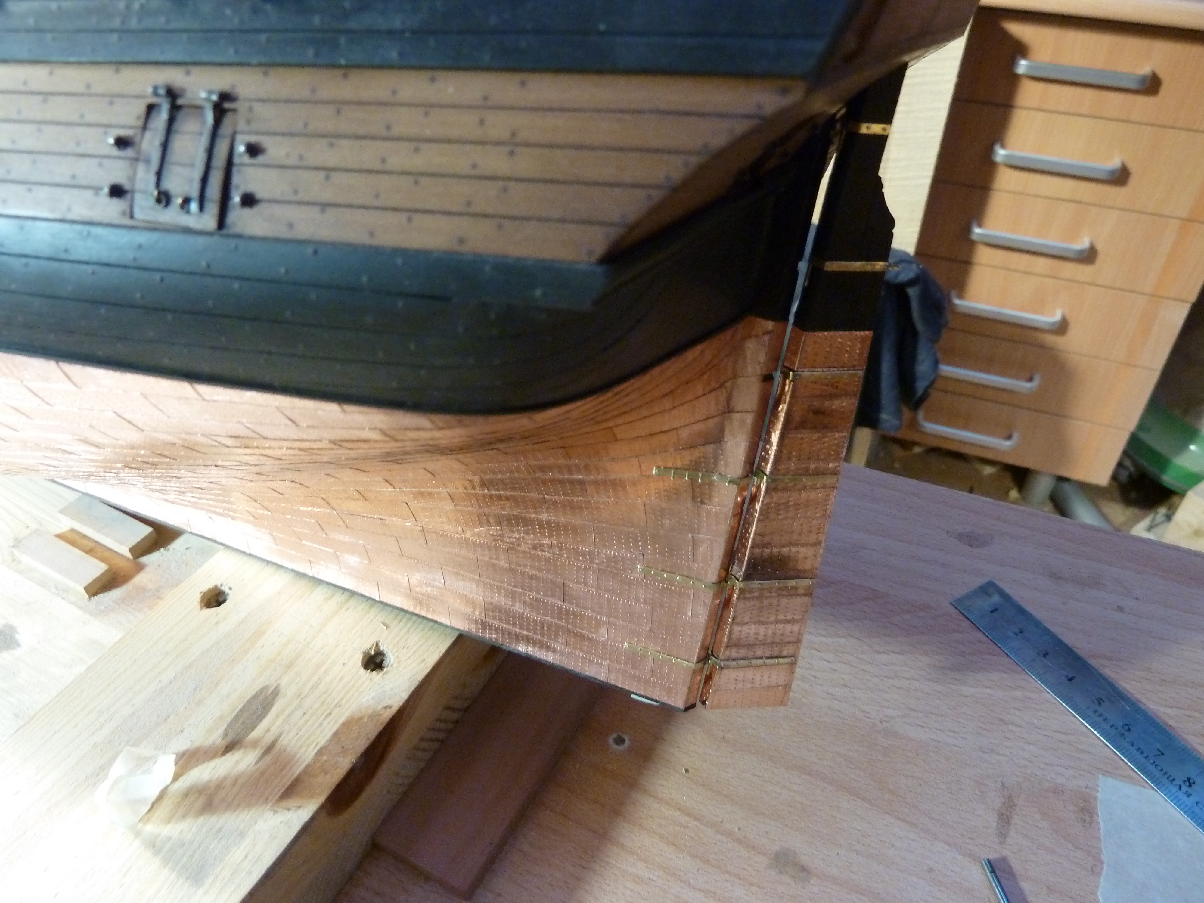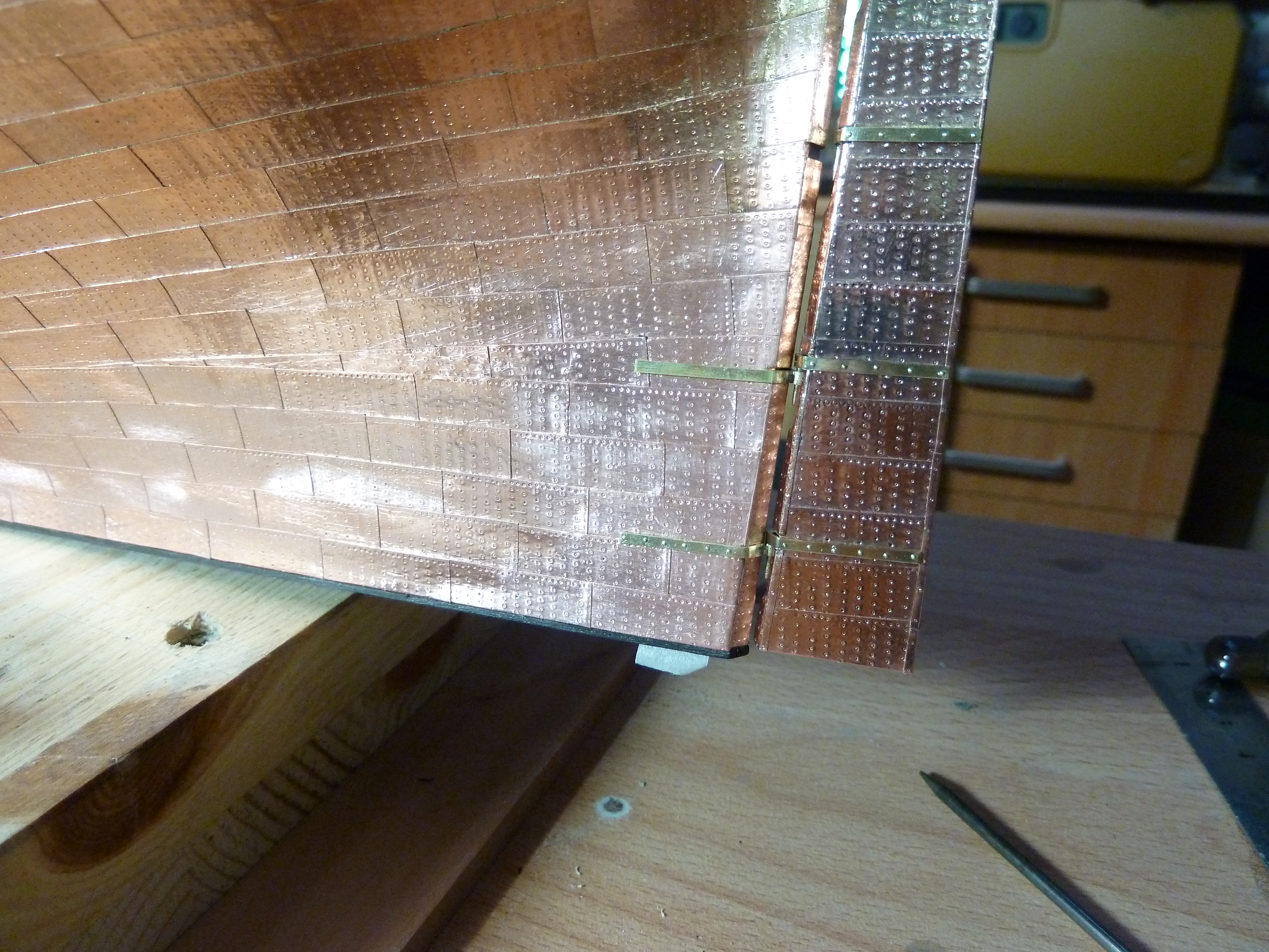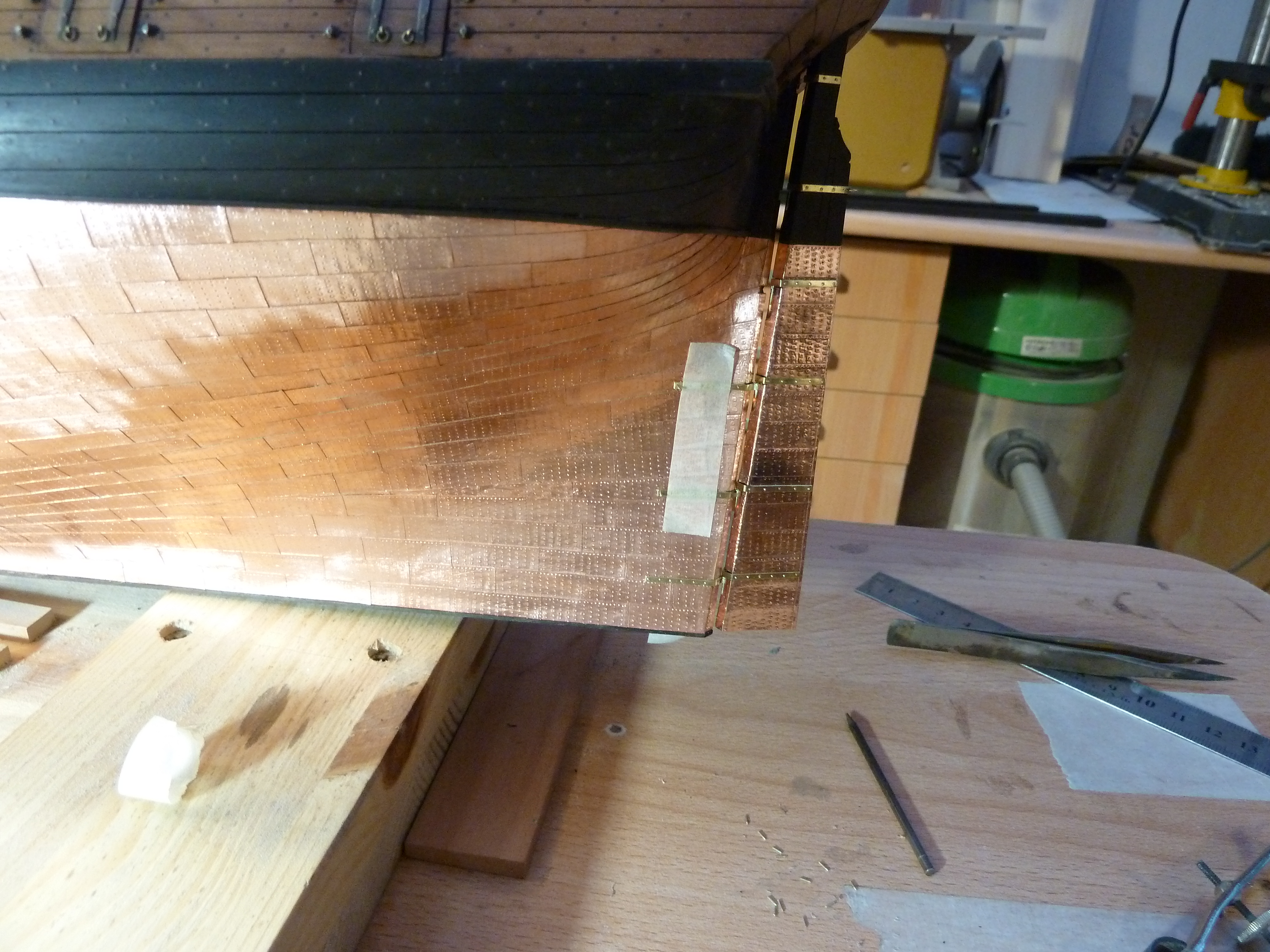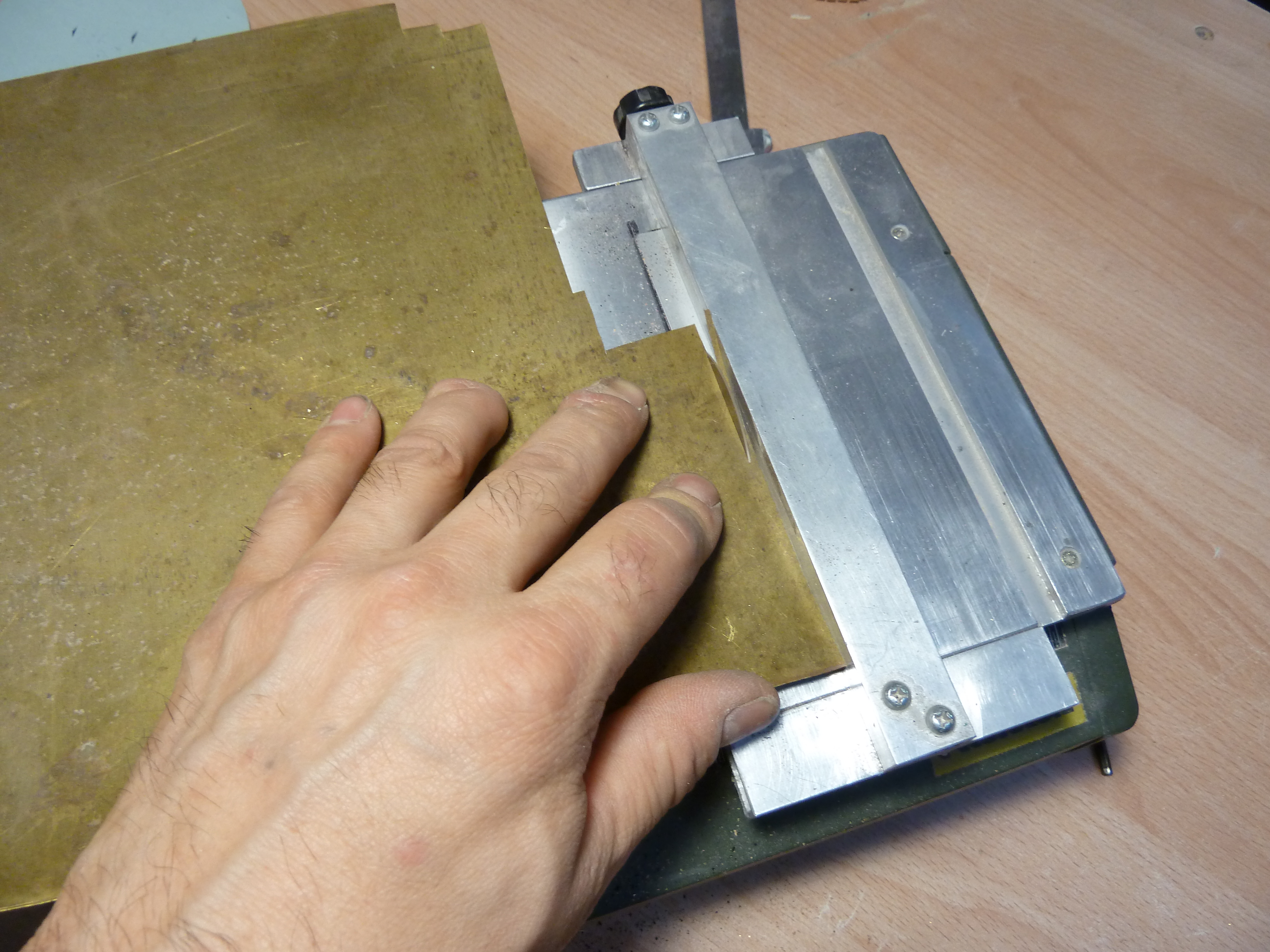 Как то я ранее пропустил процесс изготовления рулевых петель. Сначала на КС ке напиливаю из 0,5 мм латуни полосы нужной ширины. Начнем с папы, тоесть части которая стоит на руле. Как это ни странно для начинающих но, сам штырь стоит внутри петли. Это позволяет поставить перо руля максимально плотно к штевню. По центру заготовки петли квадратным надфилем делаю засечку, с помощью балеринки отмечаю расстояние до еще двух. Расстояние между засечками равно длине скошенной грани руля. Сгибаю заготовки по засечкам, что бы они приняли форму руля. Далее делаю из дерева нехитрую приспособу и закрепляю в ней латунную проволоку Ф 0,7.Это будущие оси петель, сразу на три четыре штуки. На проволоку через некоторое расстояние наношу немного пасты для пайки и вешаю на эти места заготовки петель. В углы петель тоже предварительно нужно нанести немного пасты. Прогреваю всю конструкцию и получаю сразу три - четыре полуфабриката петель. Далее нужно разделить их и зачистить.
