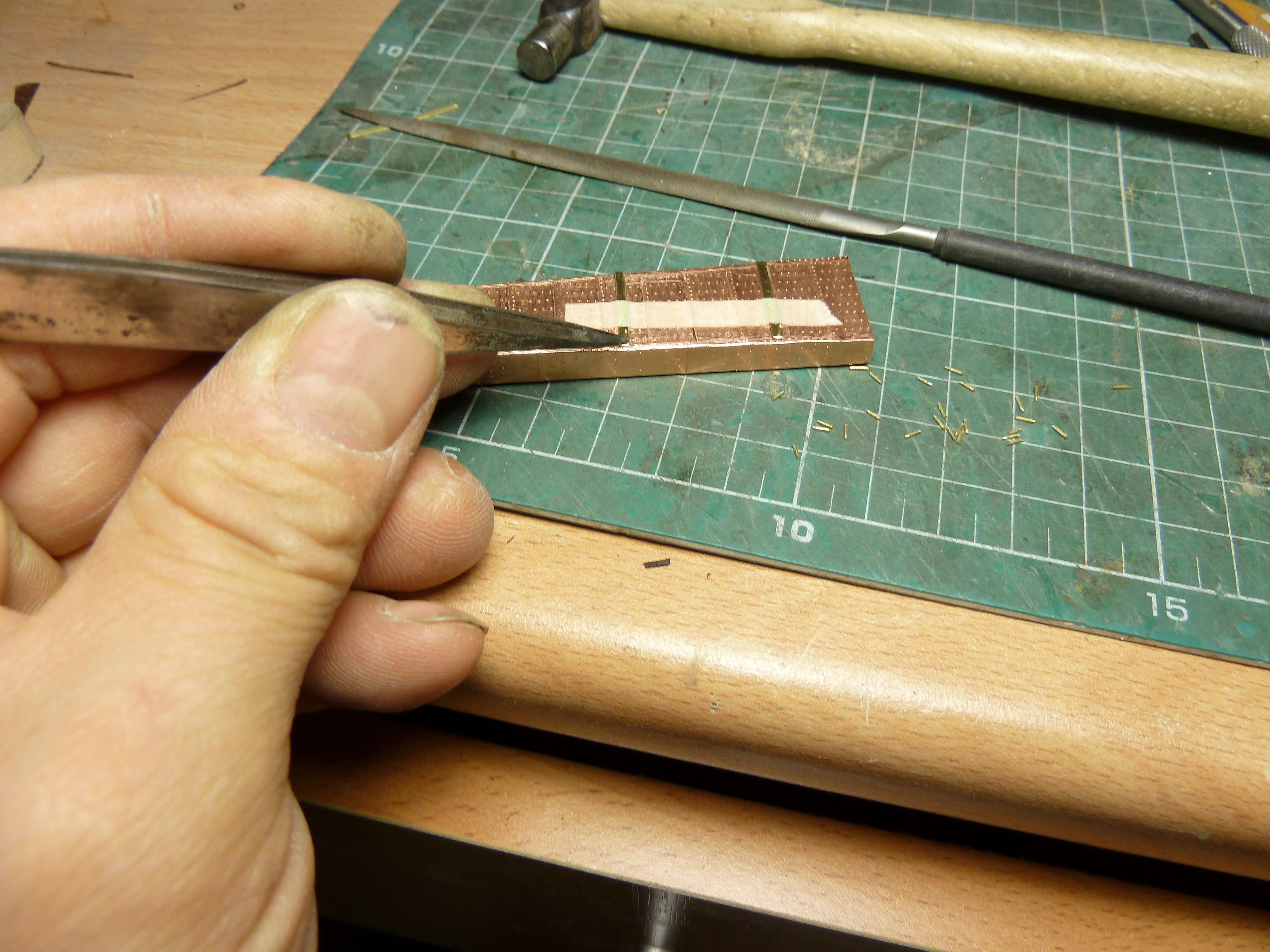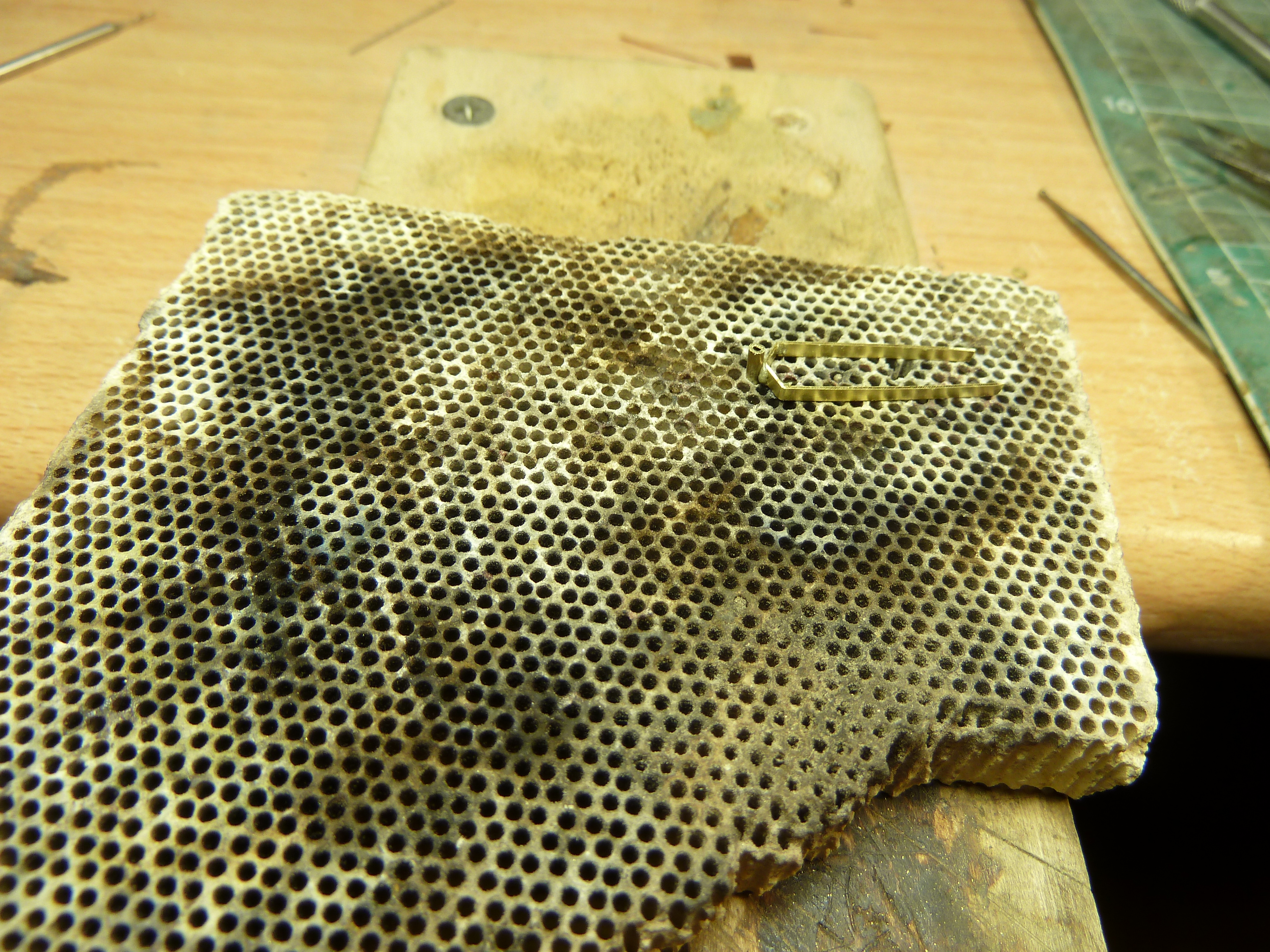 Теперь ответная часть стоящая на штевне. Делаю так же 3 засечки, так как штевень имеет скошенные грани.Одну делаю игольчатым круглым надфилем снаружи. В неё после изгиба ляжет трубка. Две на другой стороне полосы квадратным для четкого сгиба. Из латунной трубки Ф 1,6 мм напиливаю отрезков длиной 4 - 5 мм. Их вставляю с натягом в сотовую плиту для пайки. Она легко рассверливается до нужного размера. Заготовку петли по центру смазываю пастой и ставлю вплотную к зафиксированной трубке. Пропаиваю и вынимаю. Осталось отпилить лобзиком лишние концы и зачистить.