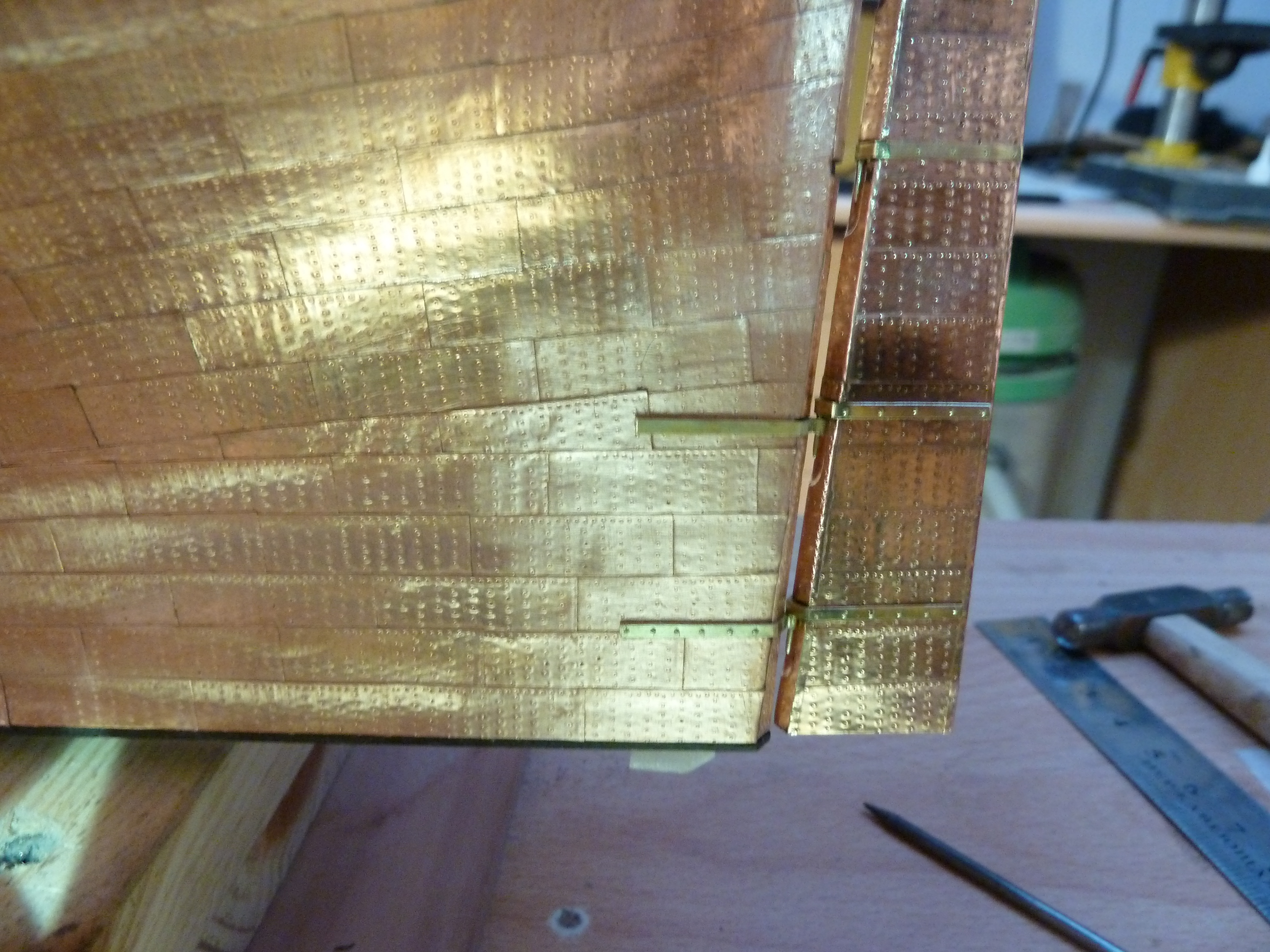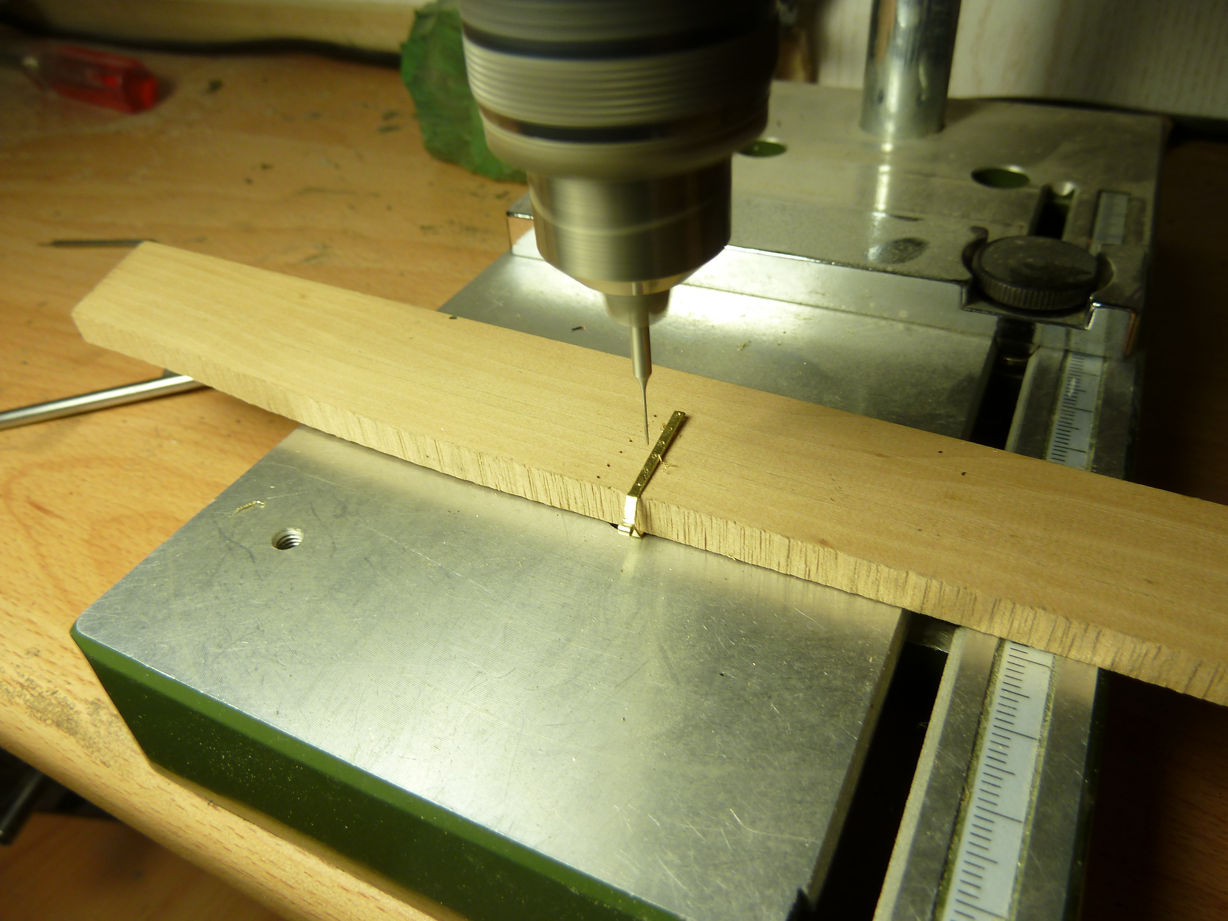 Теперь как установить полученные петли. Для начала нужно просверлить отверстия. Делаю это новым ювелирным сверлом на толстом хвостовике. Предварительно места сверления накернил. Удобно делать это вложив в петлю подходящей толщины деревяшку. Теперь готовую петлю ставлю на место и приклеиваю полоской малярного скотча. Прямо по петле насверливаю отверстий в руле и забиваю гвозди полученные методом накатки на шайбе или коврике для резки. На штевне делаю аналогичным образом.