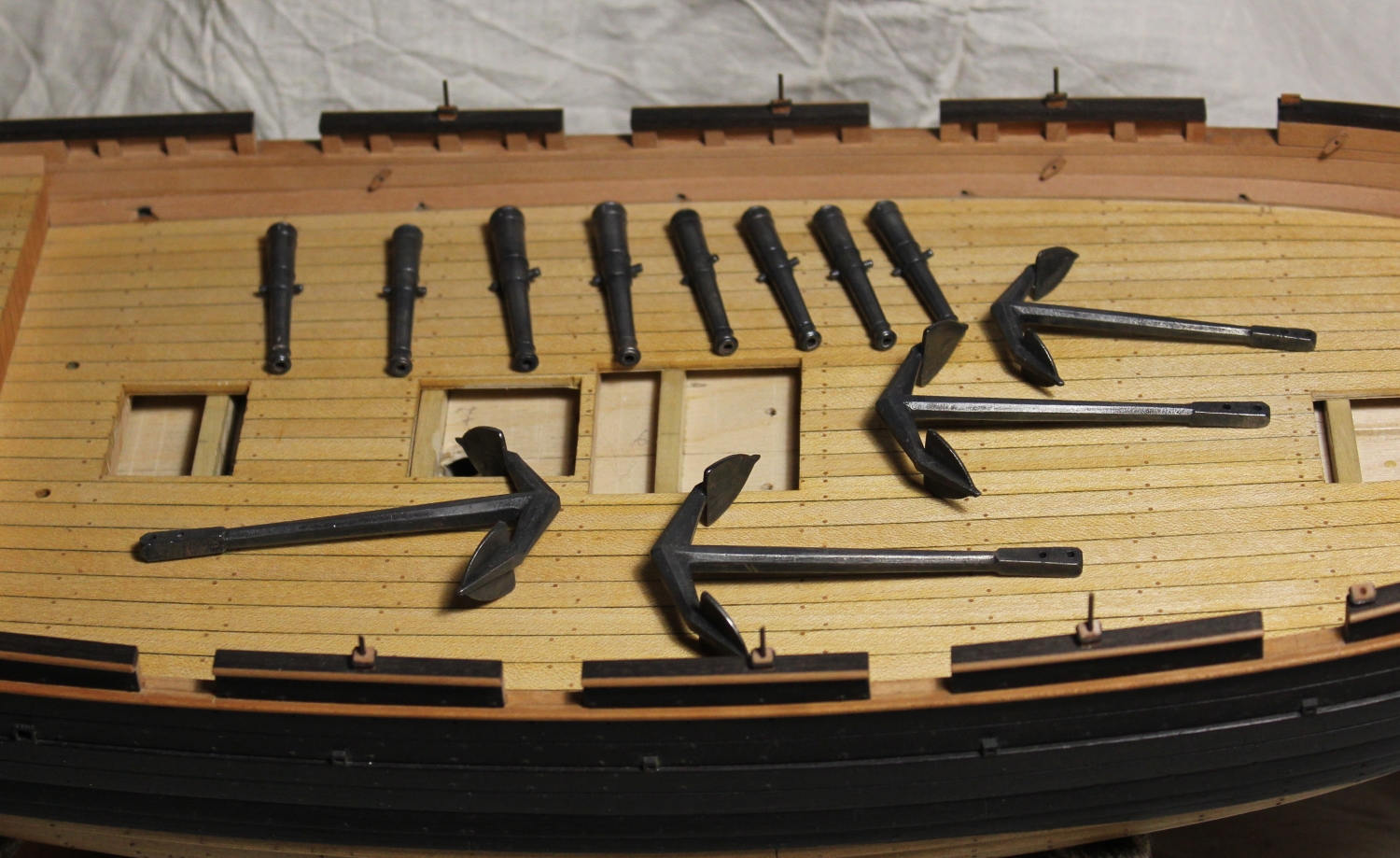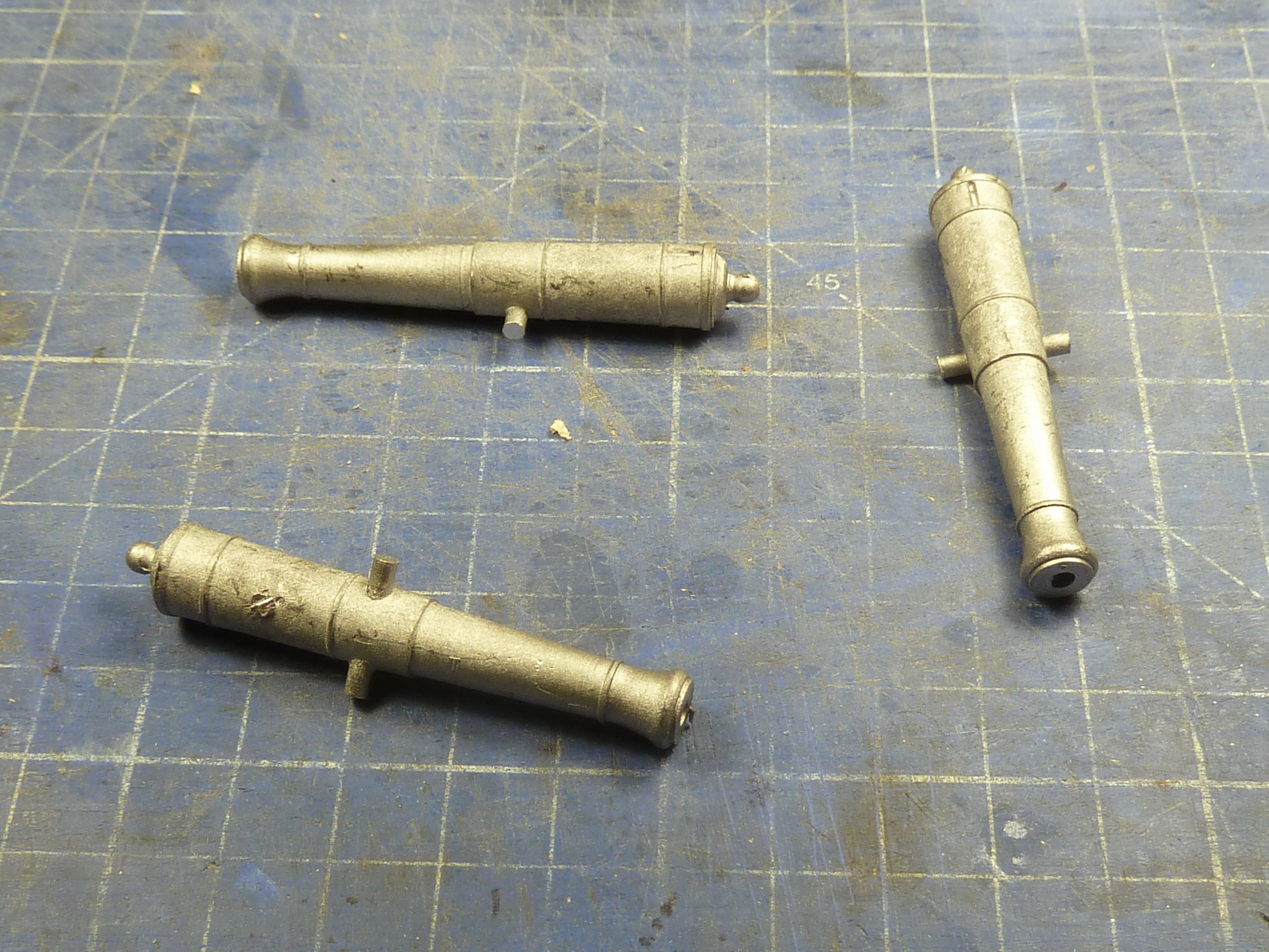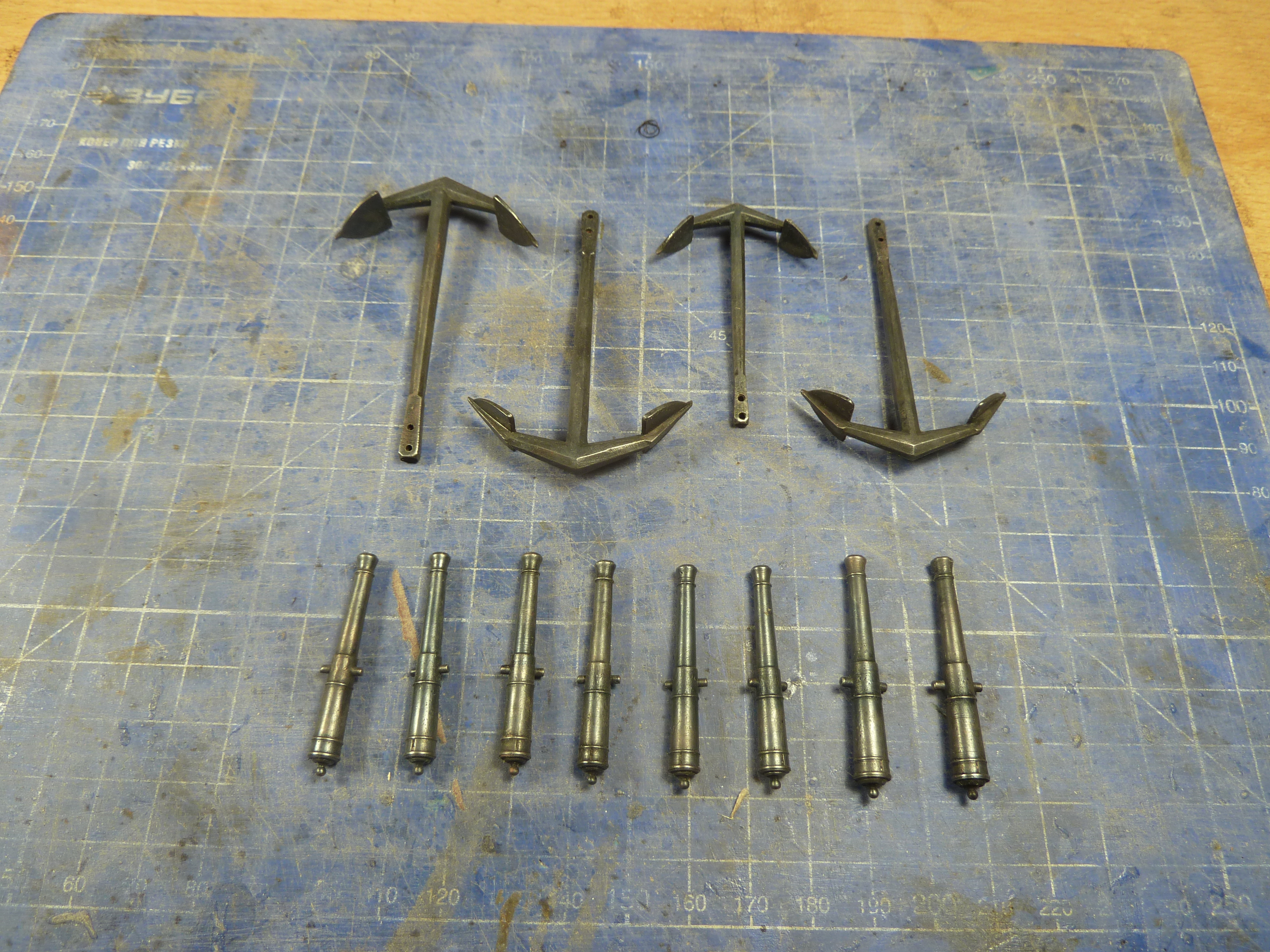 И орудия и якоря конечно лишь отдаленно напоминают настоящие. Сплав похож на тот которым я пользуюсь, должен омедниться, хотя гарантии нет никакой. А где цапфы на карронадах? Если это оловянный сплав то просверлить качественно под них проблематично . Может проще вновь нормальные заказать? Чертежик подберу подходящий.