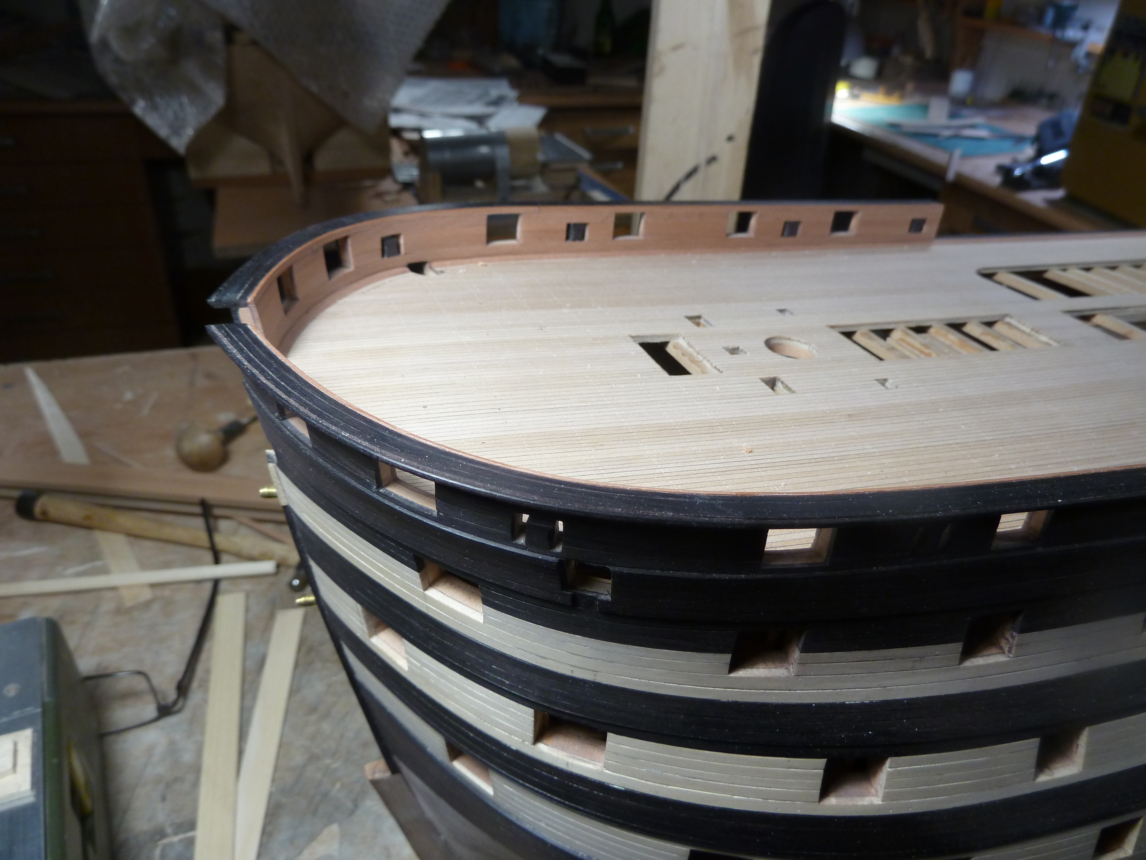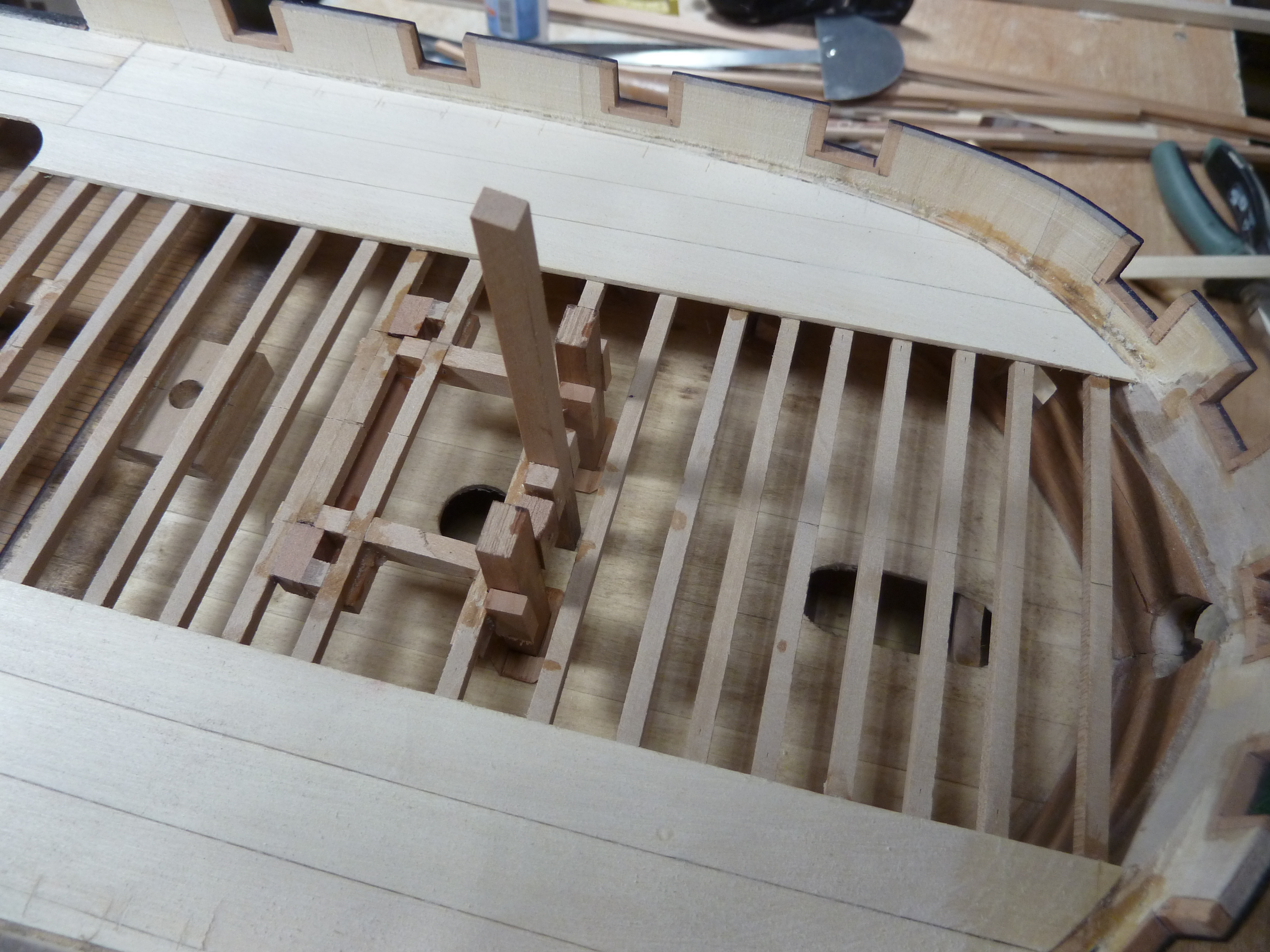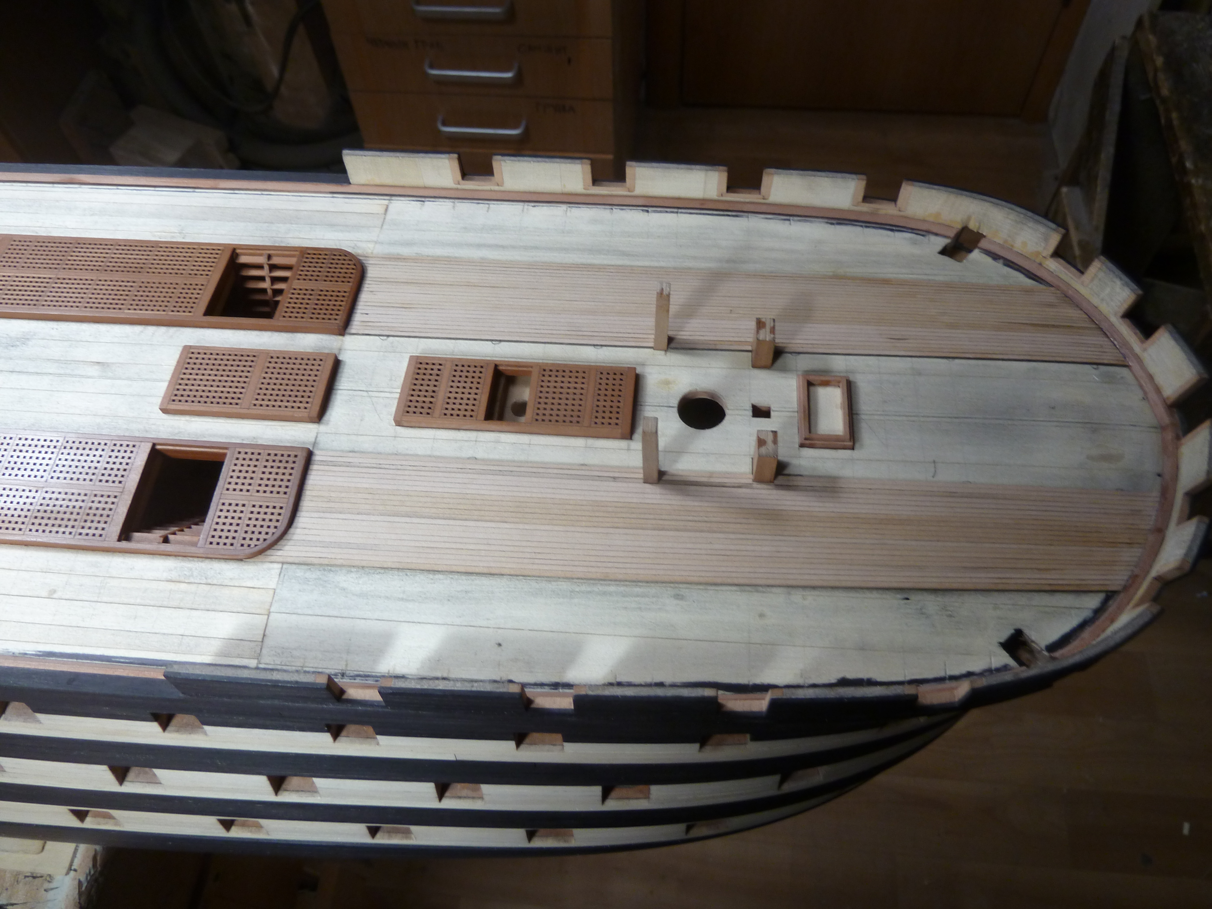 На данный момент занимаюсь внутренностями модели. В несколько упрощенном виде оснащены гондек, мидельдек, опердек. Квартердек в процессе настила черновой палубы. На этой модели решил отойти от своей традиционной технологии настила реек палубы прямо на бимсы. Причина в слишком узких досках палубы, порядка 1,5 - 2 мм. Решил клеить тонкие рейки палубы на основу из липы. Да и разметку делать проще так.