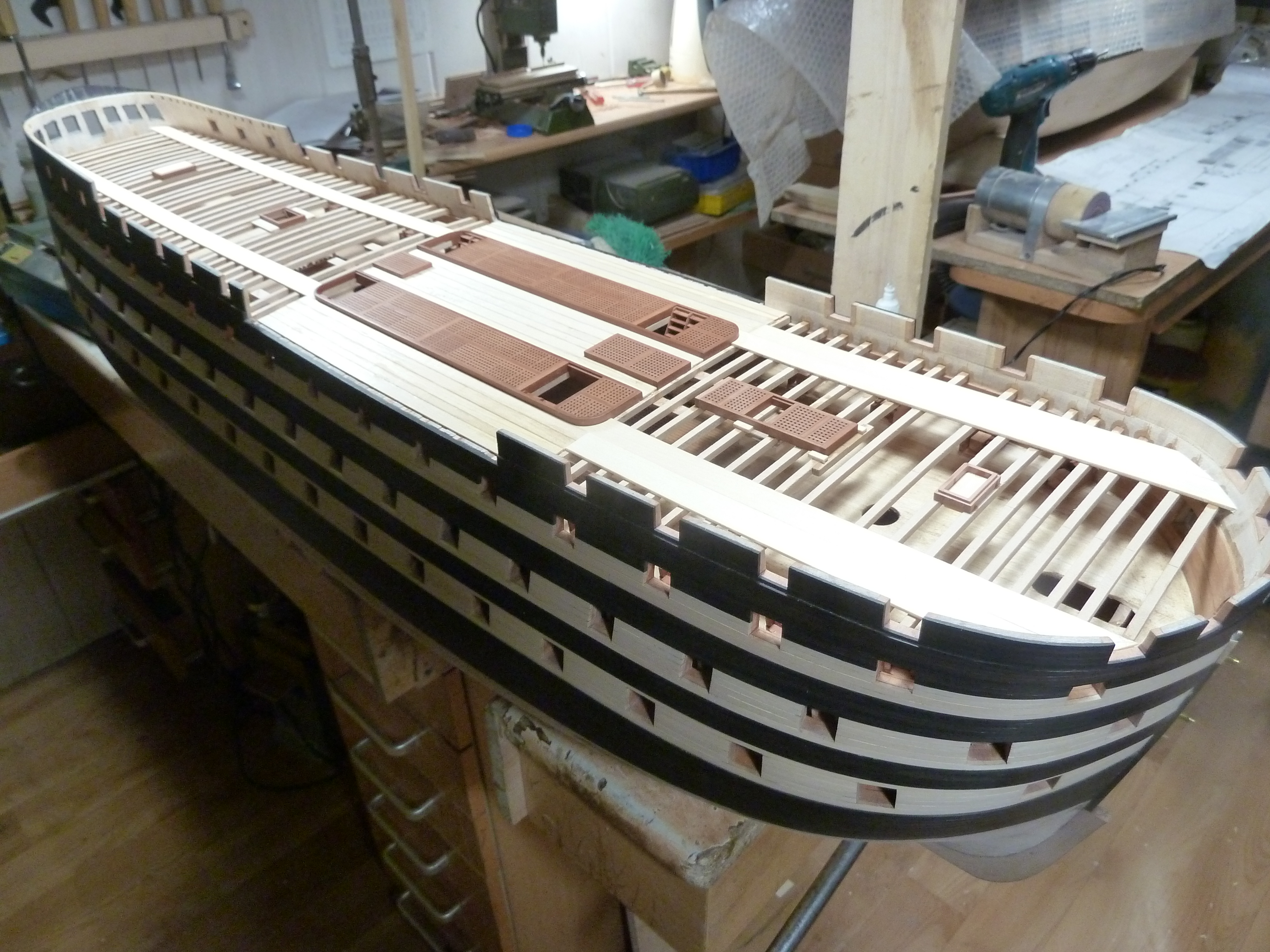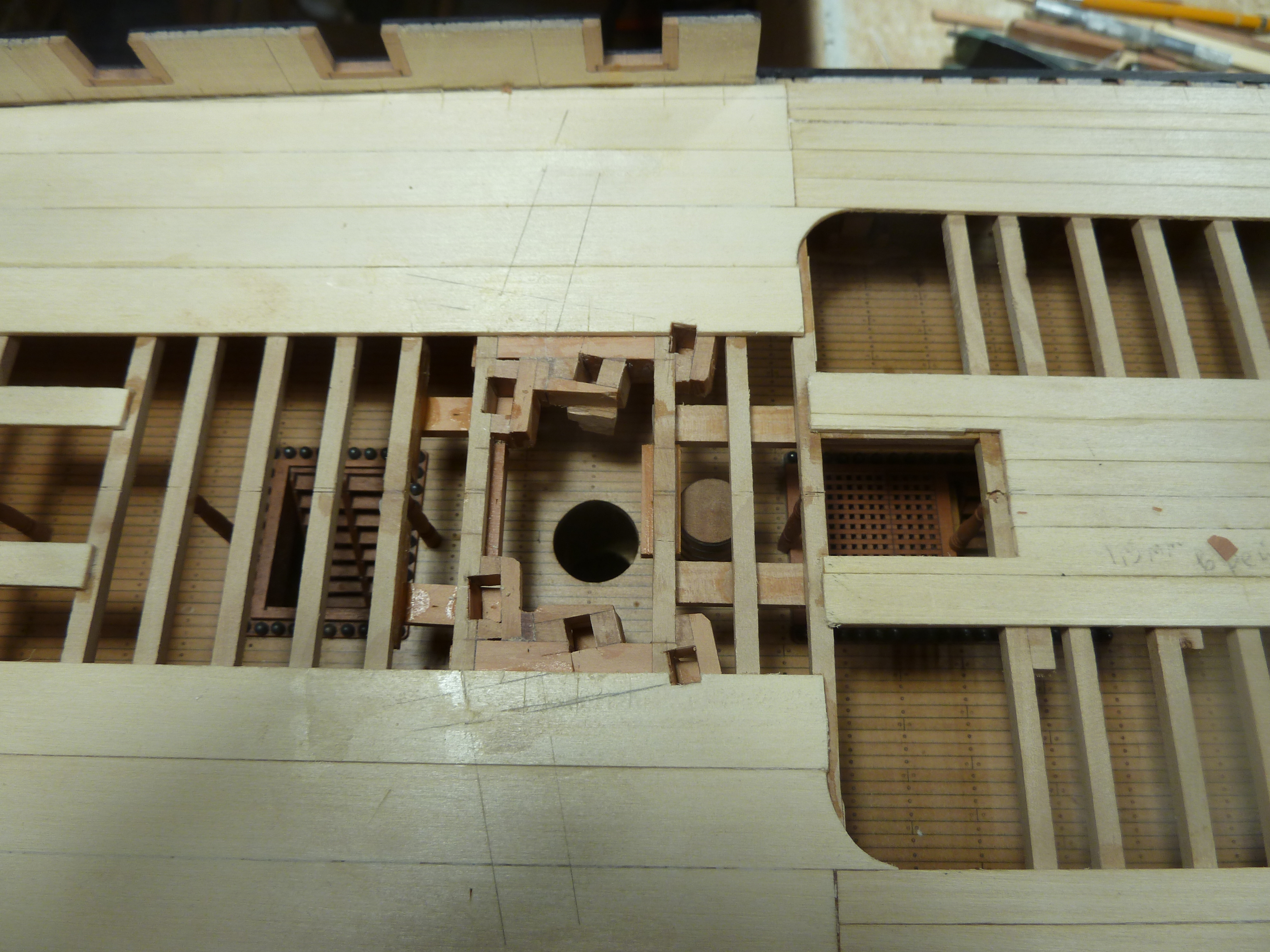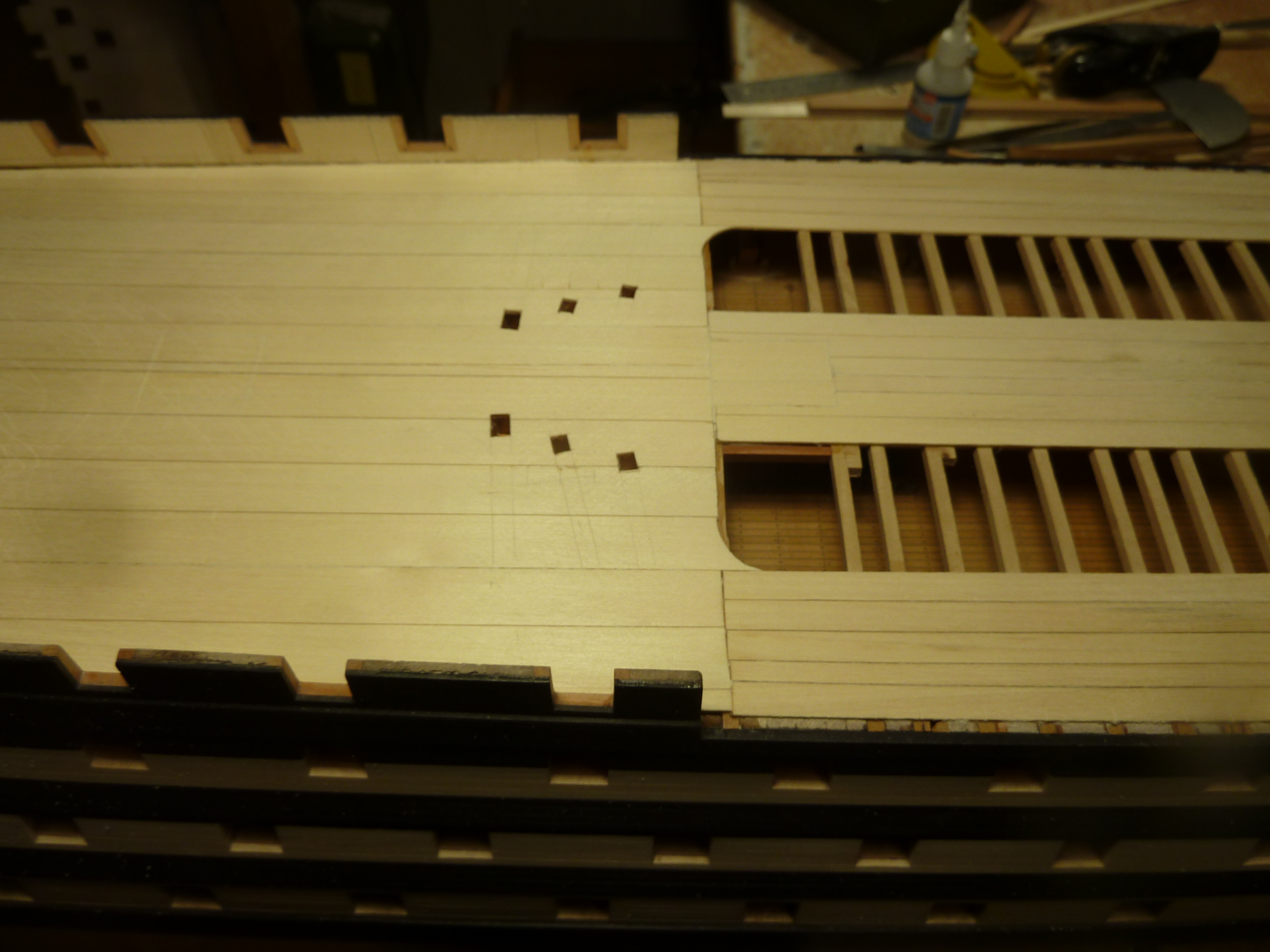 На данный момент занимаюсь внутренностями модели. В несколько упрощенном виде оснащены гондек, мидельдек, опердек. Квартердек в процессе настила черновой палубы. На этой модели решил отойти от своей традиционной технологии настила реек палубы прямо на бимсы. Причина в слишком узких досках палубы, порядка 1,5 - 2 мм. Решил клеить тонкие рейки палубы на основу из липы. Да и разметку делать проще так.