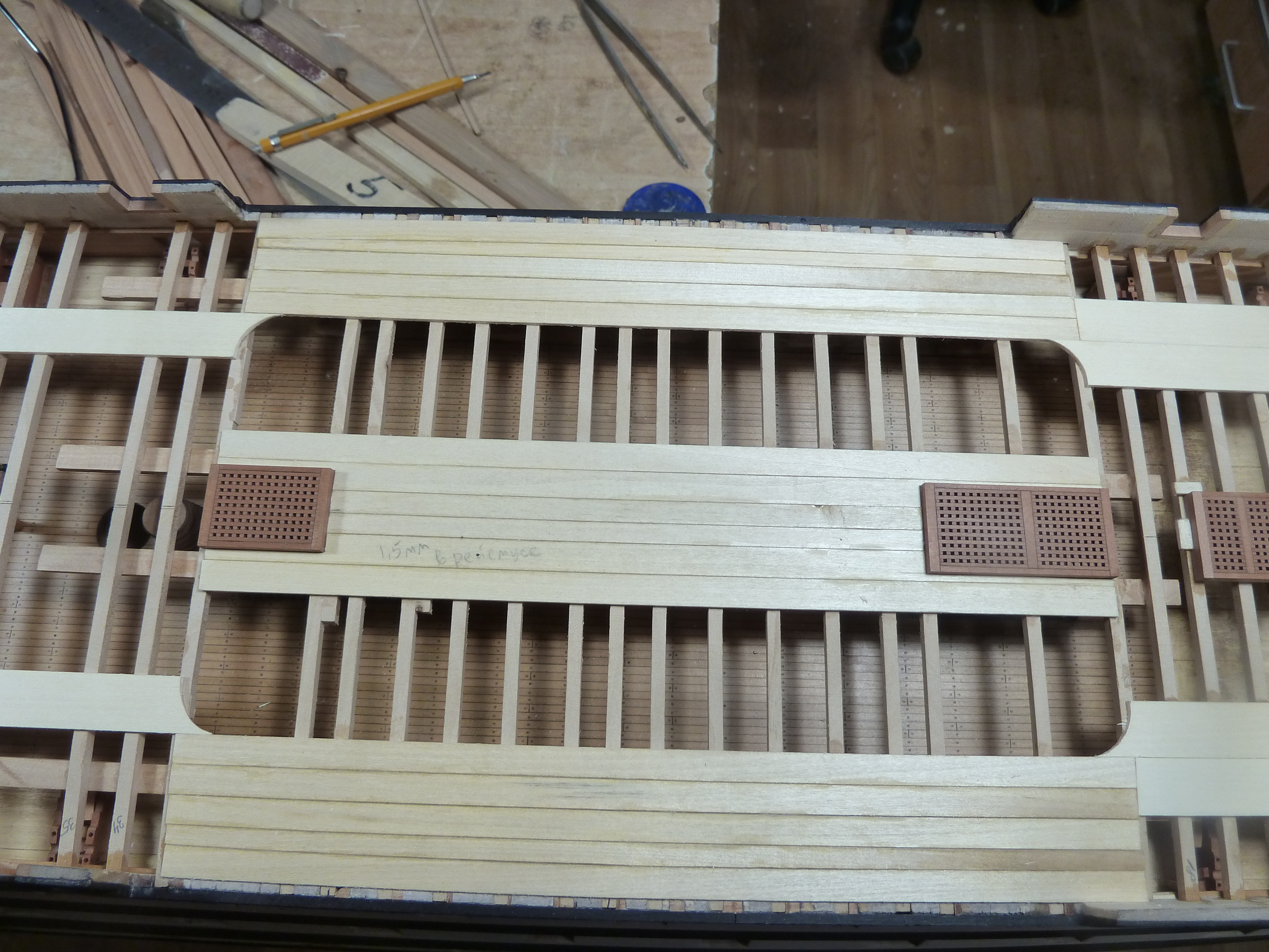 Добрый вечер коллеги! Продолжаю строительство модели. Настелил палубу квартердека - бака и юта. Палубы двуслойные. На бимсы клеил рейку липы толщиной 1,5 мм затем грушу толщиной 0,8 мм. Рейки узкие около 1,7 мм шириной, поэтому решил отказаться от фасок. Сделал по старинке, Закрасил одну сторону реек мягким карандашом 8В. Нагелевание имитировал специально заточенной иглой шприца. Такой способ с точки зрения достоверности даже копийнее, ведь настоящая палуба имела пробки слои которых совпадали с досками.